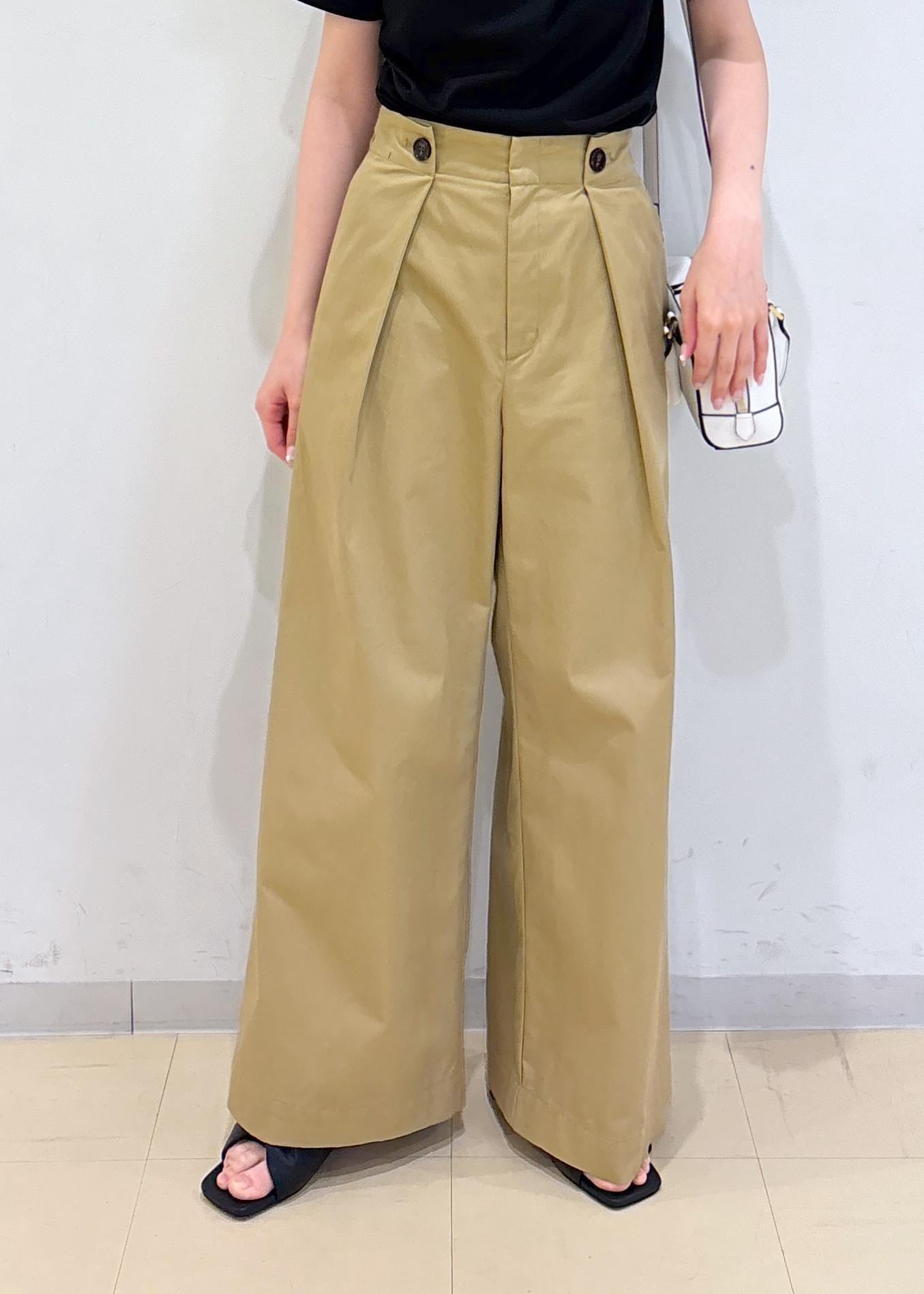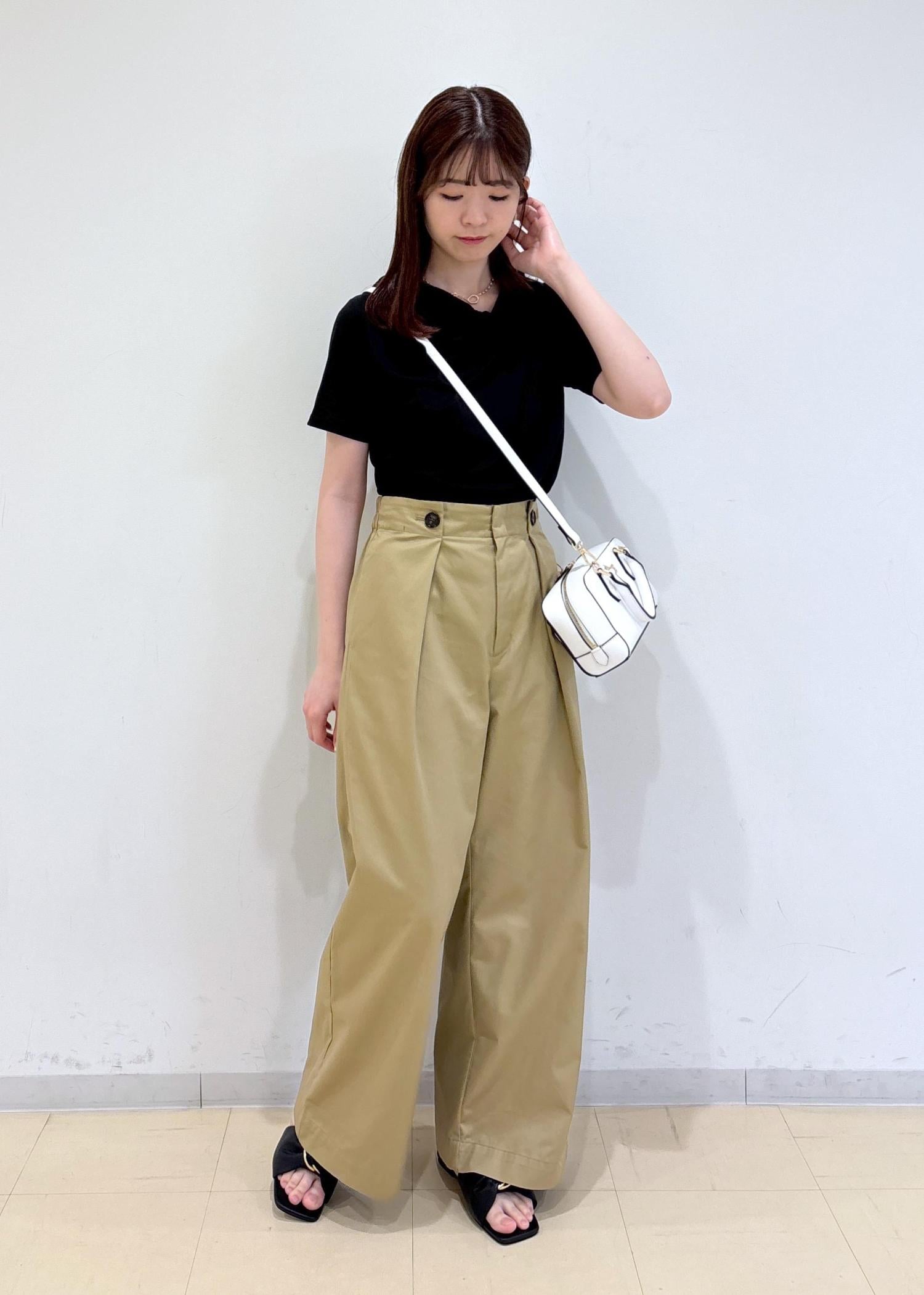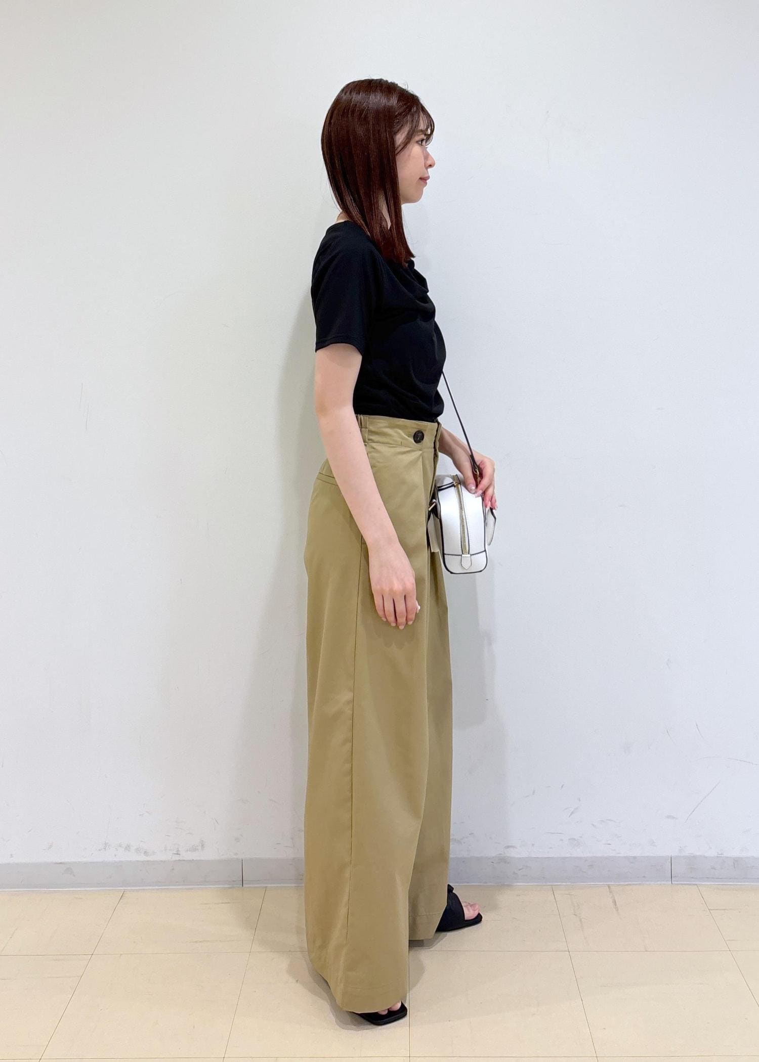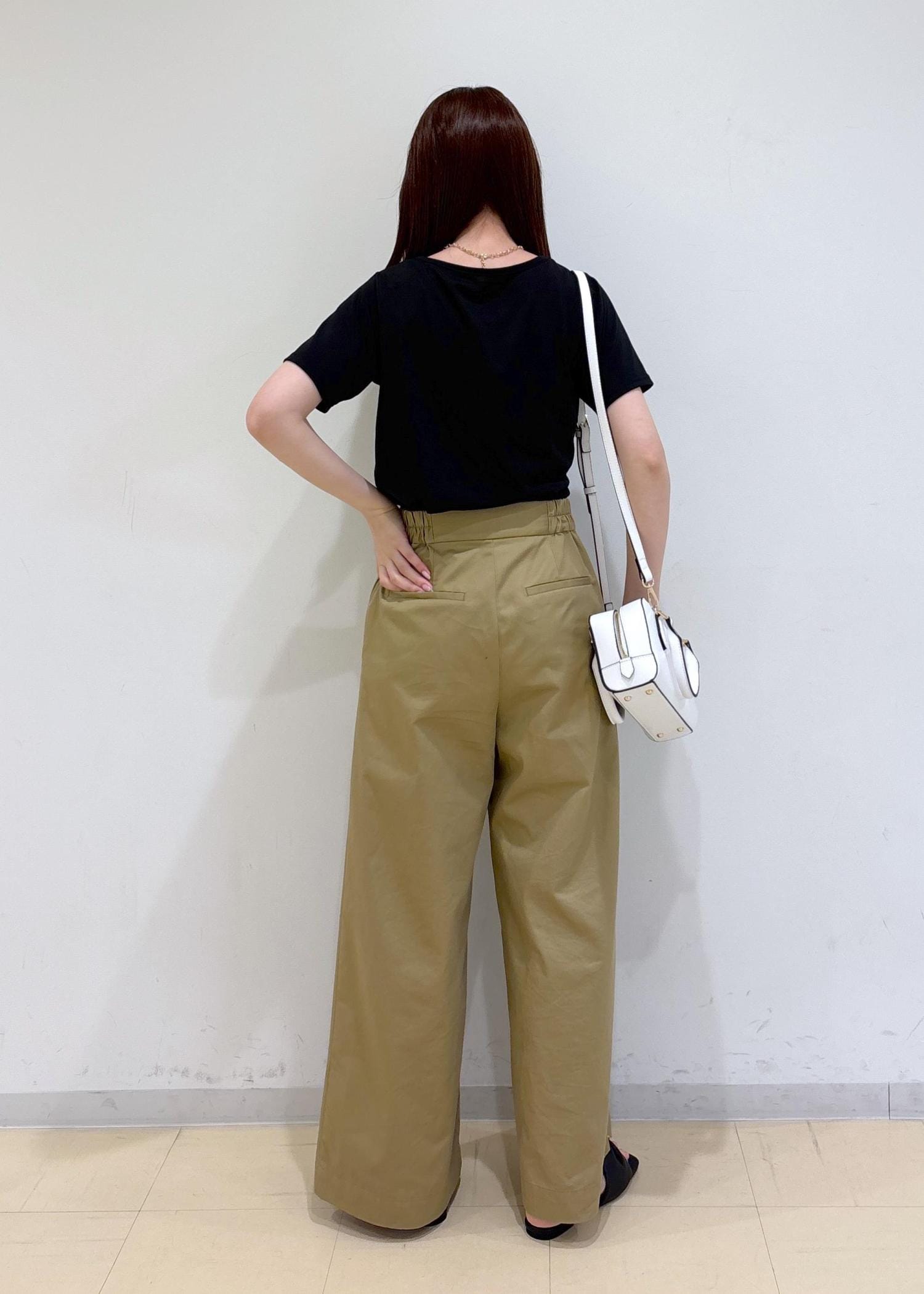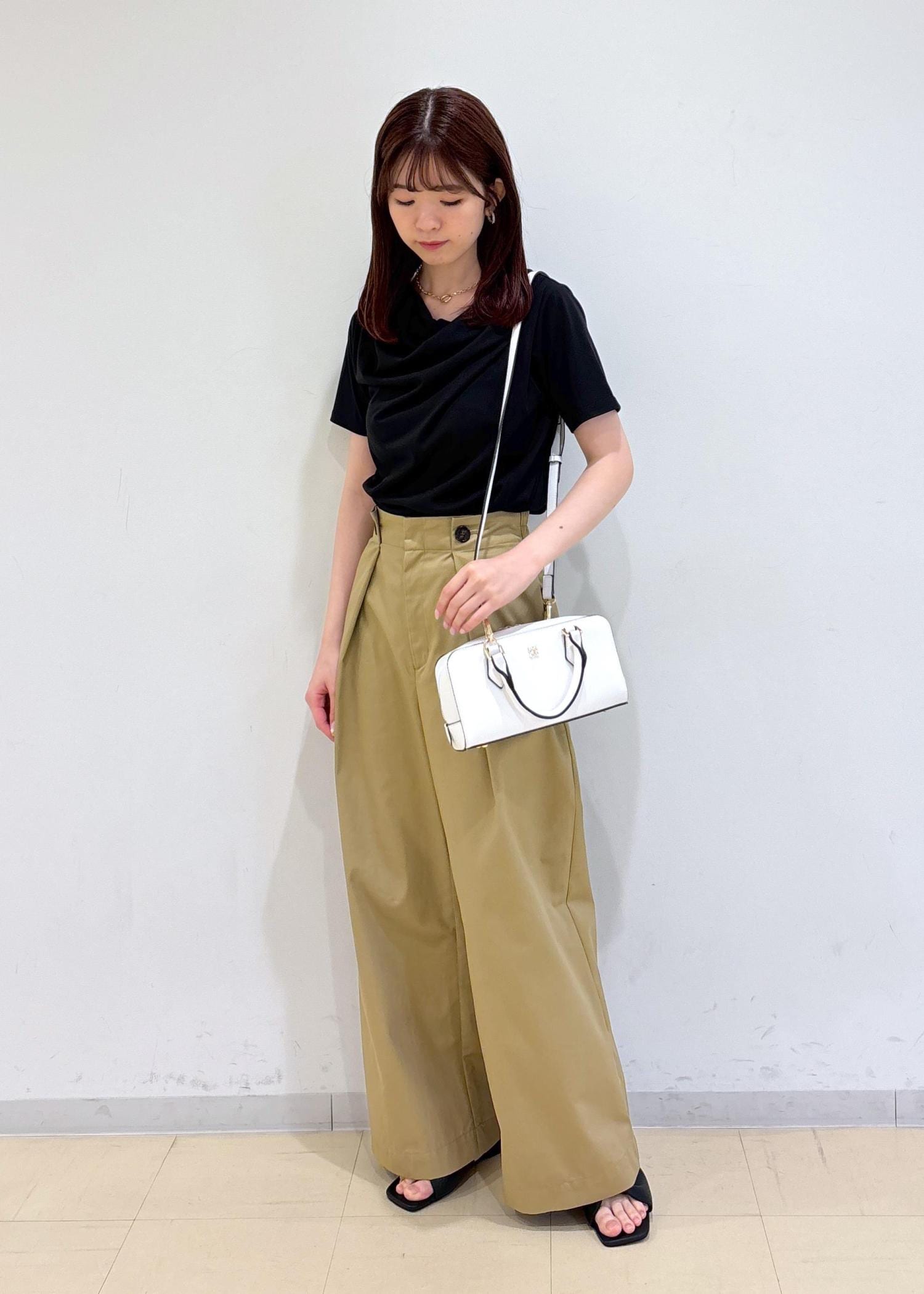 トップスはクシュっとしたドレープデザインが映える1枚です。バギーパンツのシルエットが綺麗で体型カバーが叶います!