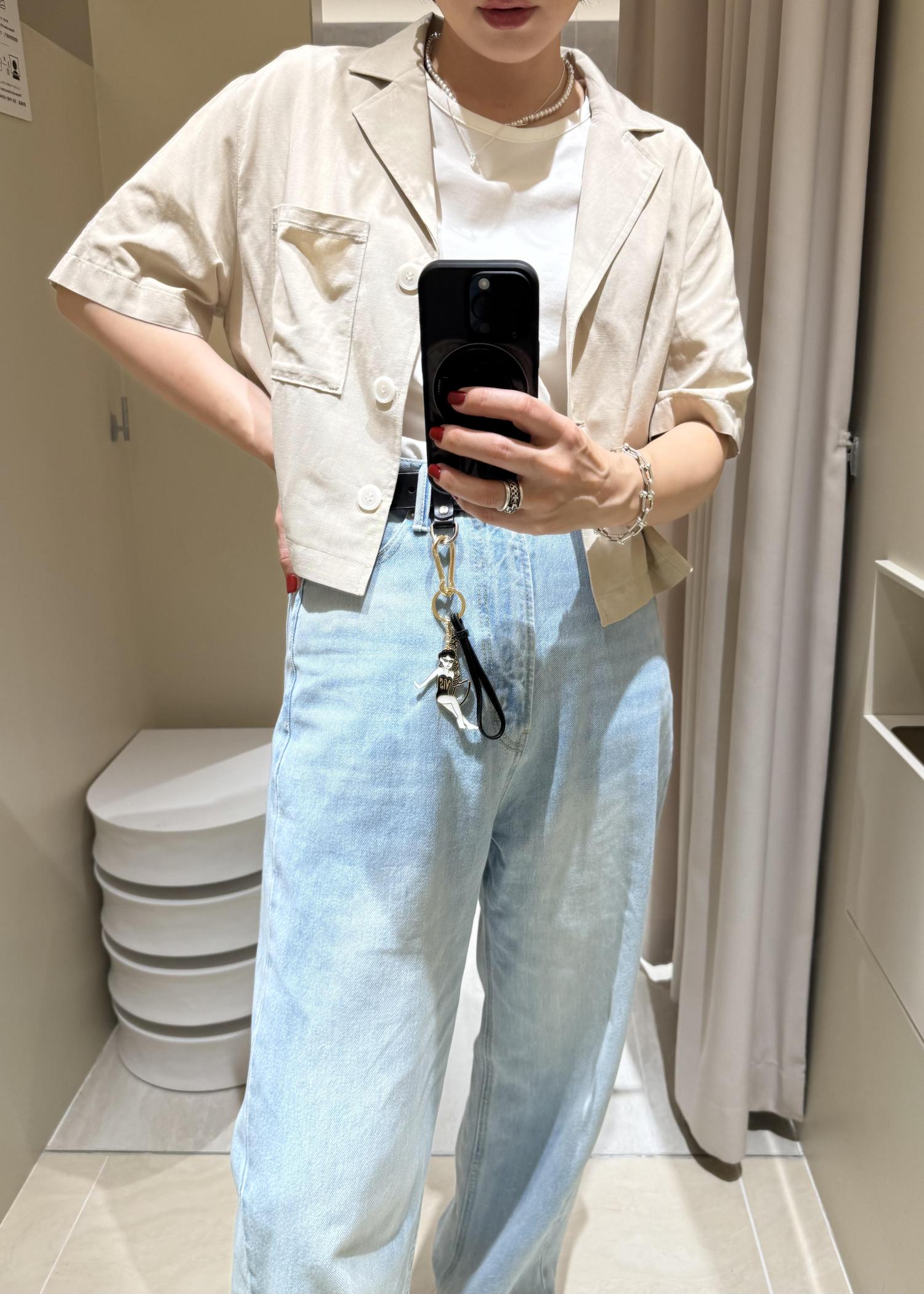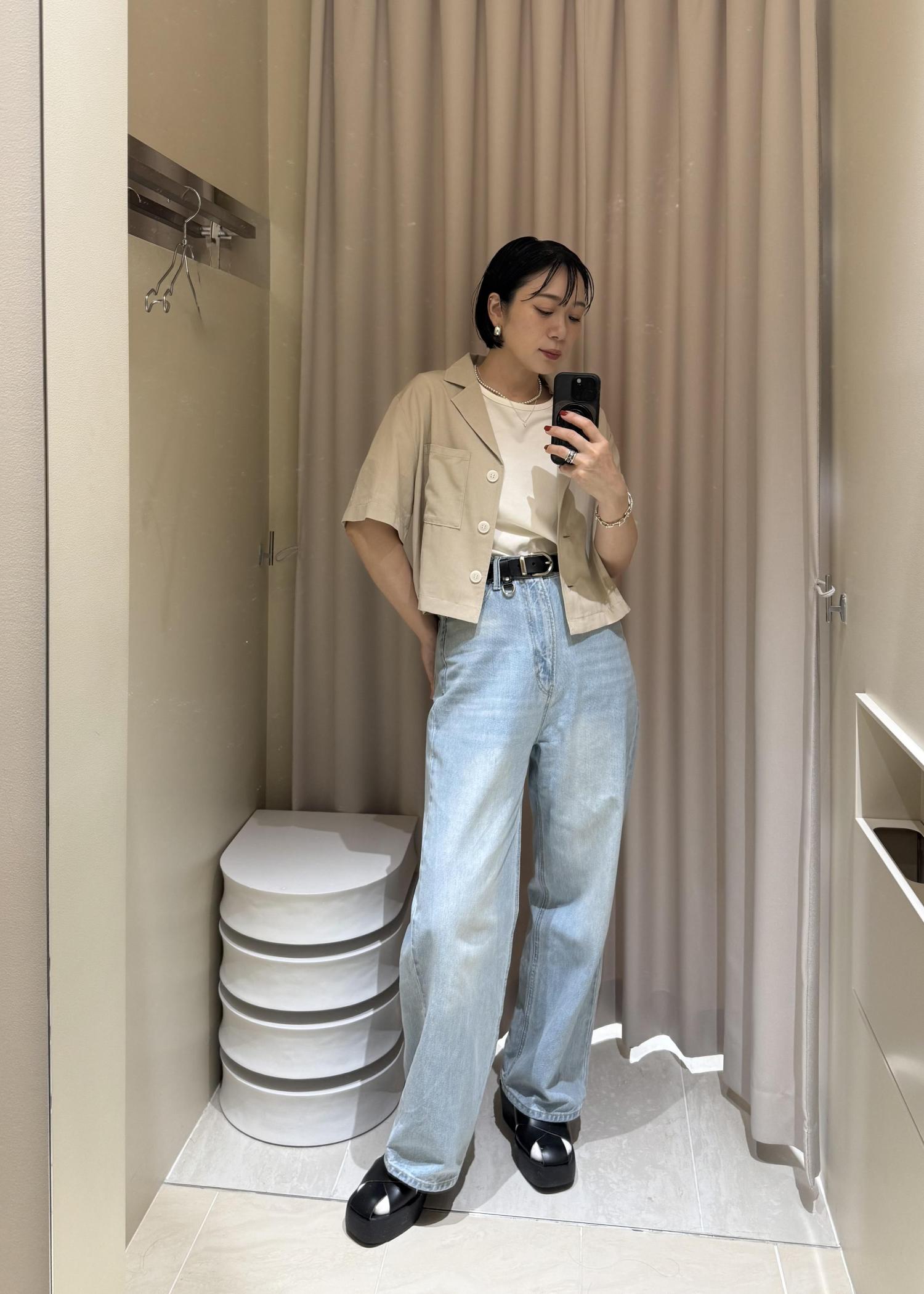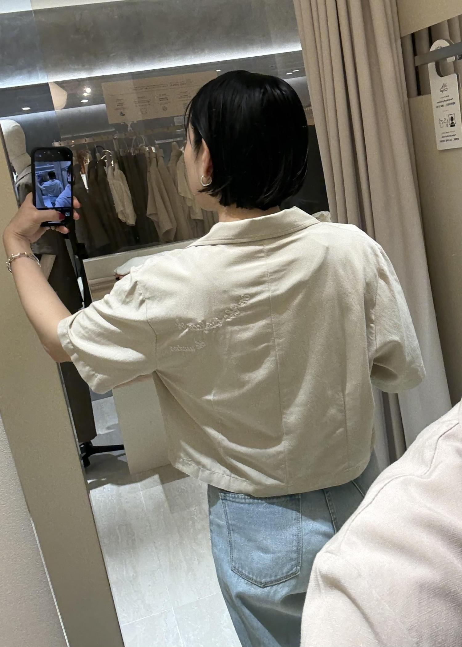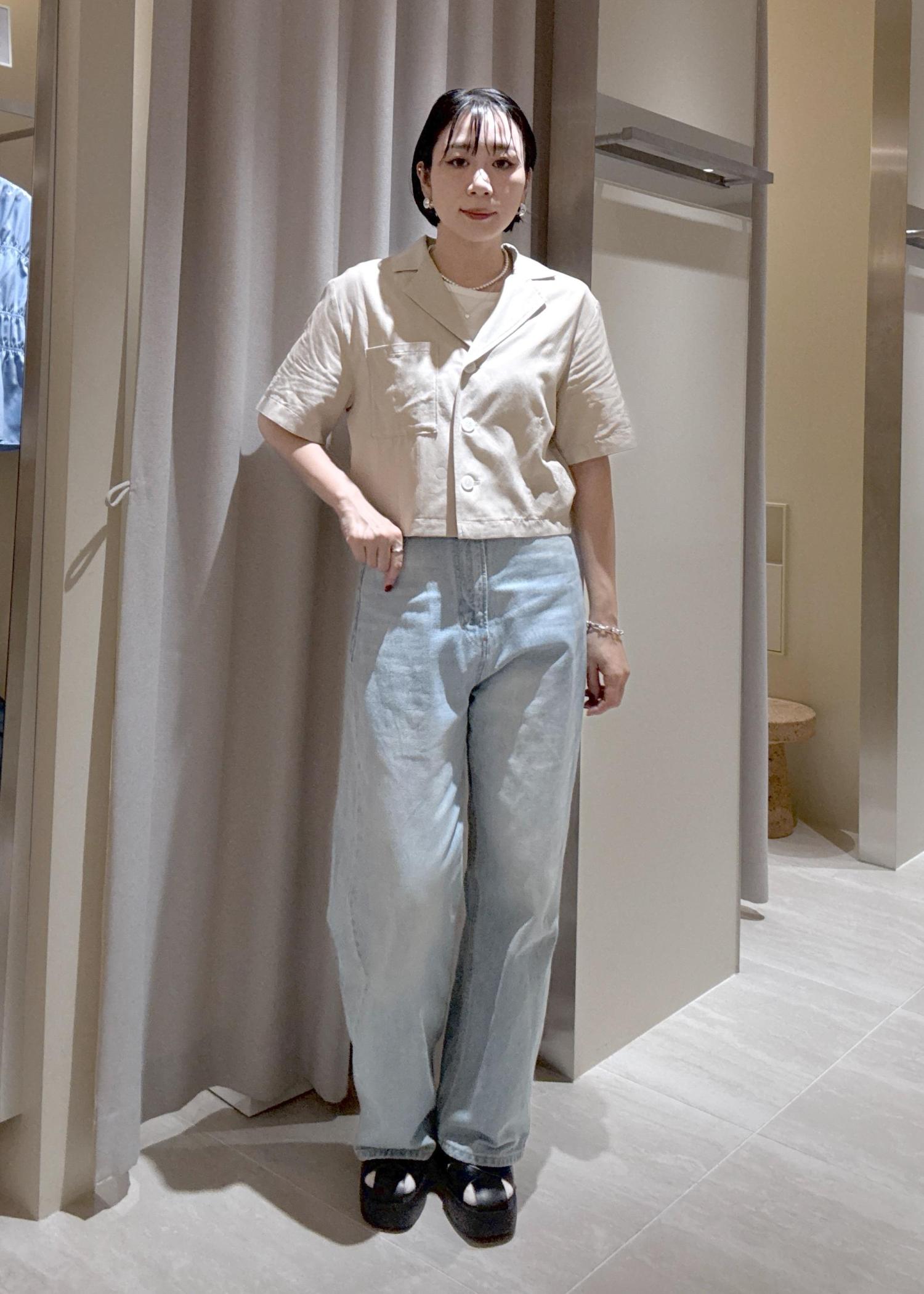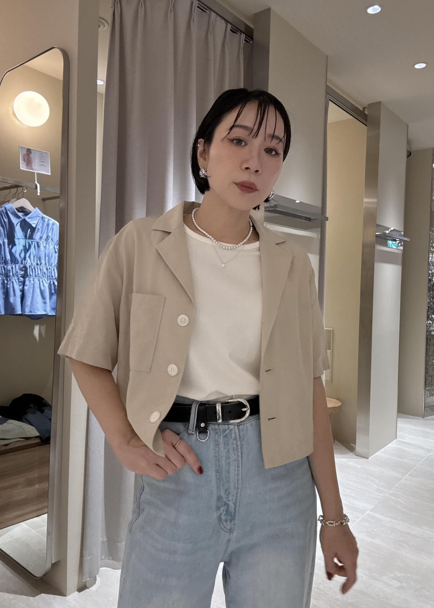 ベージュのシャツに同じカラーの刺繍が施された、夏らしいシャツはスタイルアップが叶う着丈感です!