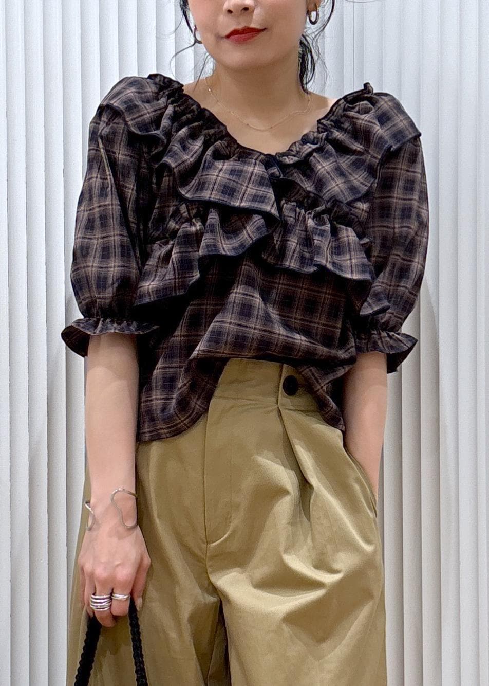 しっかりフリルデザインが入っていますが、チェックの総柄なので私でも甘くなり過ぎる事なく着られましたよ♡