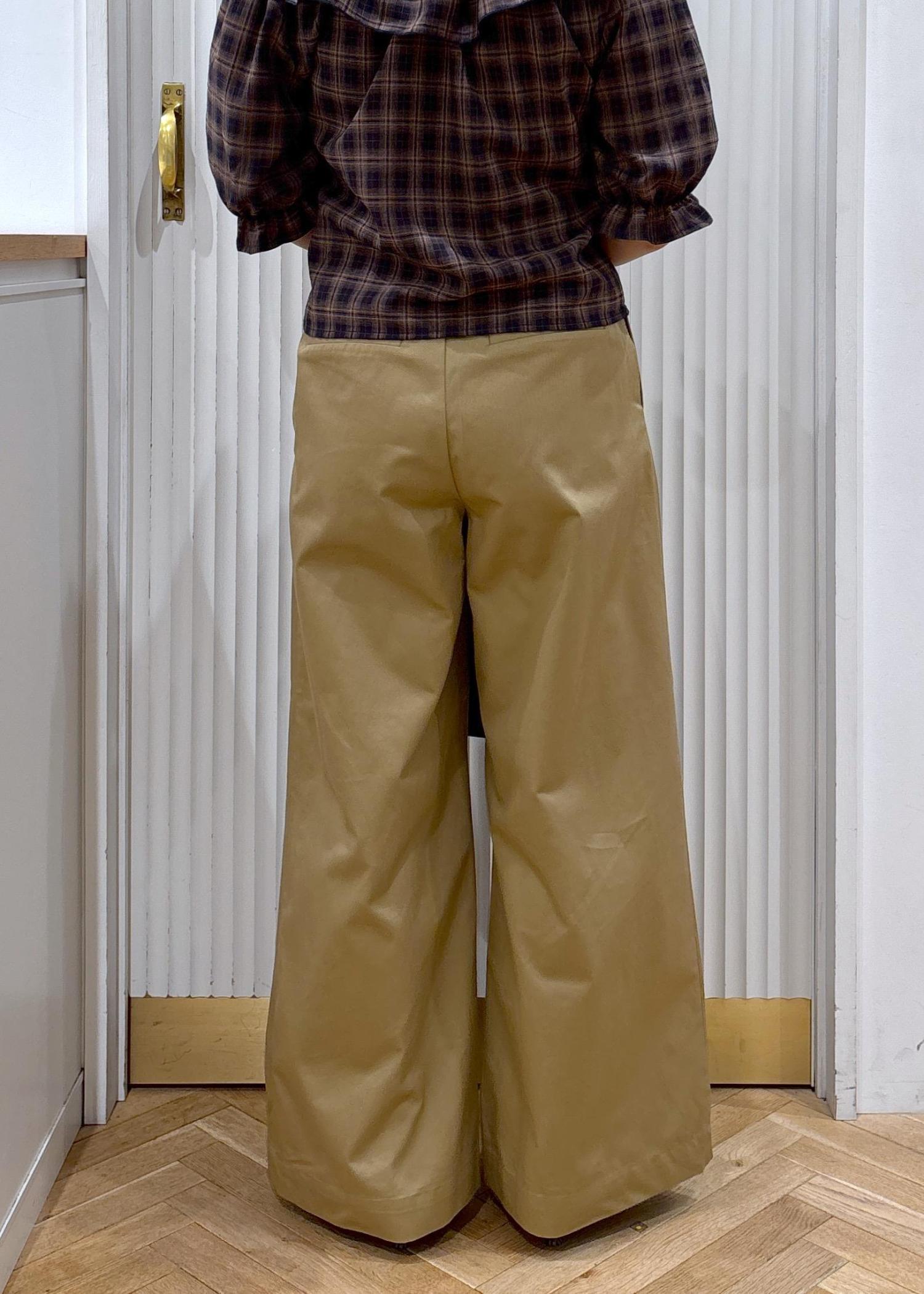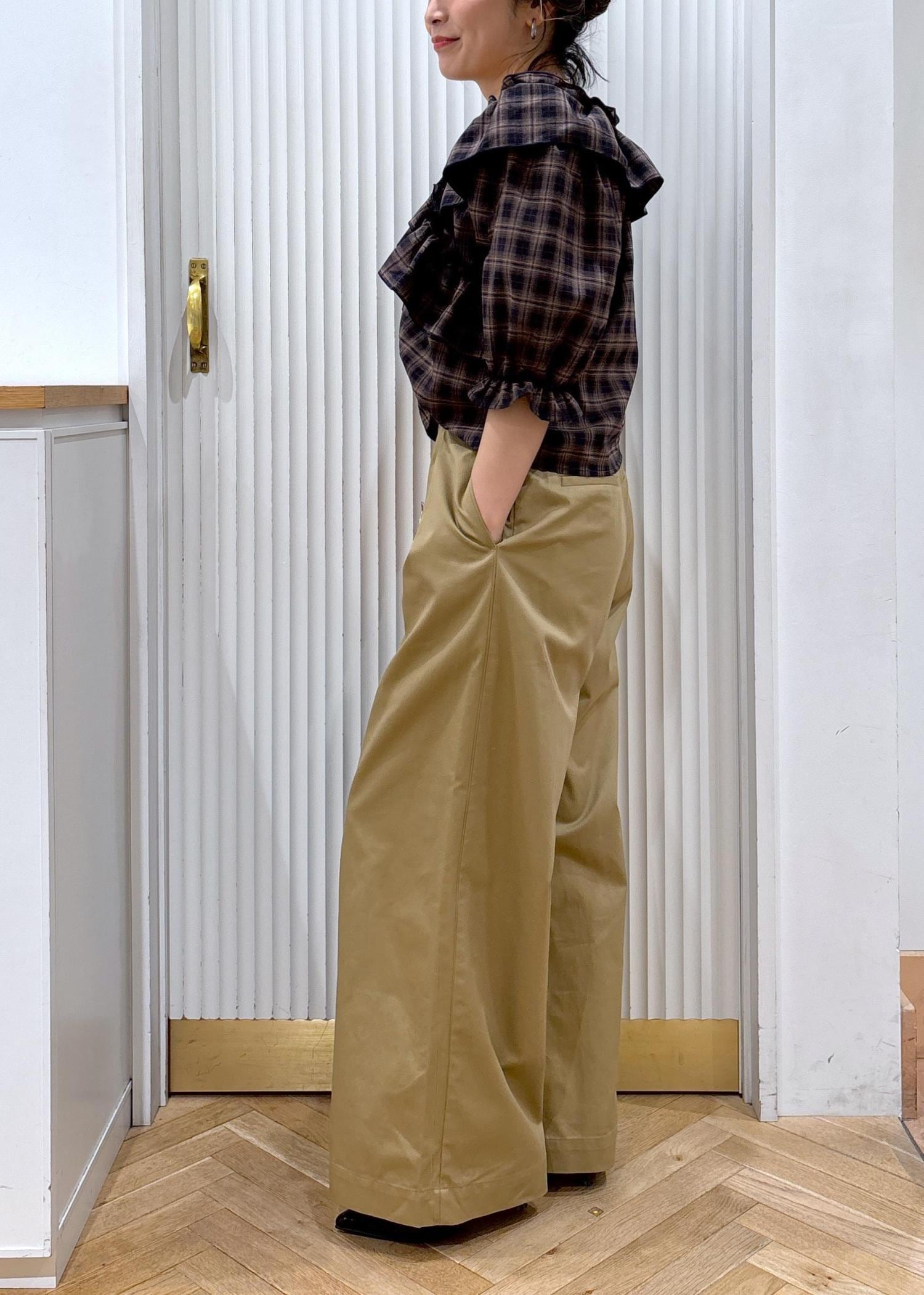157cm、Mサイズでややゆったりめの着用感でした。しっかり太めワイドのカジュアルなチノ。白はやや透け感あり。