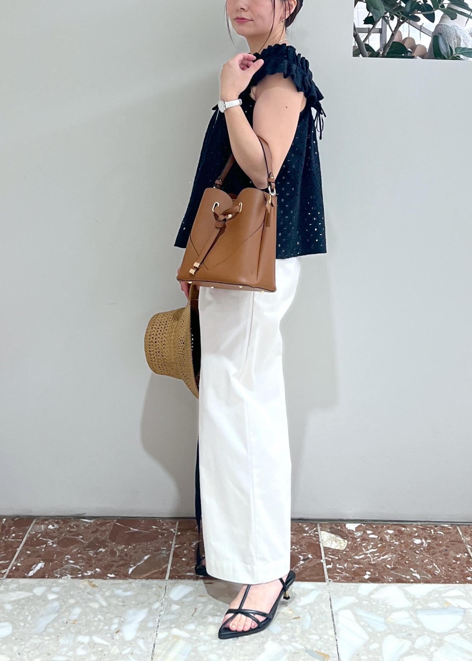 甘い雰囲気がありますが、デニムなどカジュアルはもちろん綺麗めなパンツとも相性が良い夏にピッタリのトップスです。