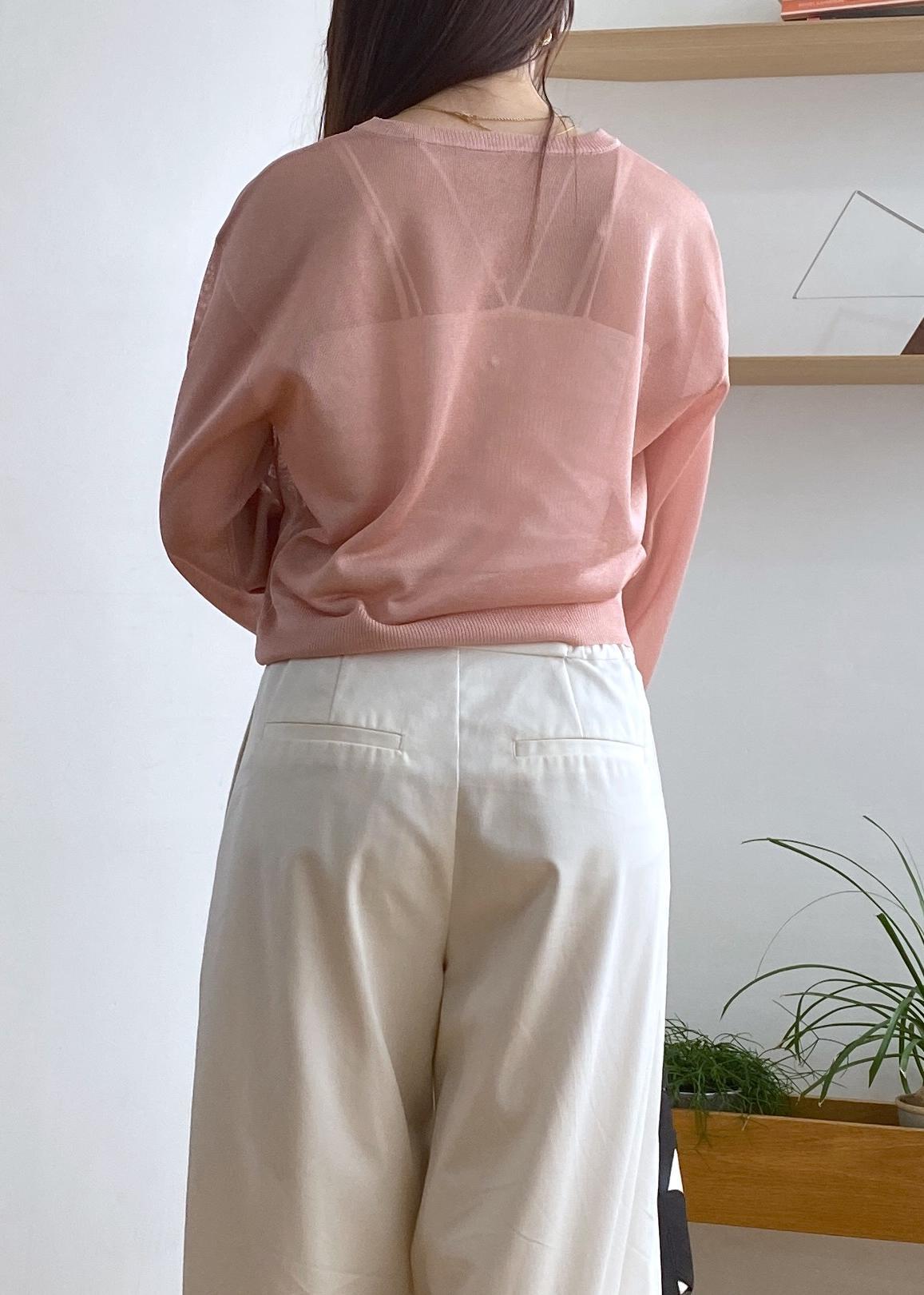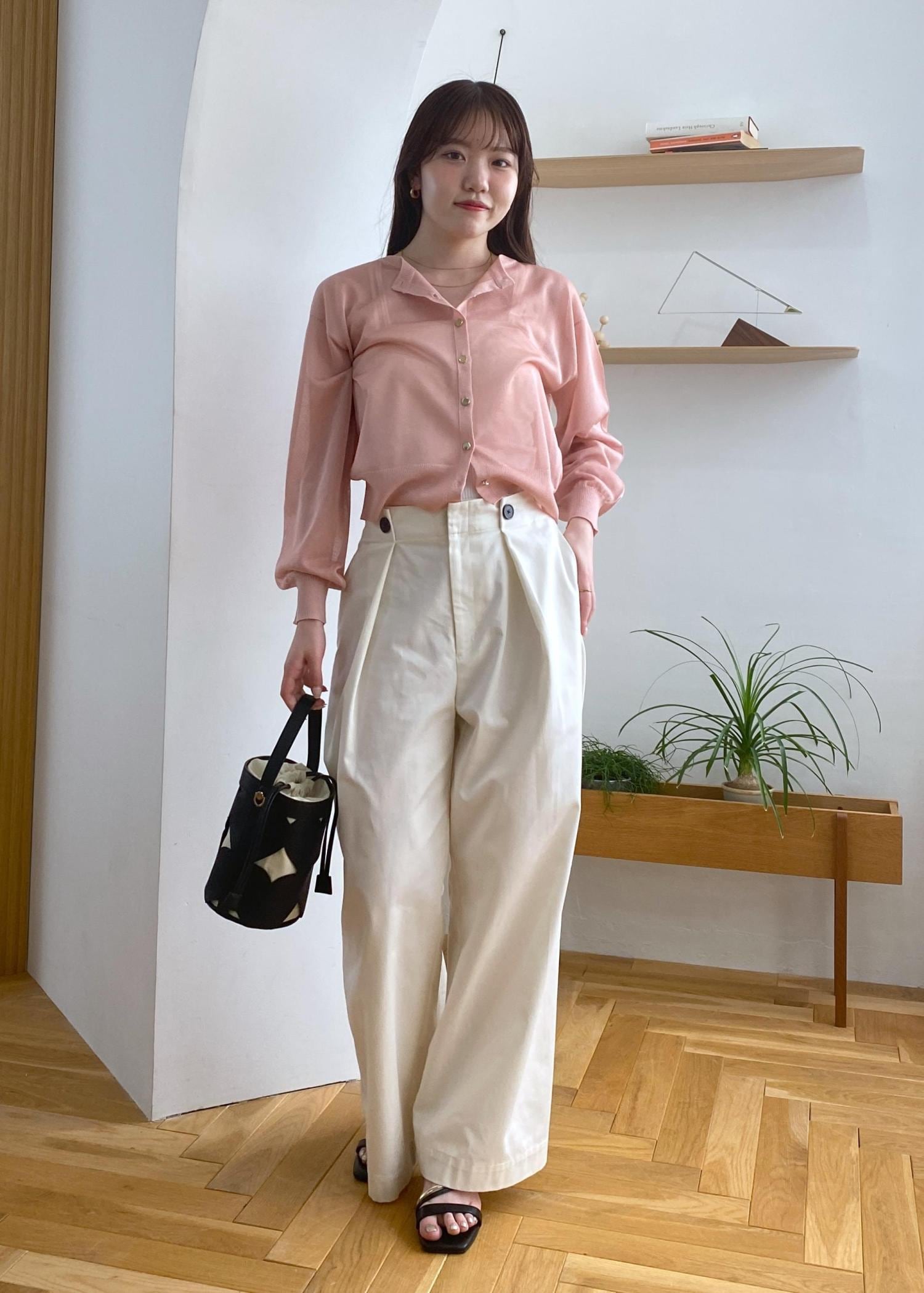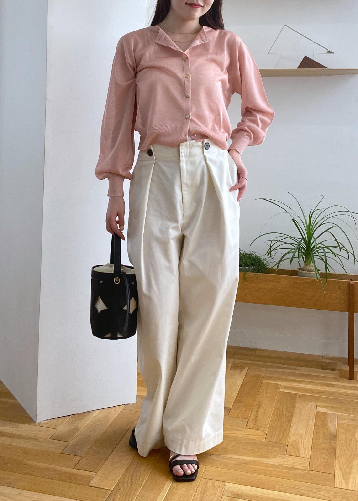 シアーカーディガンをメインに、ピンクカラーで女性らしさと抜け感ある大人パンツスタイルに!◎