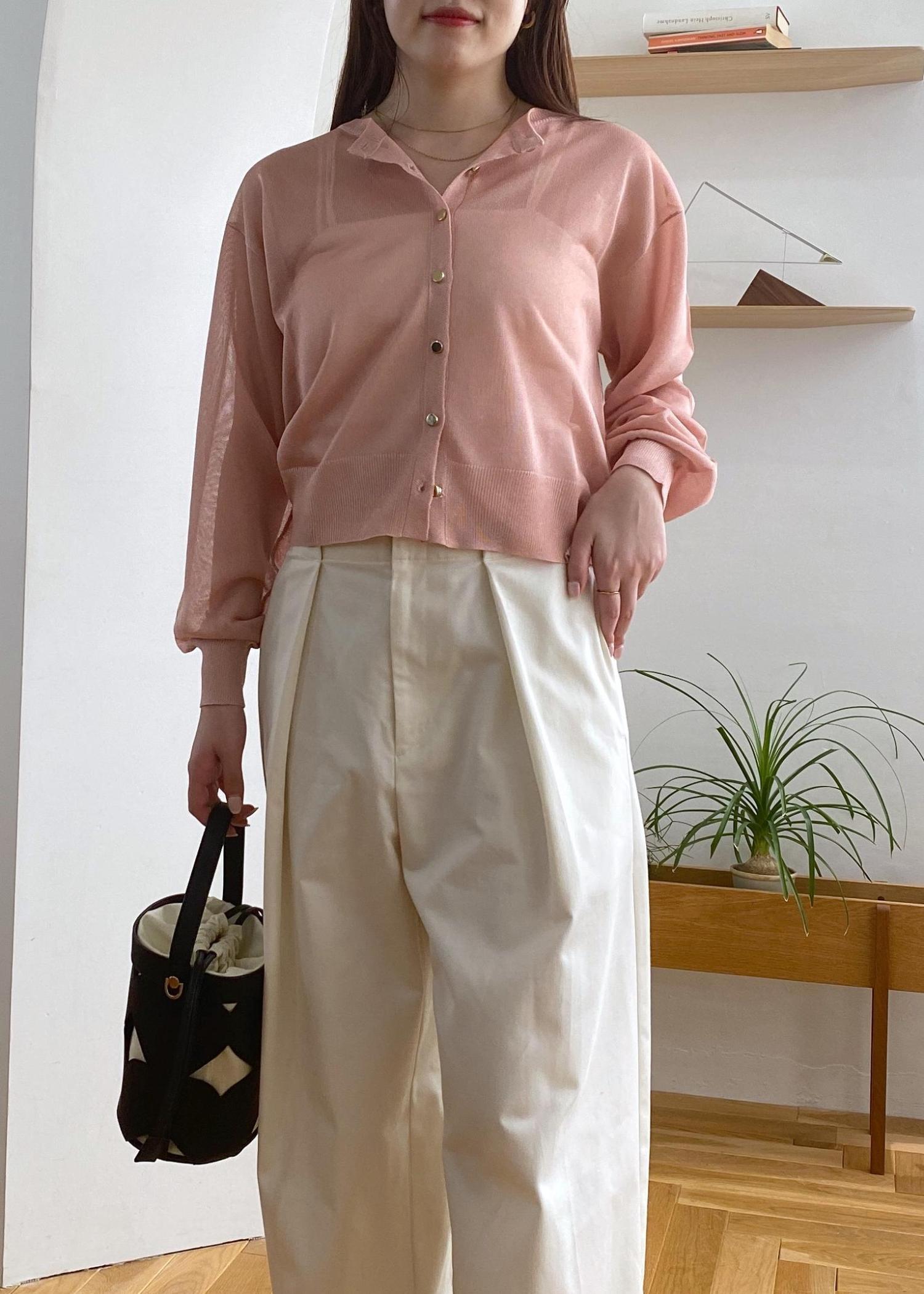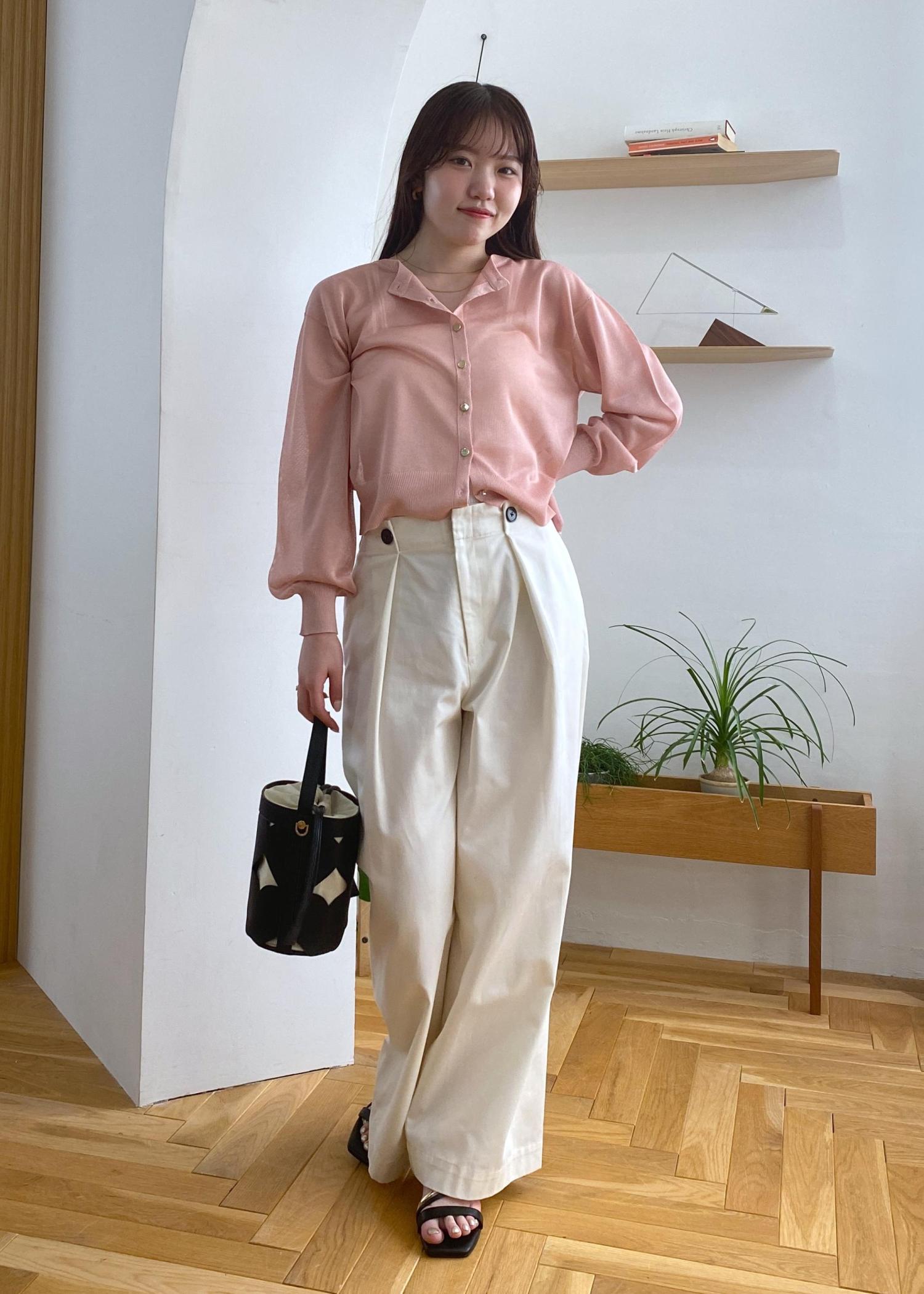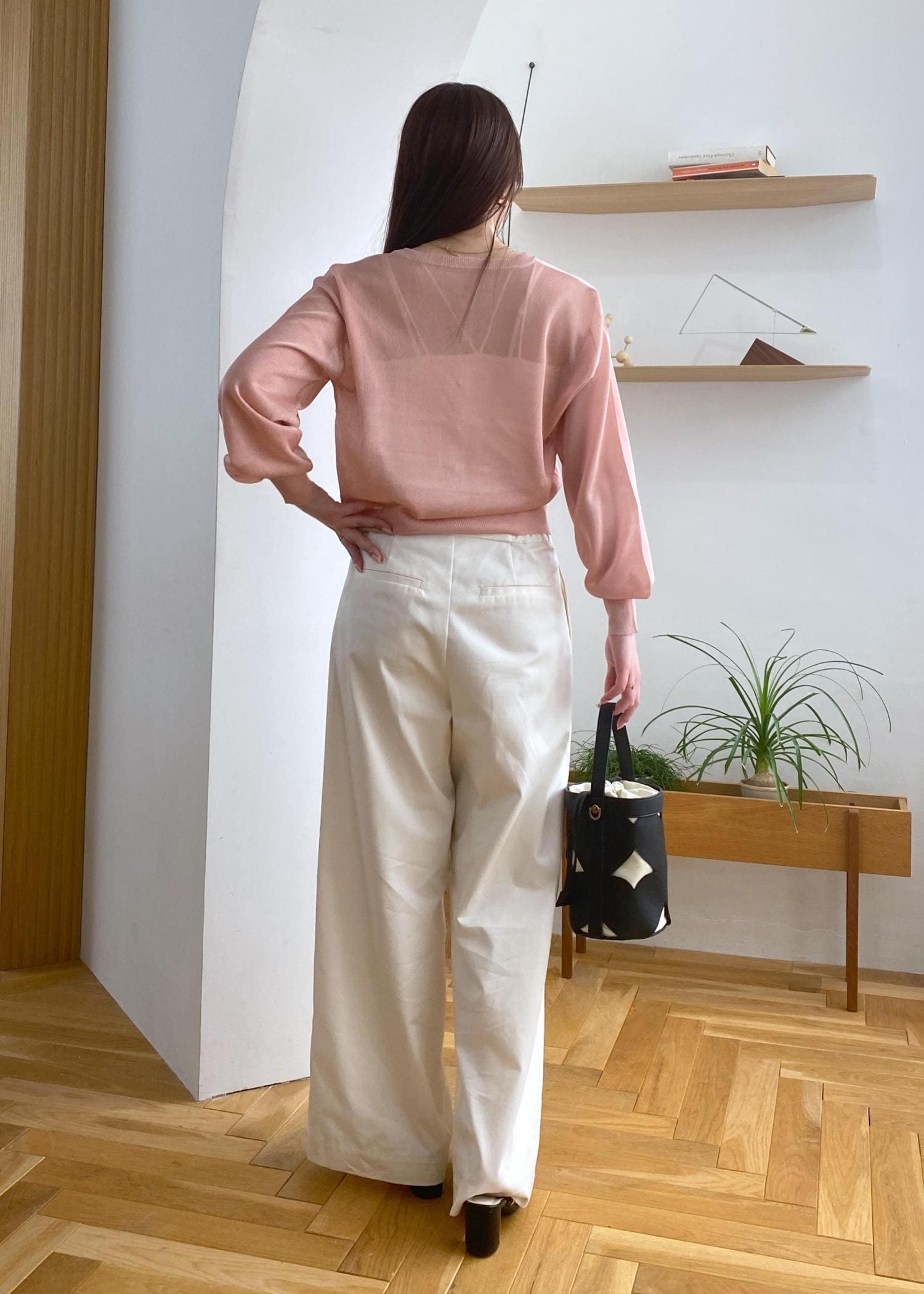 シアーカーディガンをメインに、ピンクカラーで女性らしさと抜け感ある大人パンツスタイルに!◎