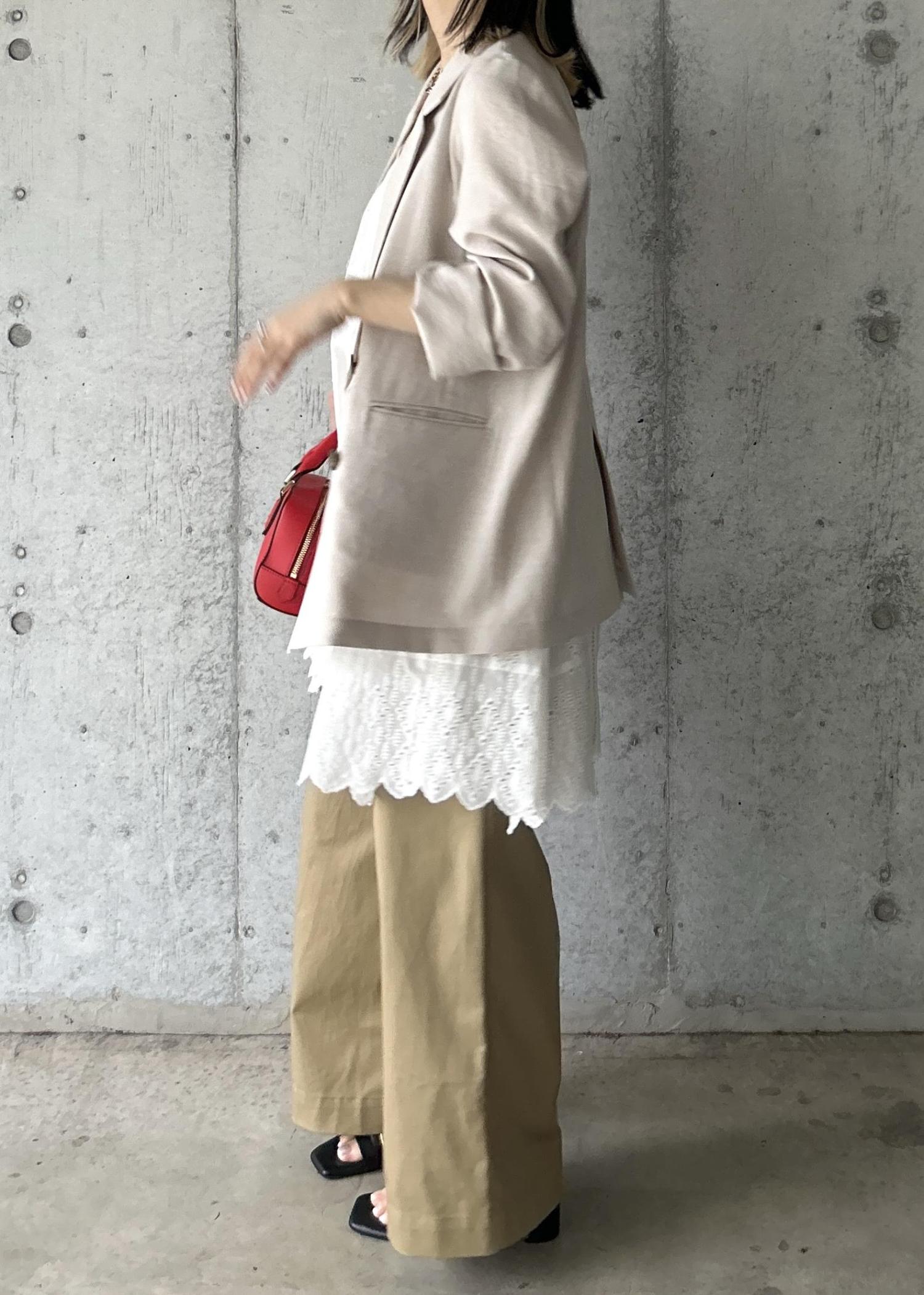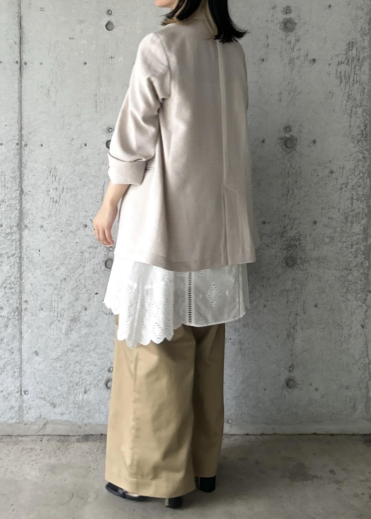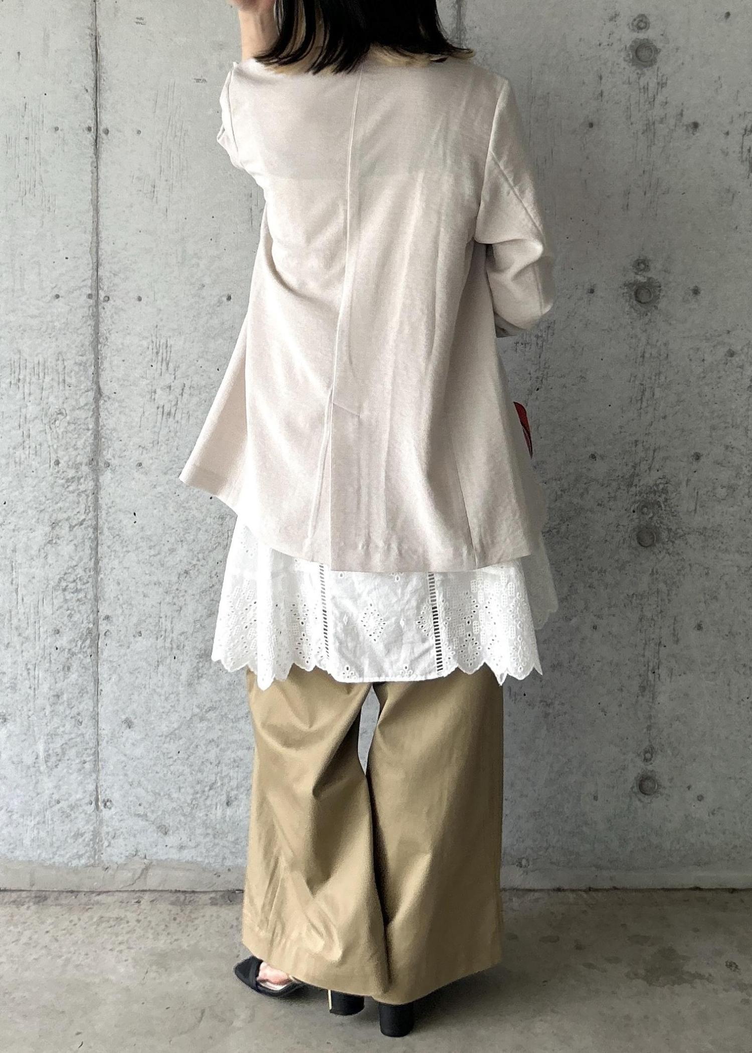 オフホワイトはインナーの色によっては透け感があるので、馴染みの良いベージュ系のインナーを合わせるのがオススメです。 -