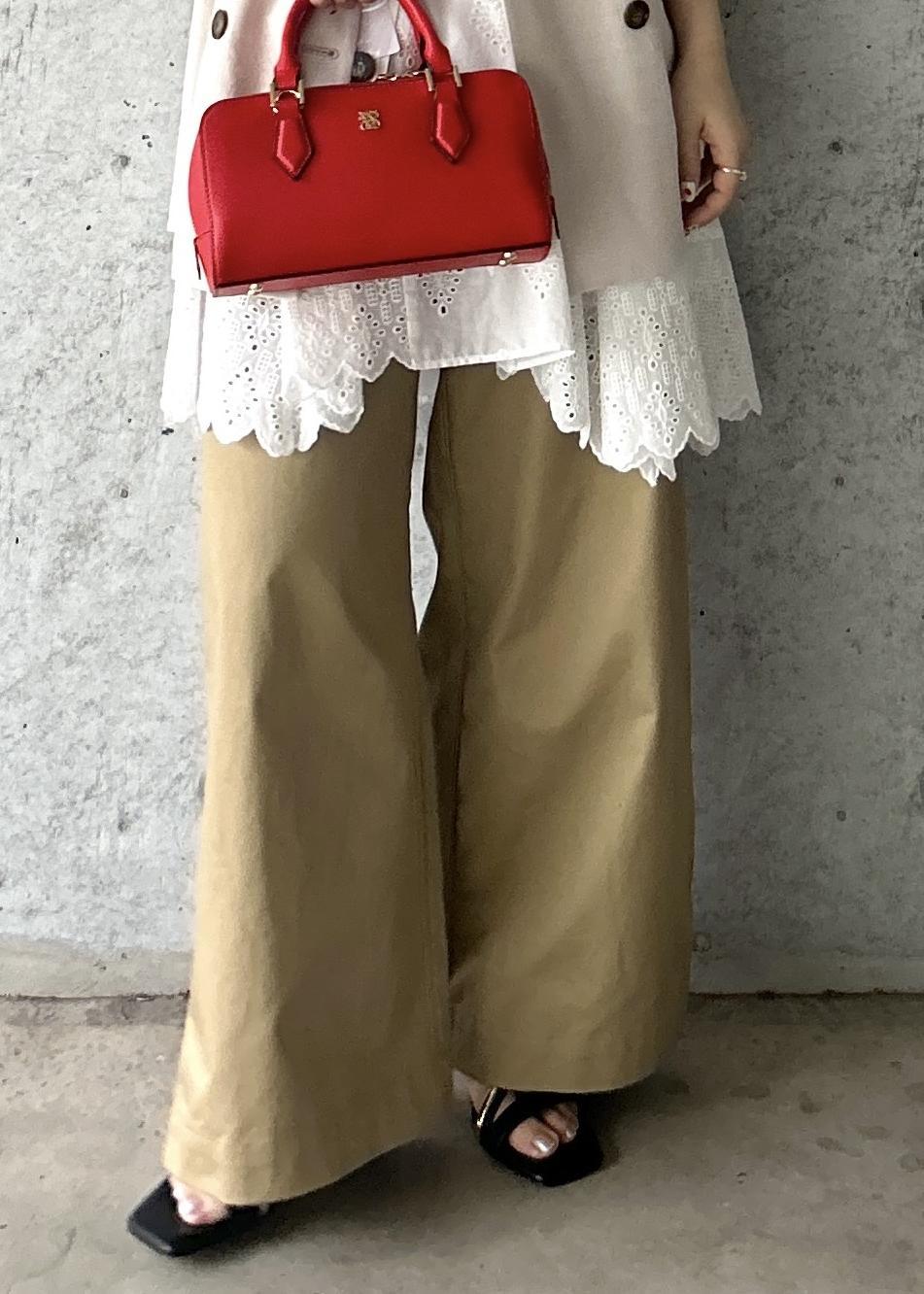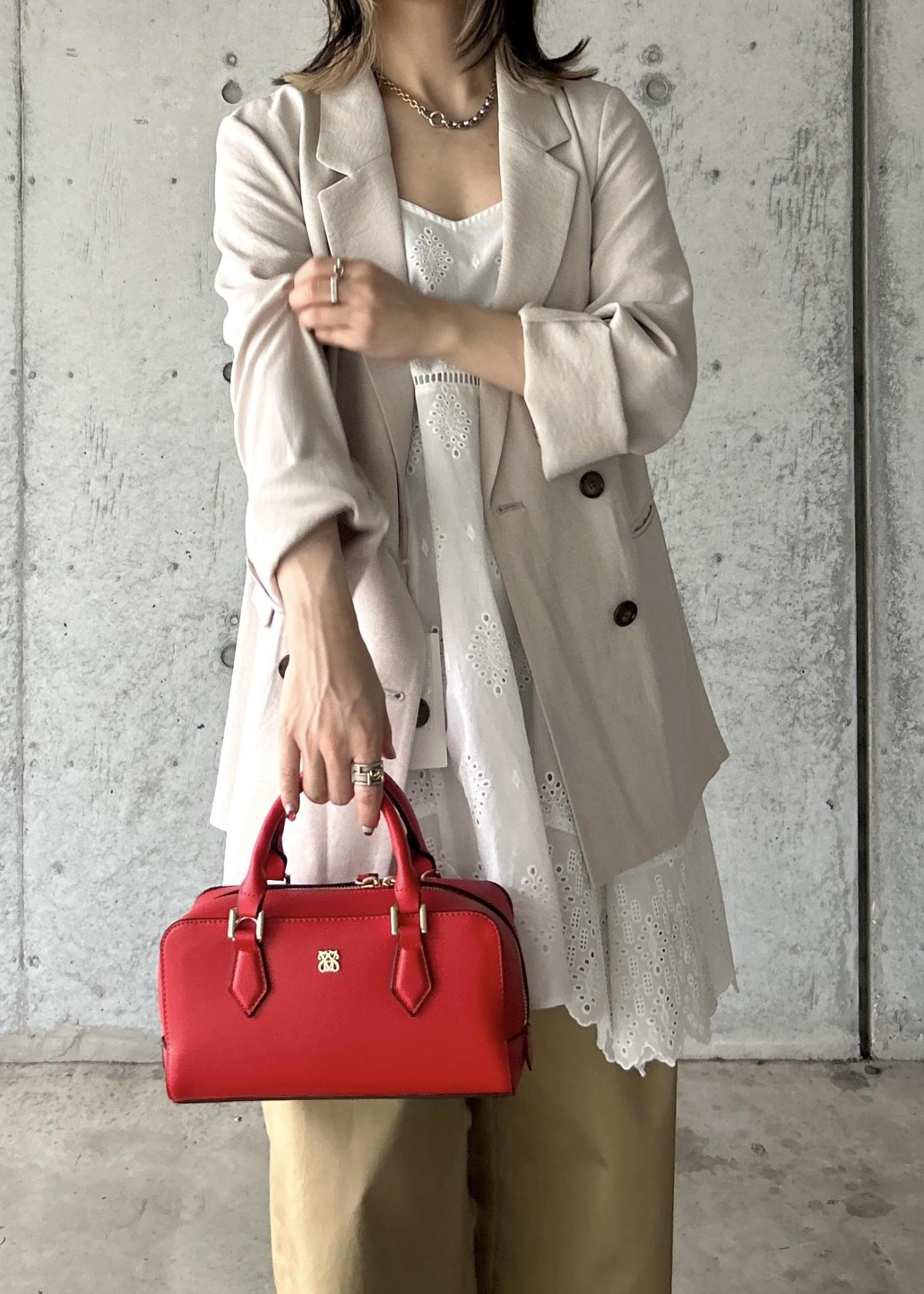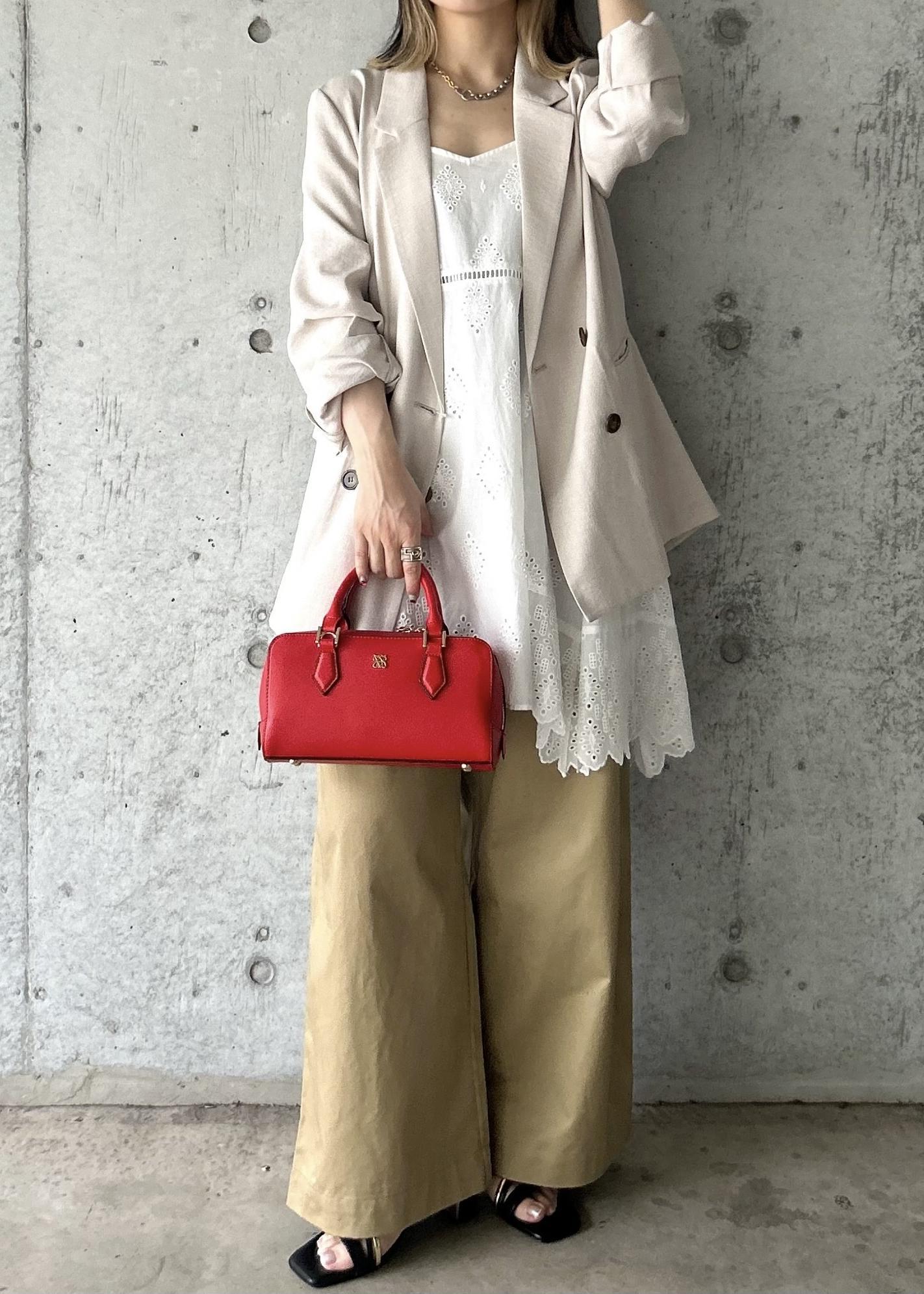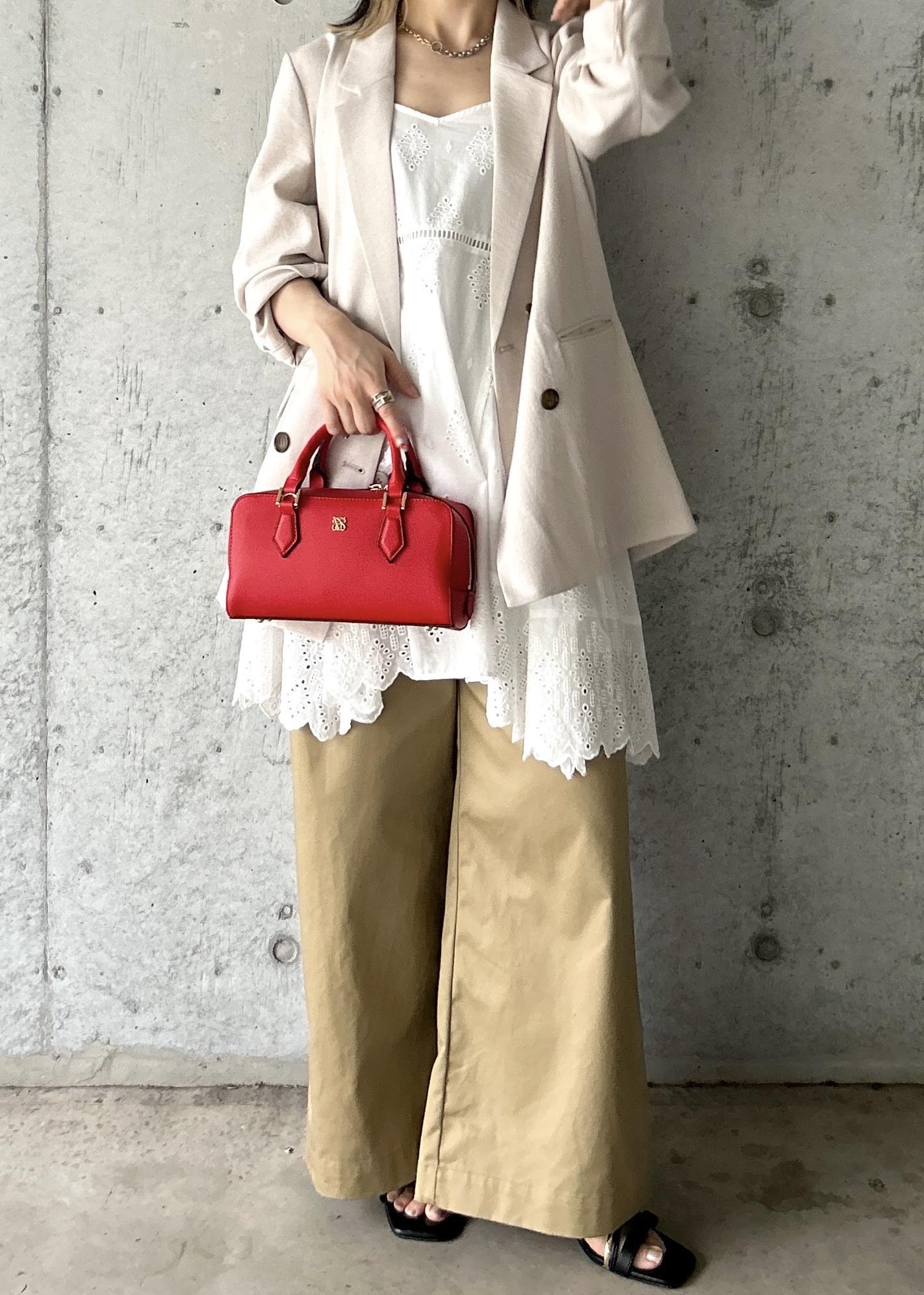 オフホワイトはインナーの色によっては透け感があるので、馴染みの良いベージュ系のインナーを合わせるのがオススメです。 -