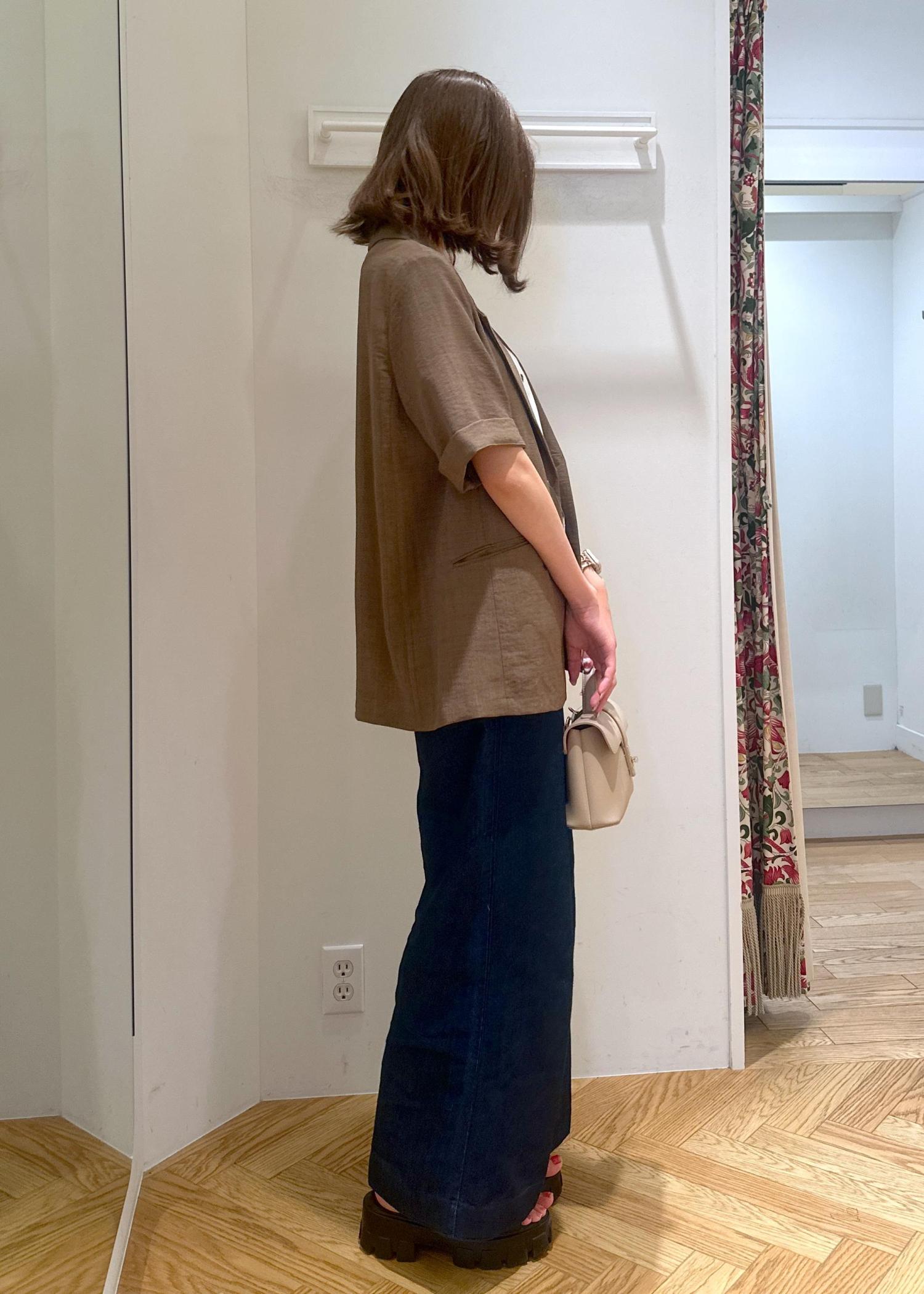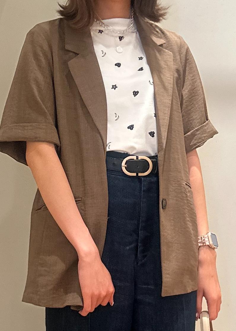 カーキのハーフスリーブジャケットを合わせて落ち着いた雰囲気にしつつ小物で遊び心を◎