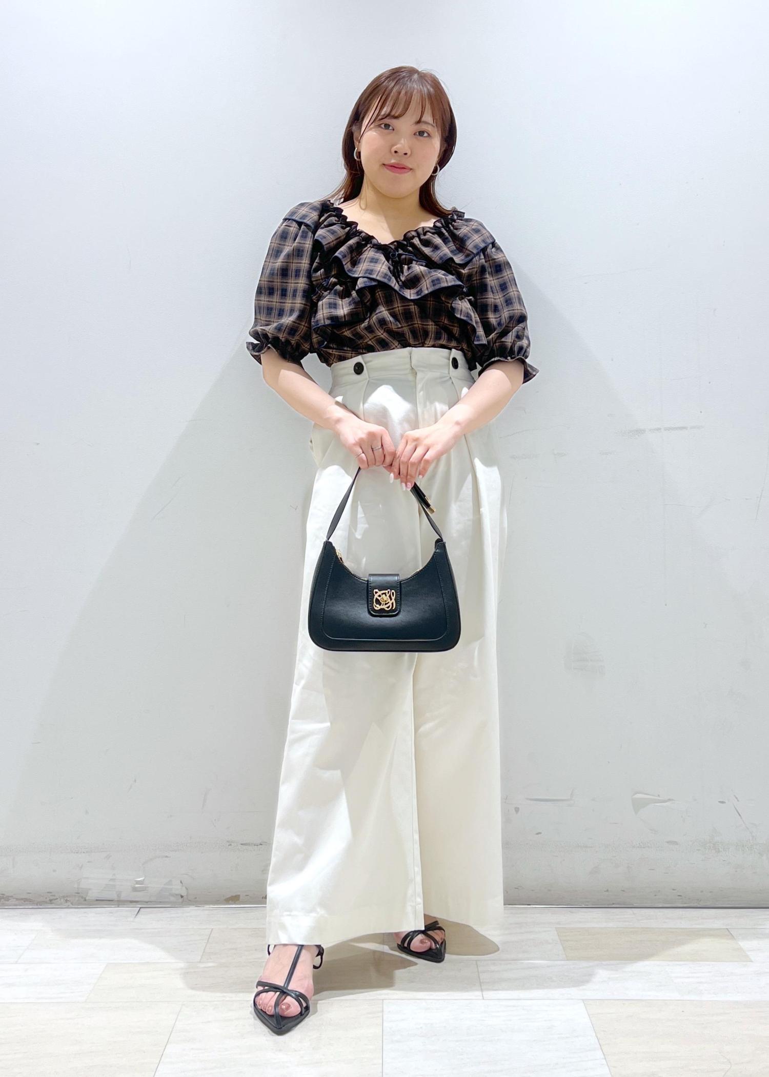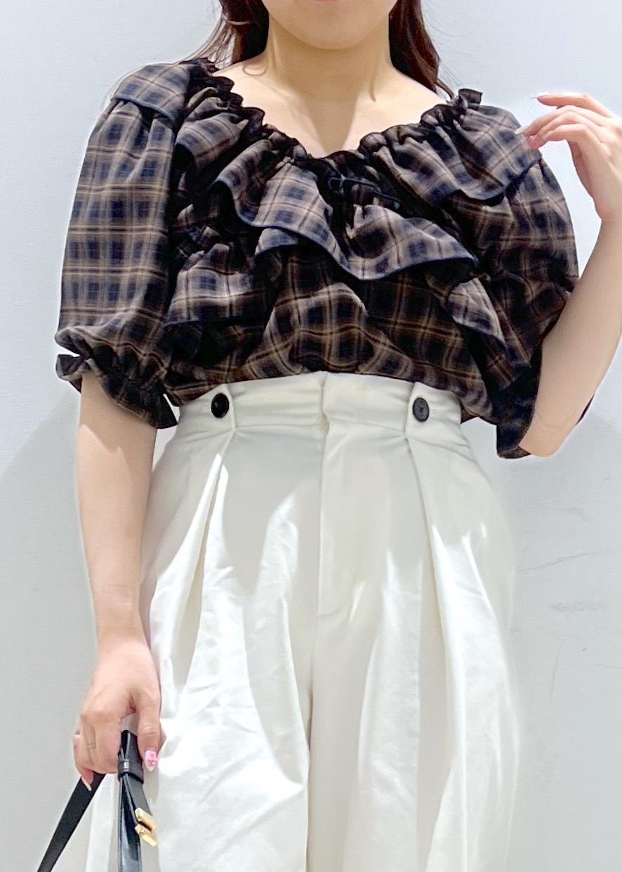VIS【2WAY】フリルチェックオフショルブラウスダークブラウン系 / F¥6,589レビュー一枚で華やかなラッフルデザイン、チェック柄のブラウスです。