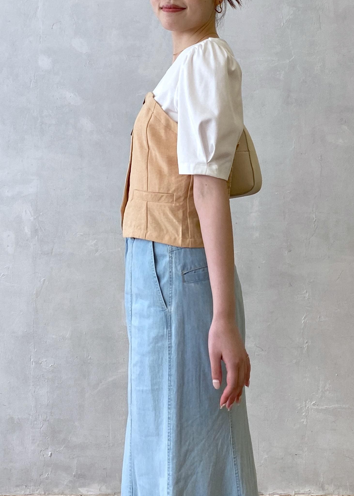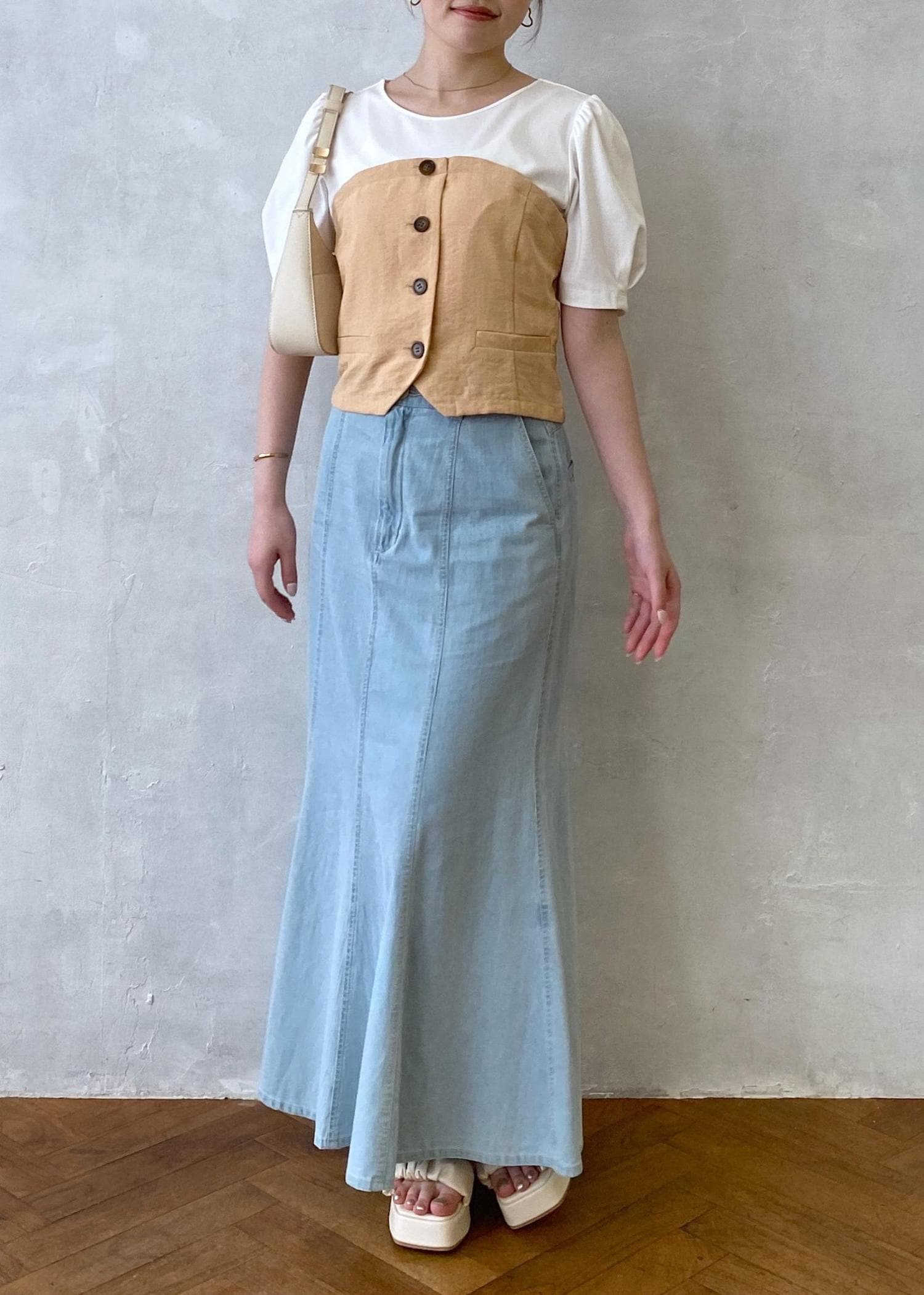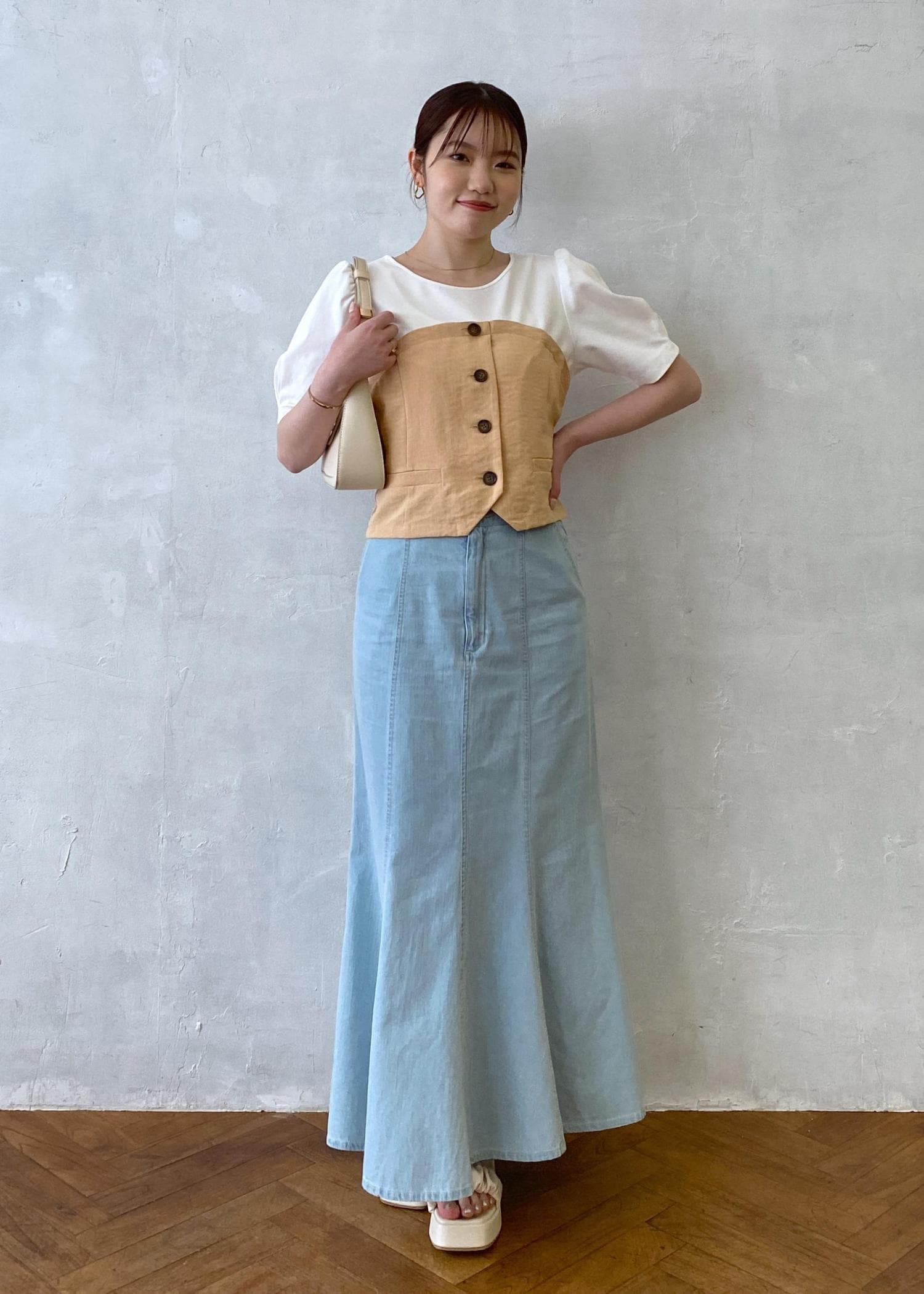 オレンジのビスチェ風のトップスに、デニムのマーメイドスカートを合わせて、フェミニン×カジュアルな印象に◎