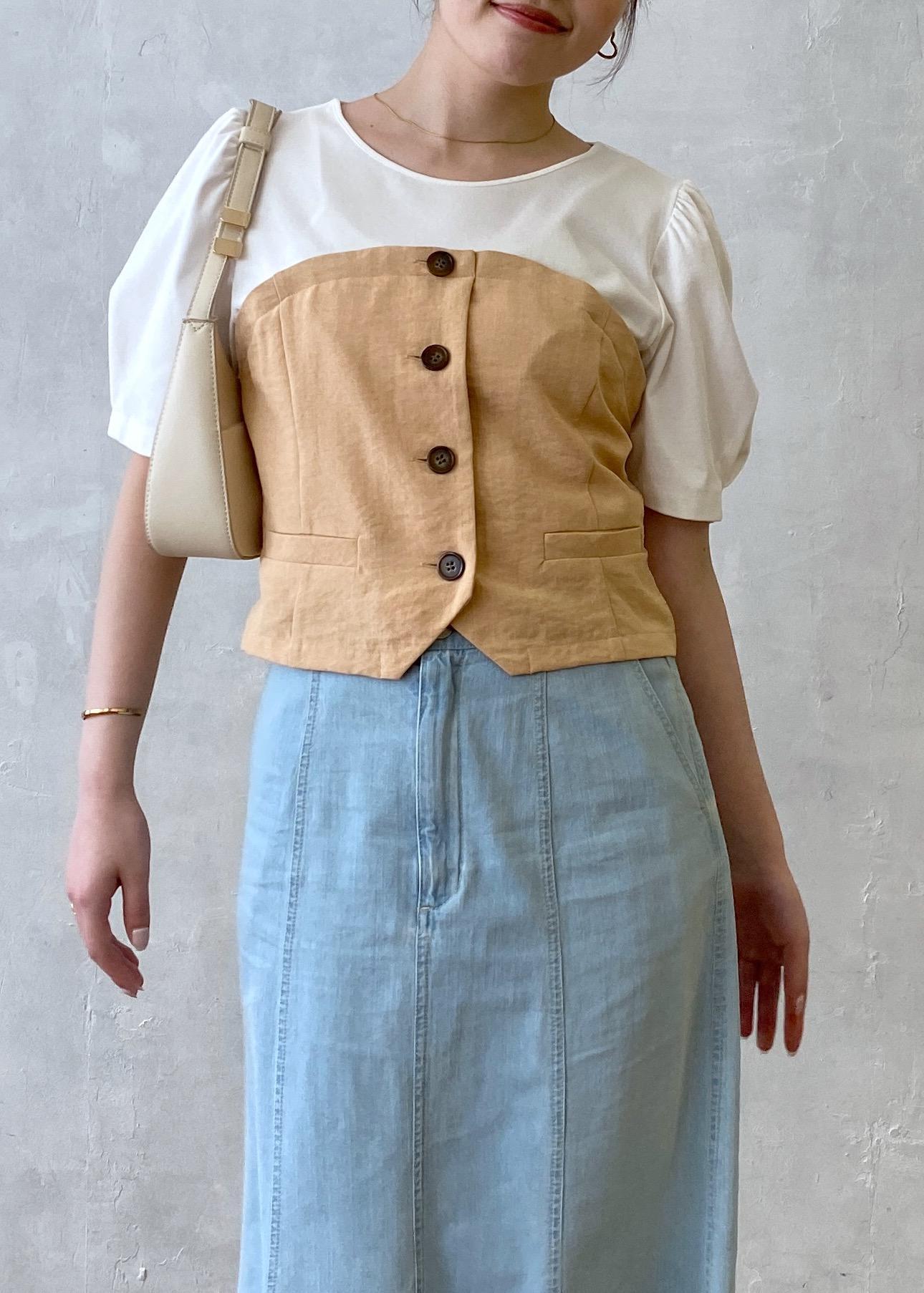 【新色追加】【美easy】釦ビスチェTシャツドッキングプルオーバー【接触冷感/洗える】