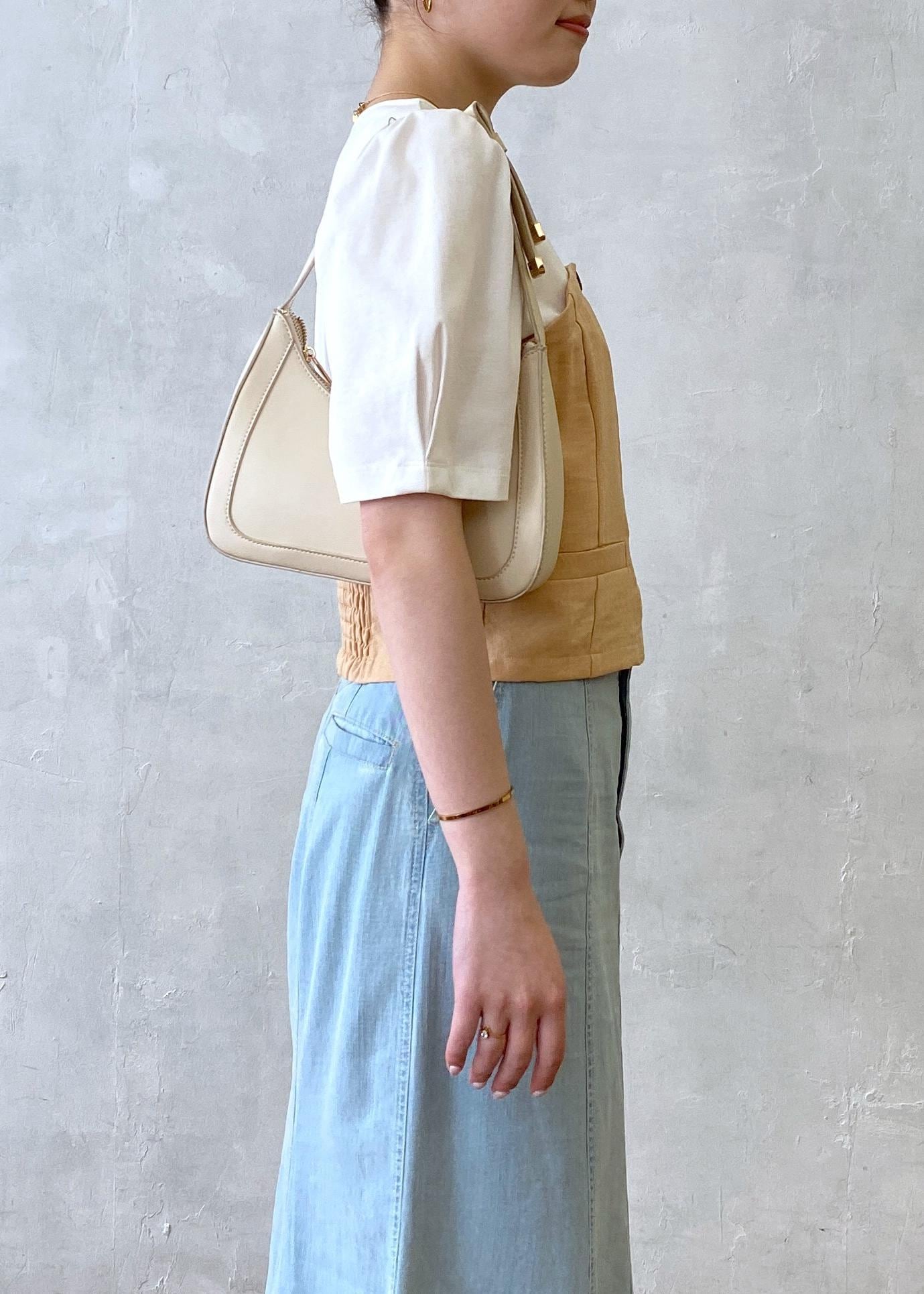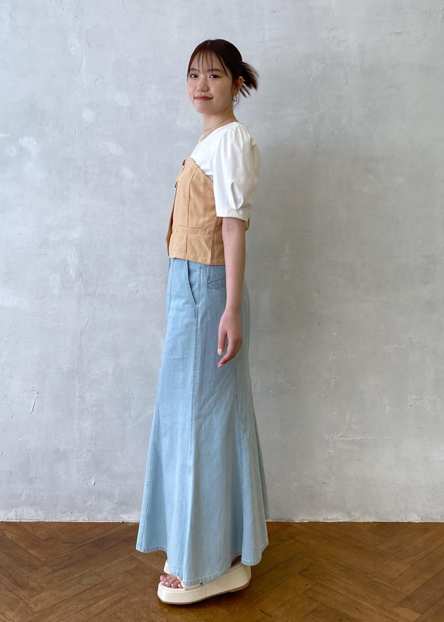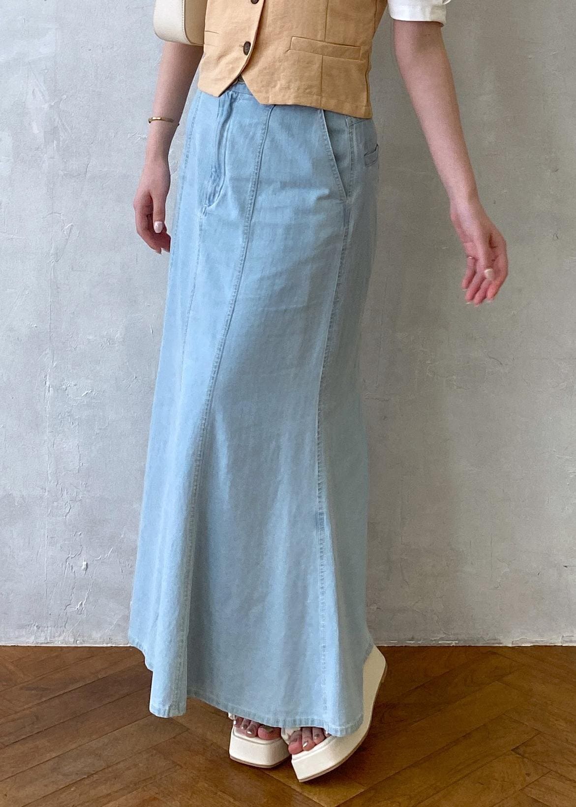 本来ならばデニムでカジュアルな印象に見えやすいですがマーメイドのシルエットがきれいなので上品に見えやすく、柔らかい素材なので夏でもサッと履けるデニムスカートです◎