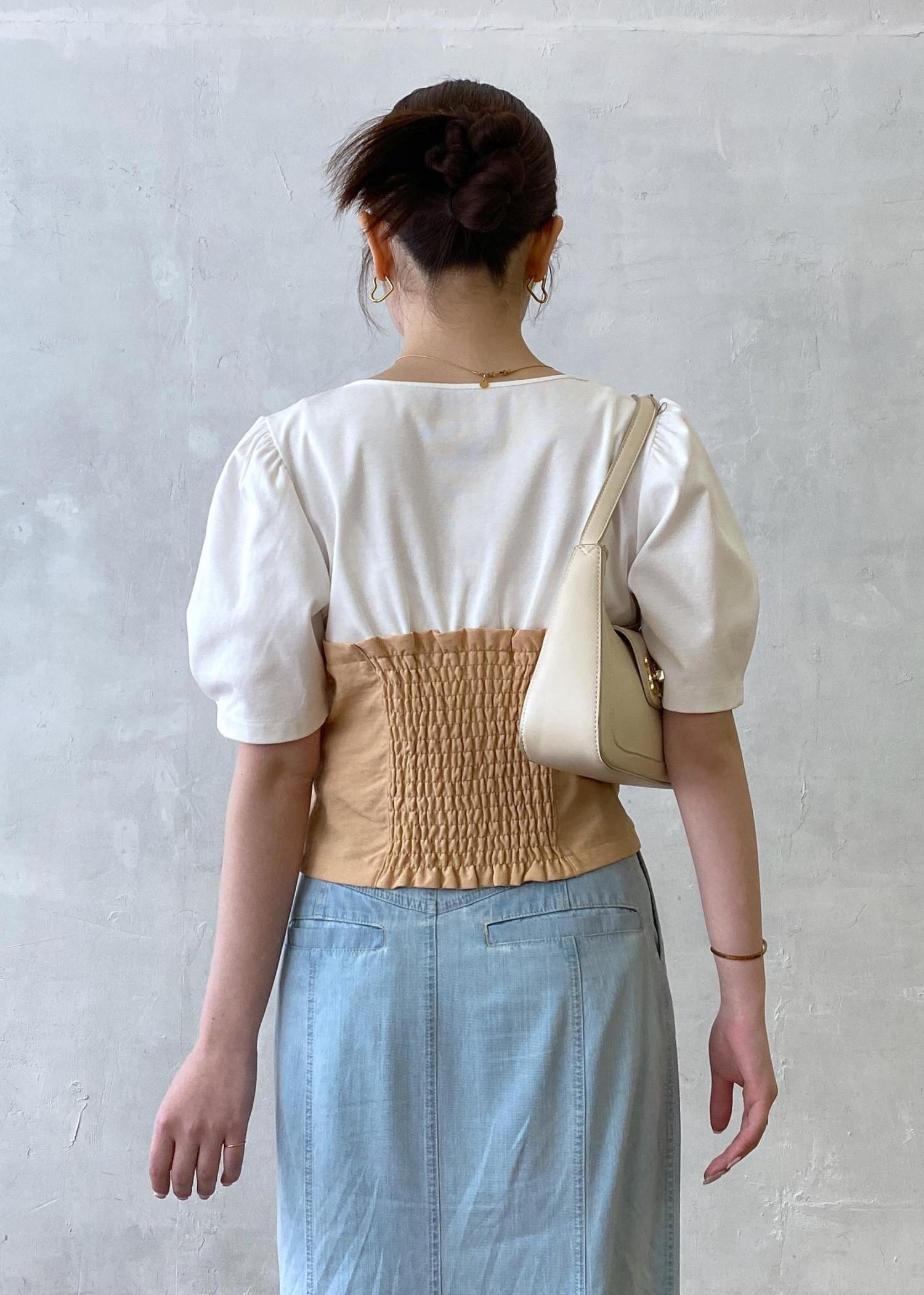 袖がパフスリーブになっていることで女性らしさをプラス!程良いコンパクト感で、パンツやスカートなどオールマイティに合わせられるトップスです◎