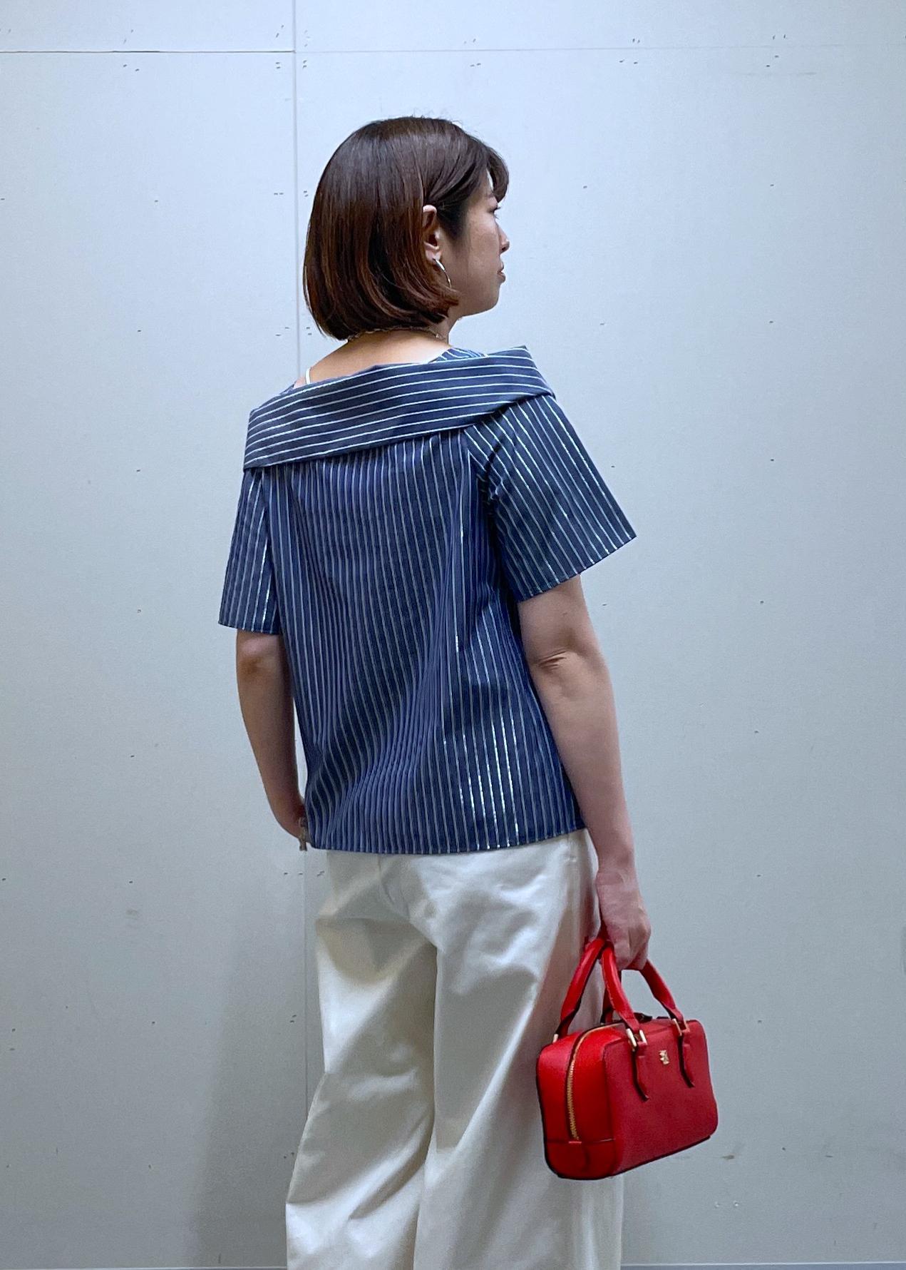 【新色追加】【防シワ】ラメミックスオフショルダー風ストライプシャツ