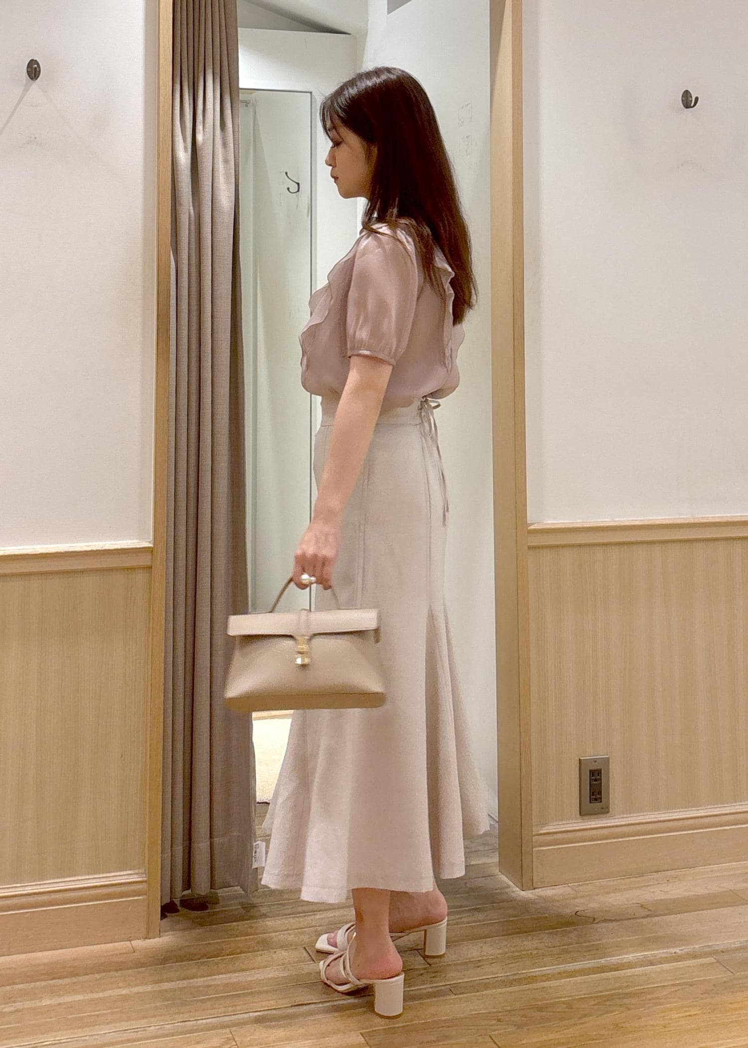 158cmSサイズ着用、着丈は足首より少し上の感じでした。サラッとしていて、マーメイドスカートにしては、ヒップの膨らみもあまり気になりませんでした◎