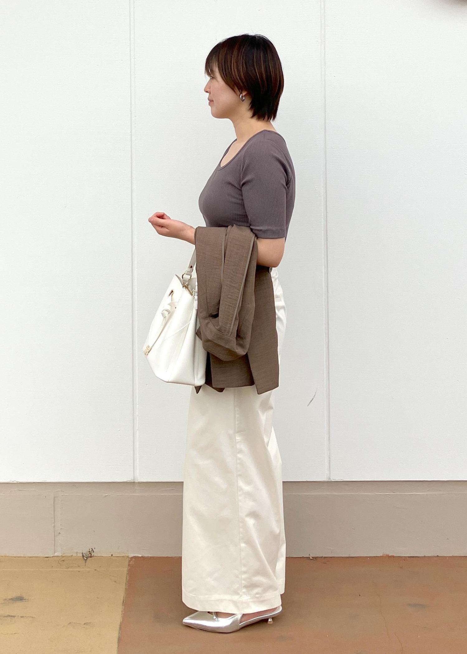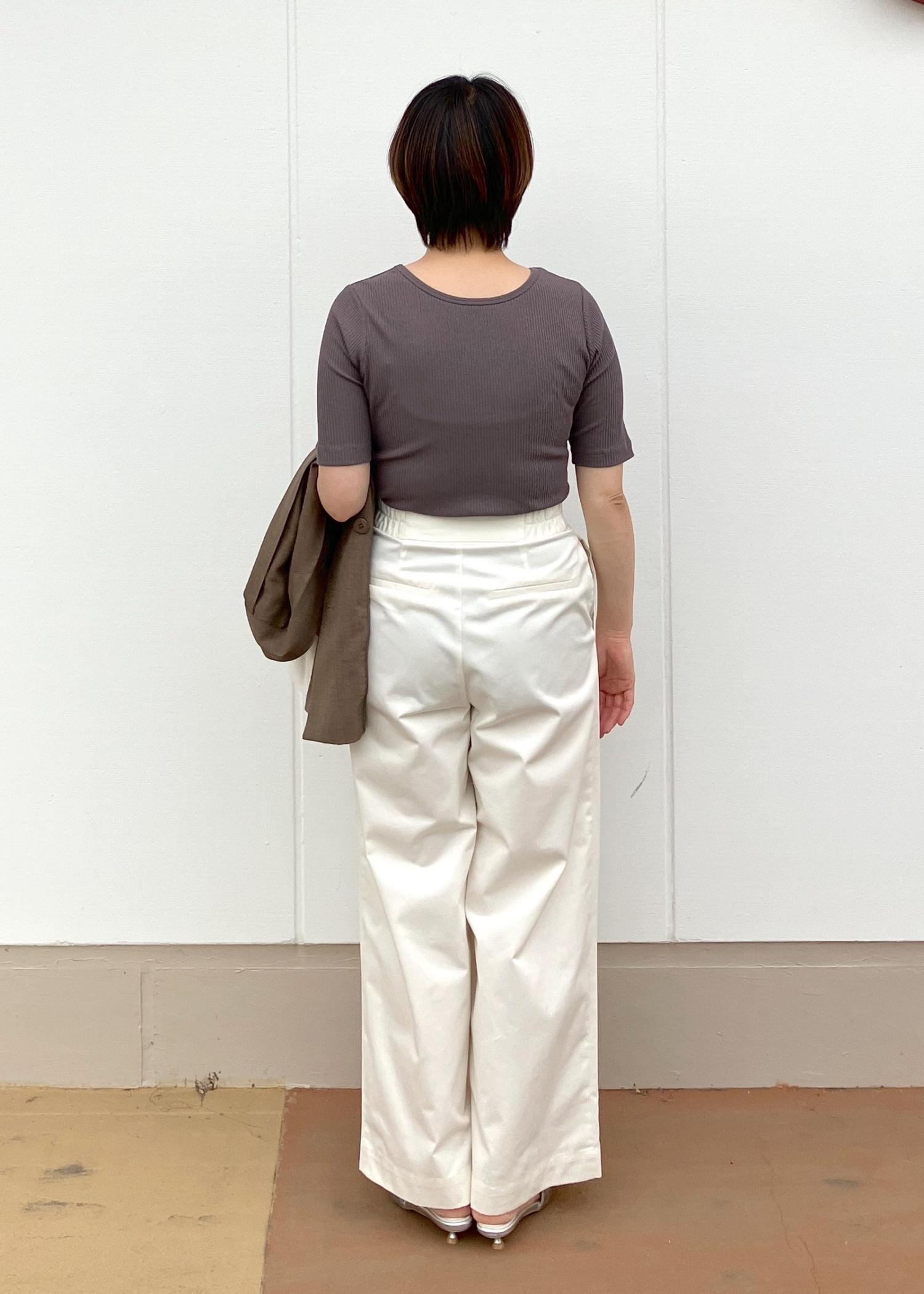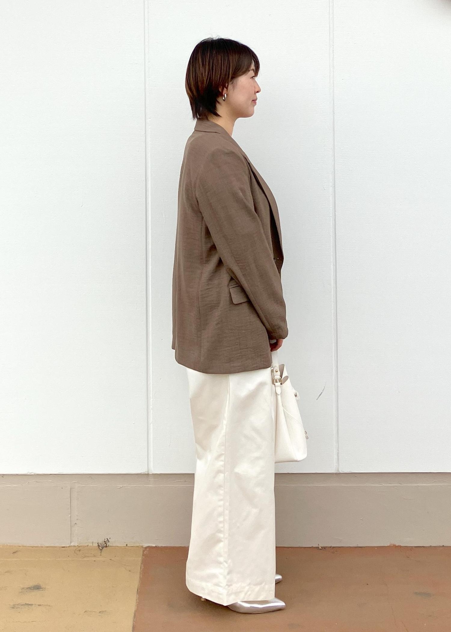 美easyの長袖ジャケットが再入荷しました!寒暖差がある梅雨の時期には1着あると調整ができておすすめです!トップスはぴったりしているのでボトムはワイドで上下にメリハリを!オフィスカジュアルにも着ていただけるコーディネートを意識しました!