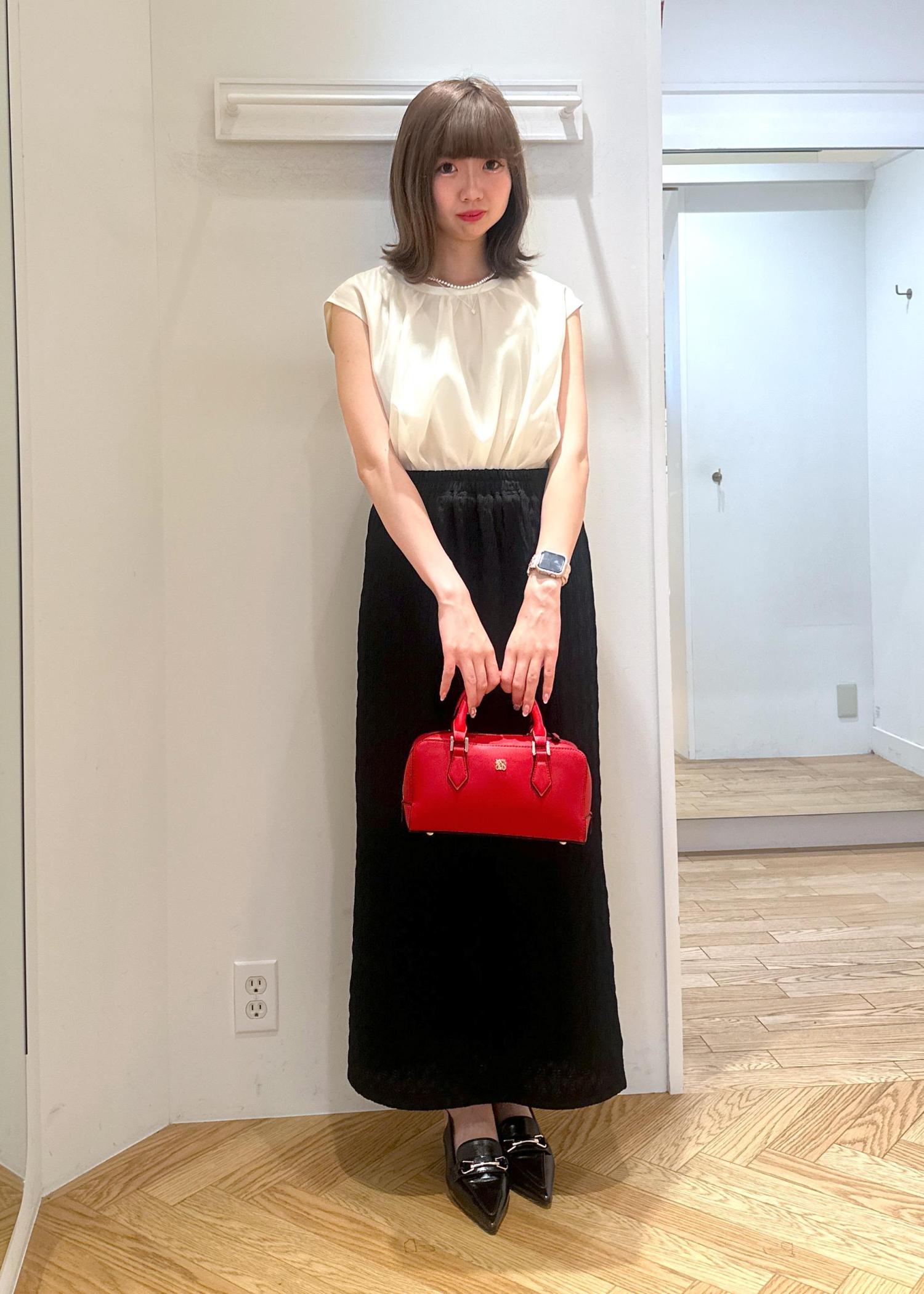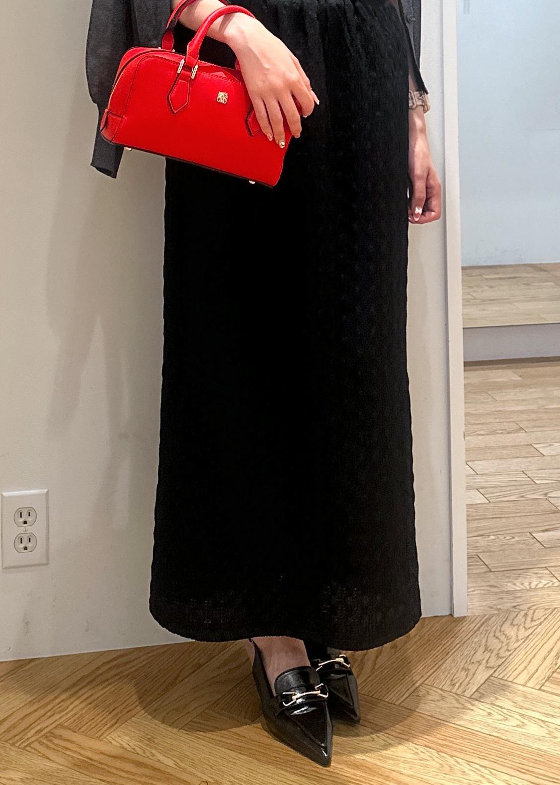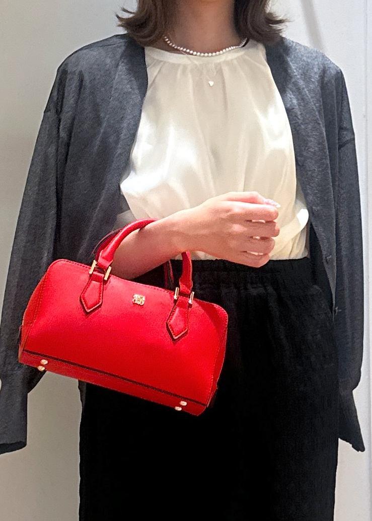 モノトーン調のコーディネートにレッドのバッグを合わせて差し色に。