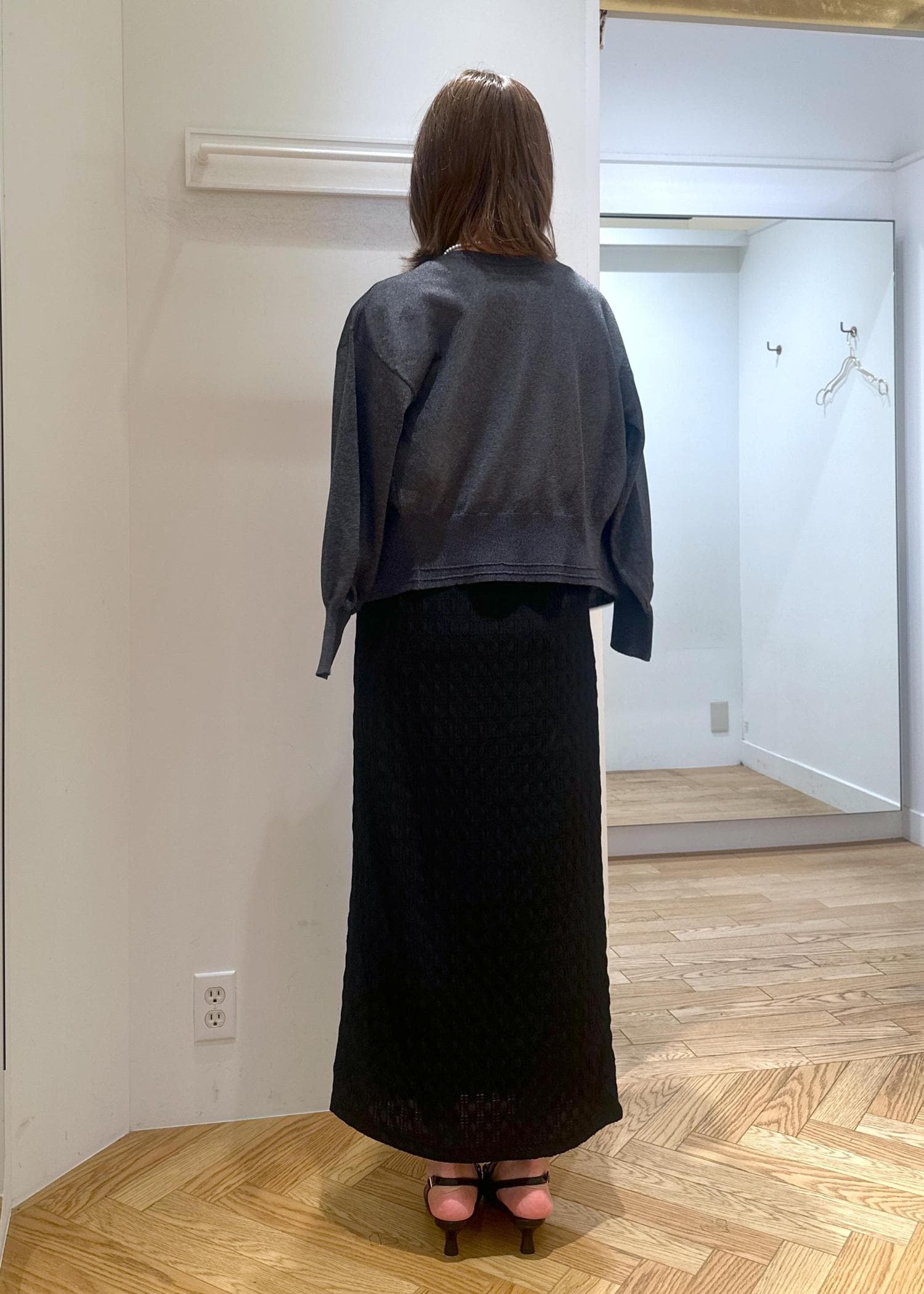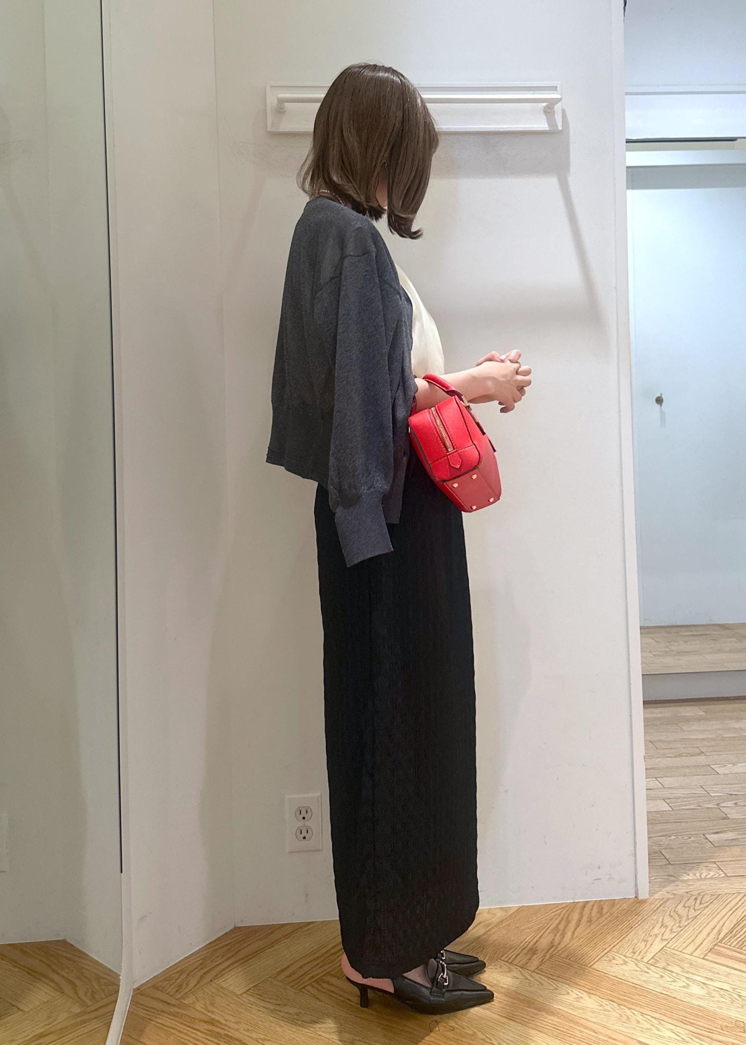 カーディガンはブラックではなくチャコールグレーのカラーなのでモノトーンで統一したコーディネートでも重たくなりすぎないのが夏にぴったり。