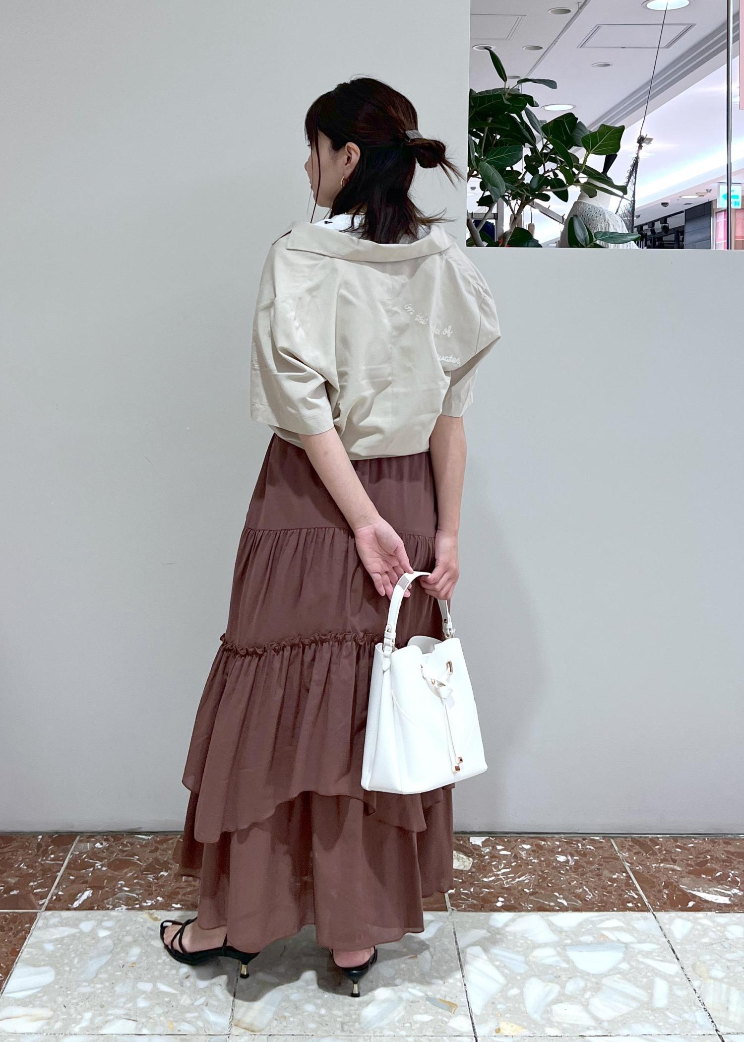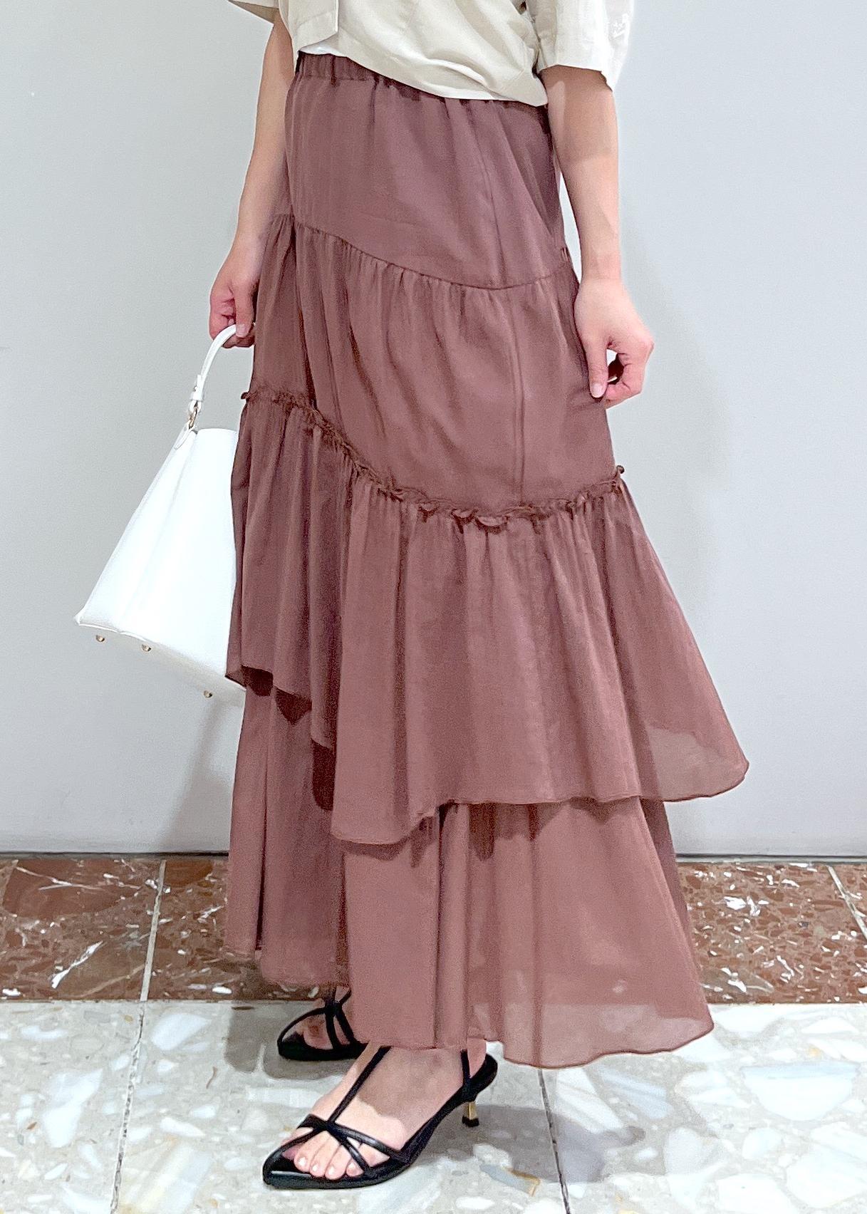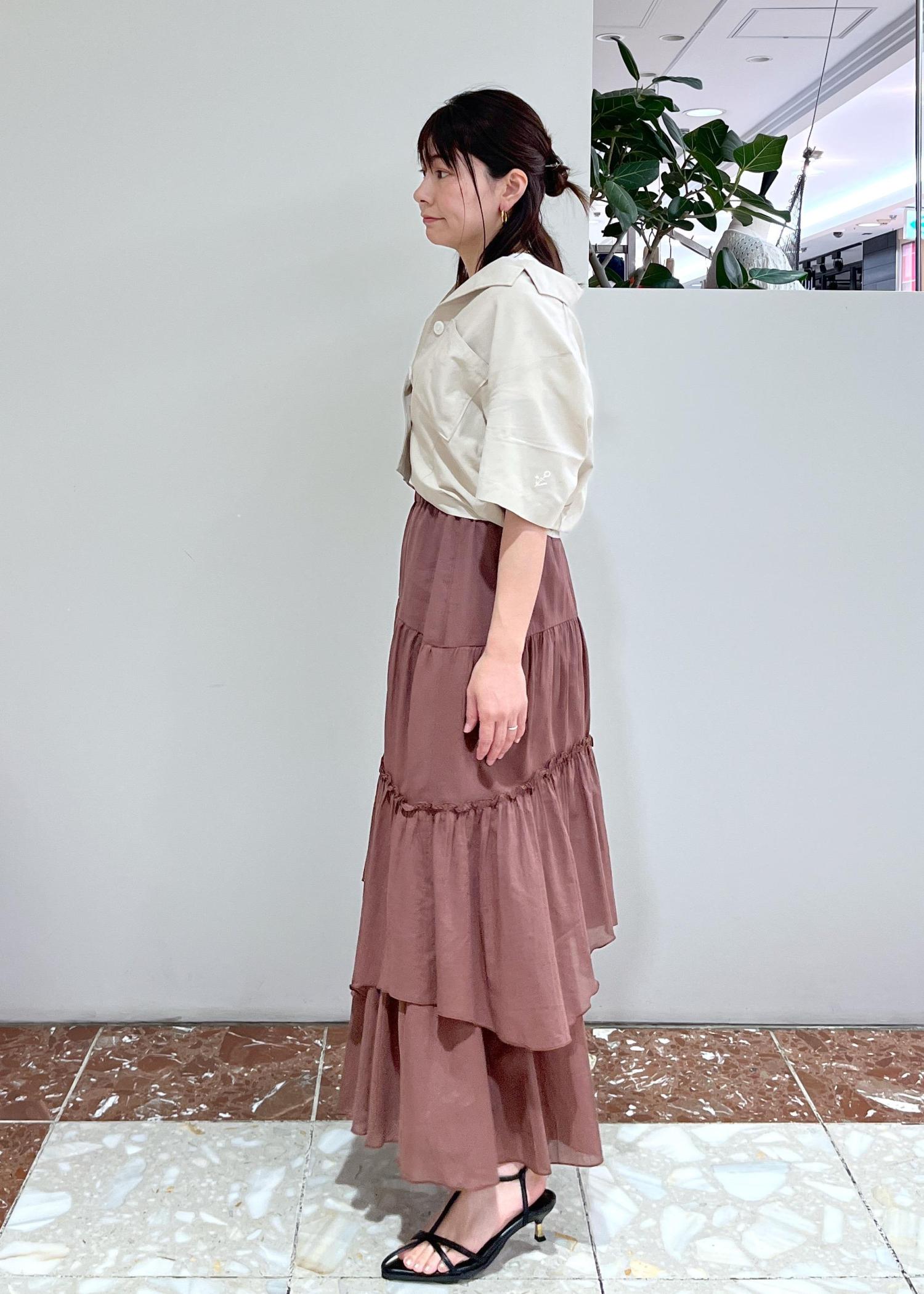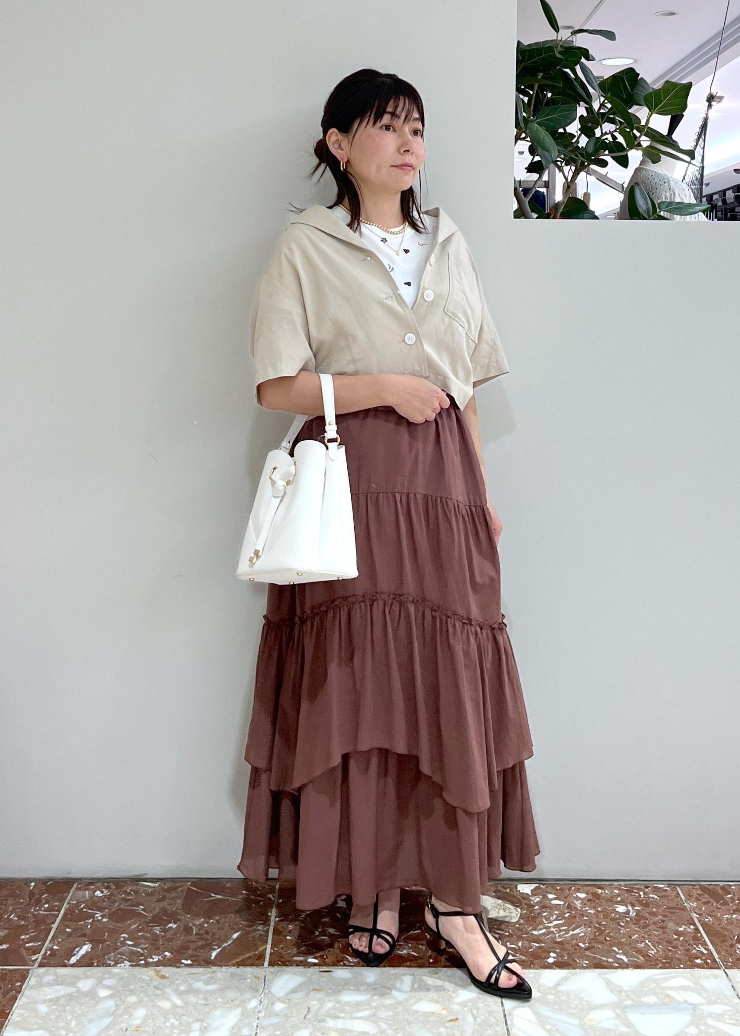 アウトレットVISボイルティアードスカートダークブラウン / F¥3,955レビューアシンメトリーがとてもキュートなティアードスカートです。生地もふんわりと薄手で動くたびにヒラヒラします。スカートがキュートなので、トップスはTシャツなど少しカジュアルなものと、短丈のブラウスでスタイルアップできるよう意識してみました!