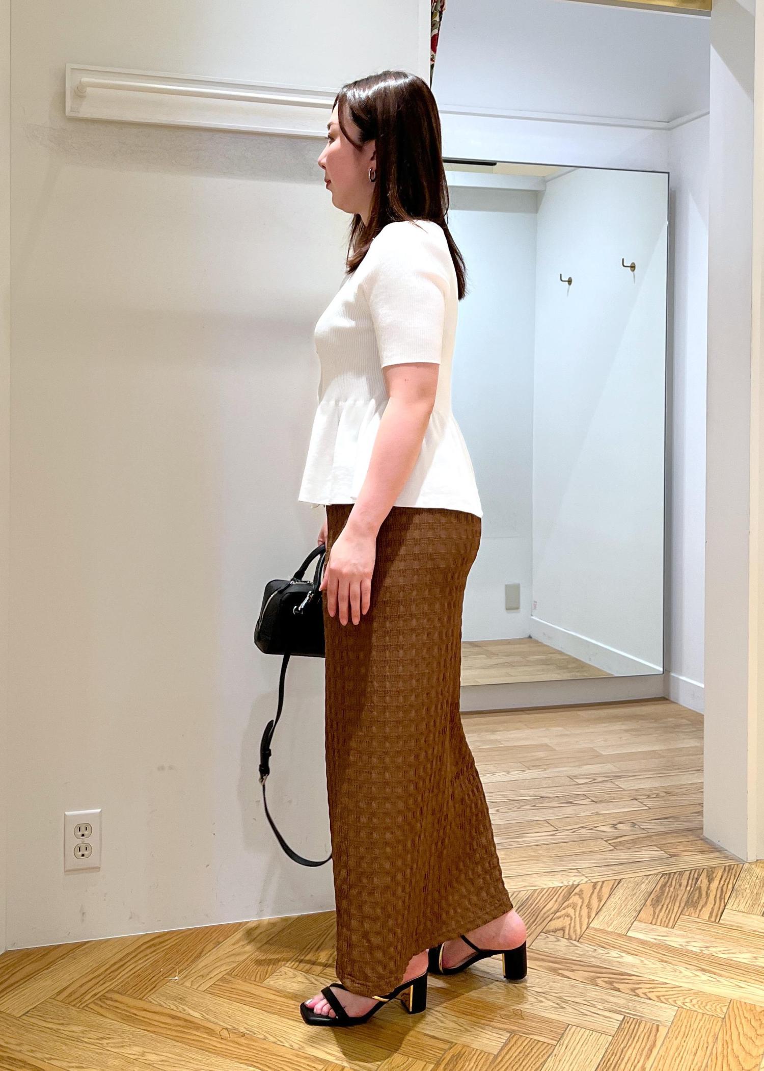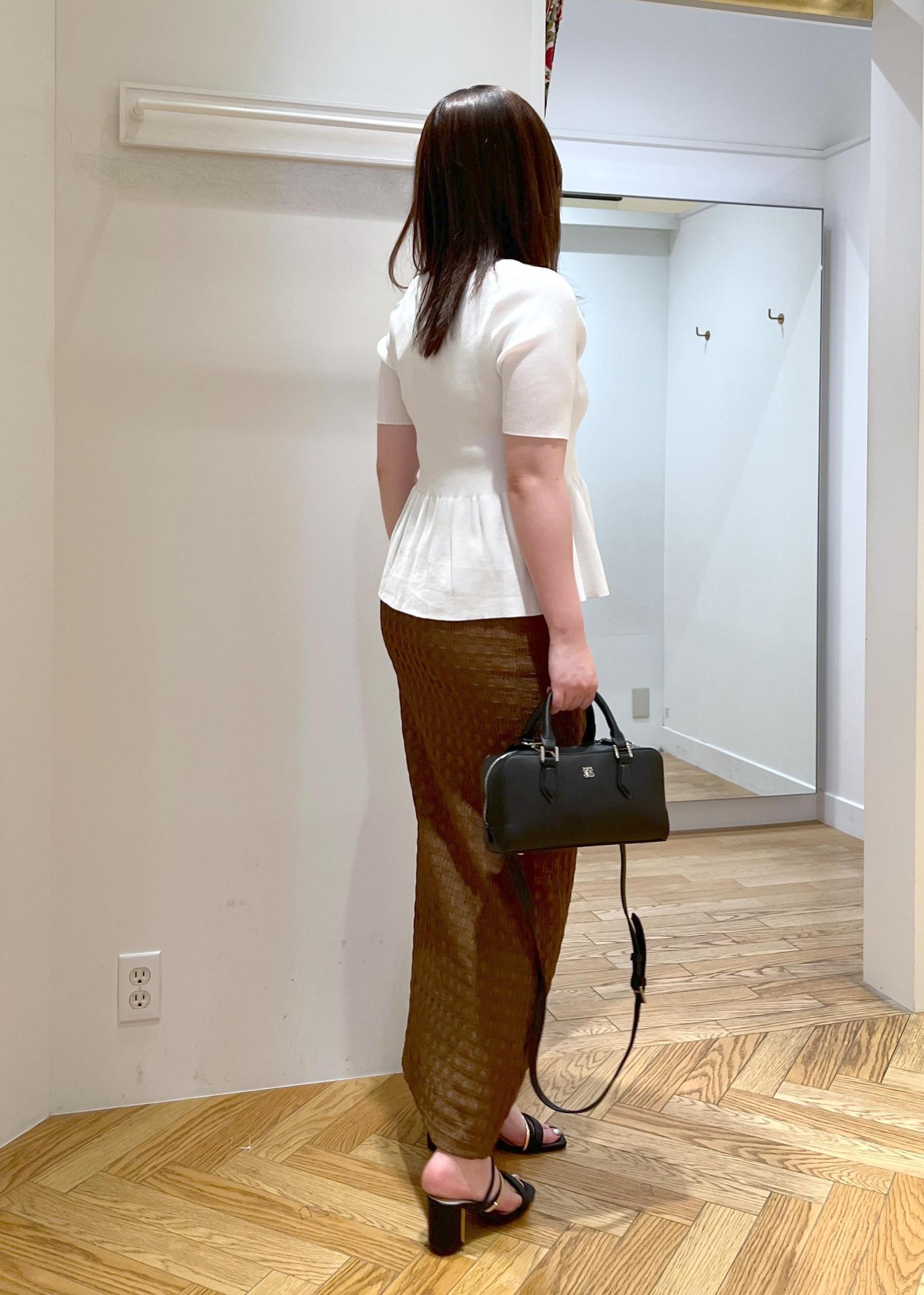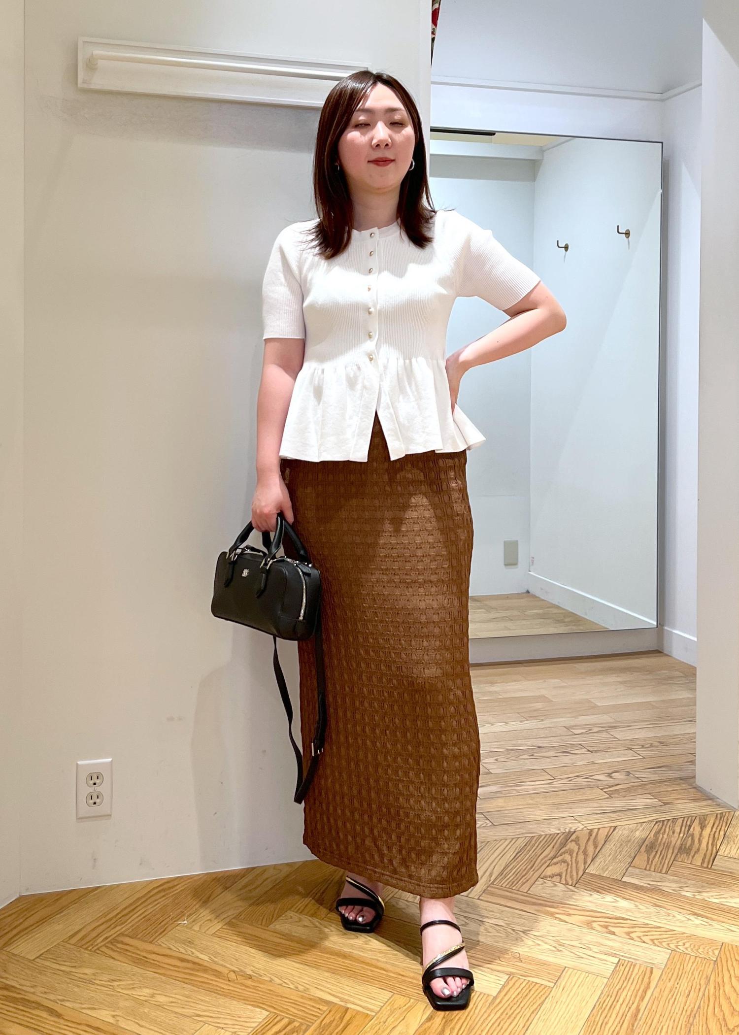 ペプラムのシルエットが目を引くカーディガンにジャガードのスカートを合わせた程よくフェミニンなテイストのコーディネートです。