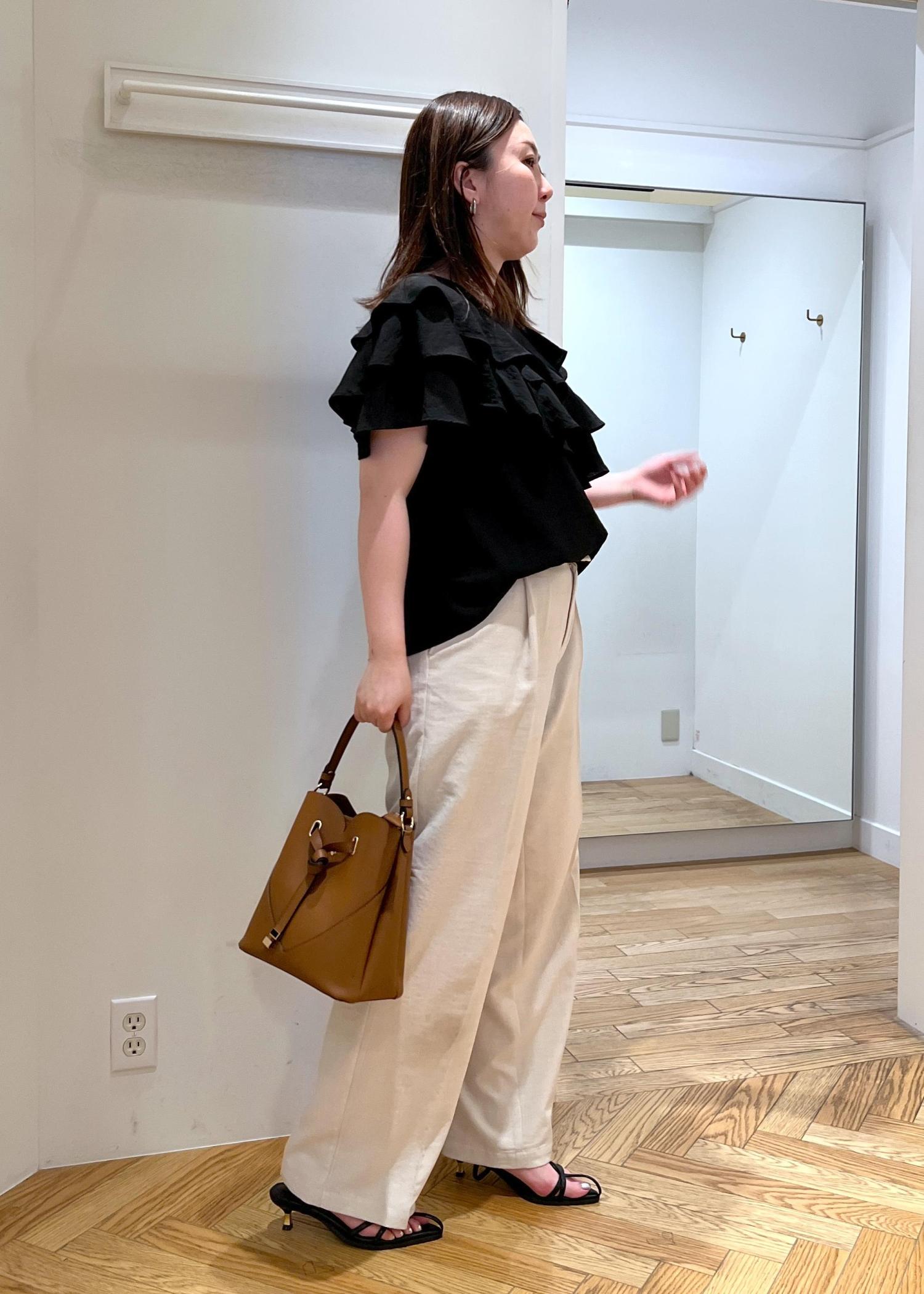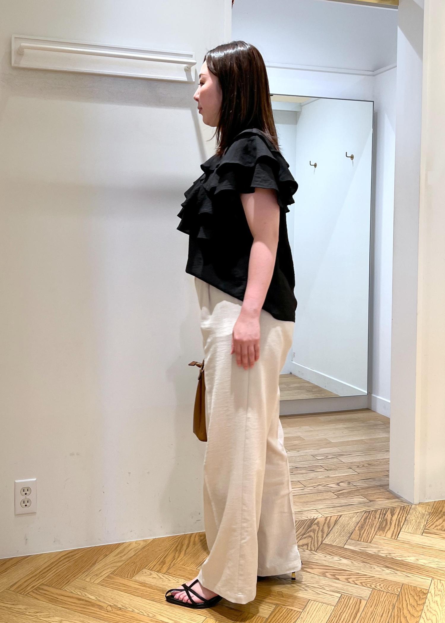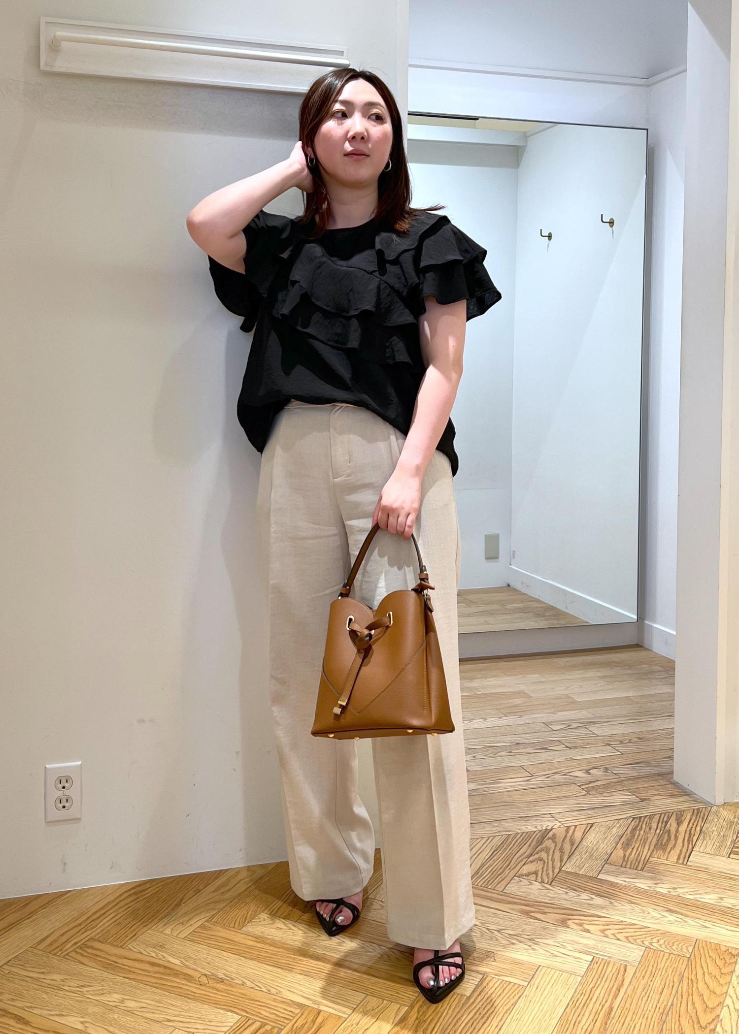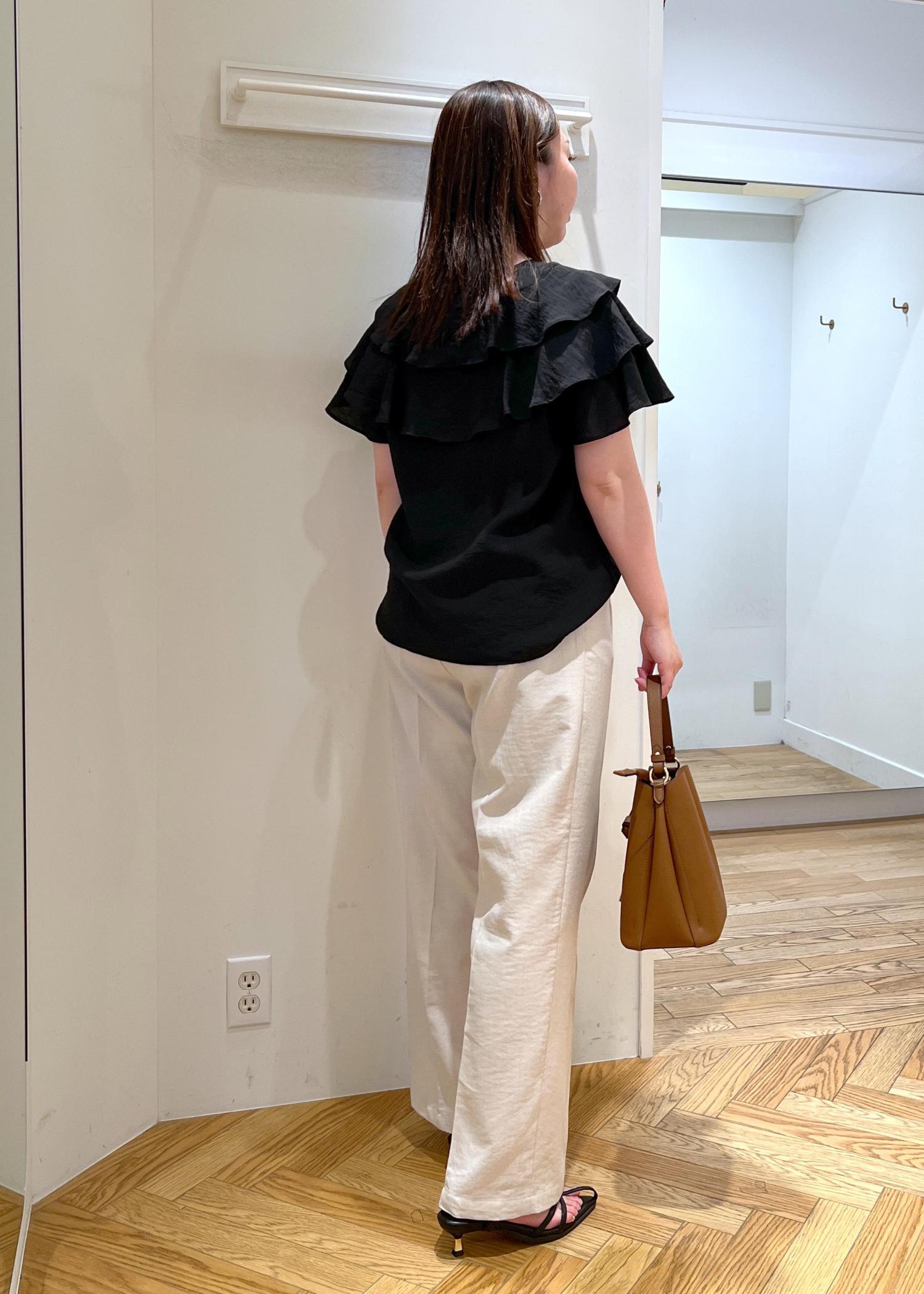 フリルブラウスを主役に、シンプルにワイドパンツを合わせたコーディネートです。