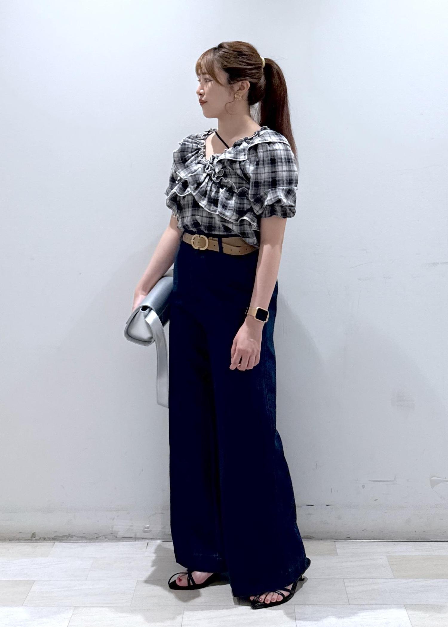 骨ストさんが苦手なフリルを敢えて着たコーディネートです!上半身の身体の分厚い私は普段フリルが苦手な骨格ではありますが、こちらは大きめなVネックのデザインだったため、デコルテラインが綺麗に見えて着てもそこまで身体が大きく見えませんでした。