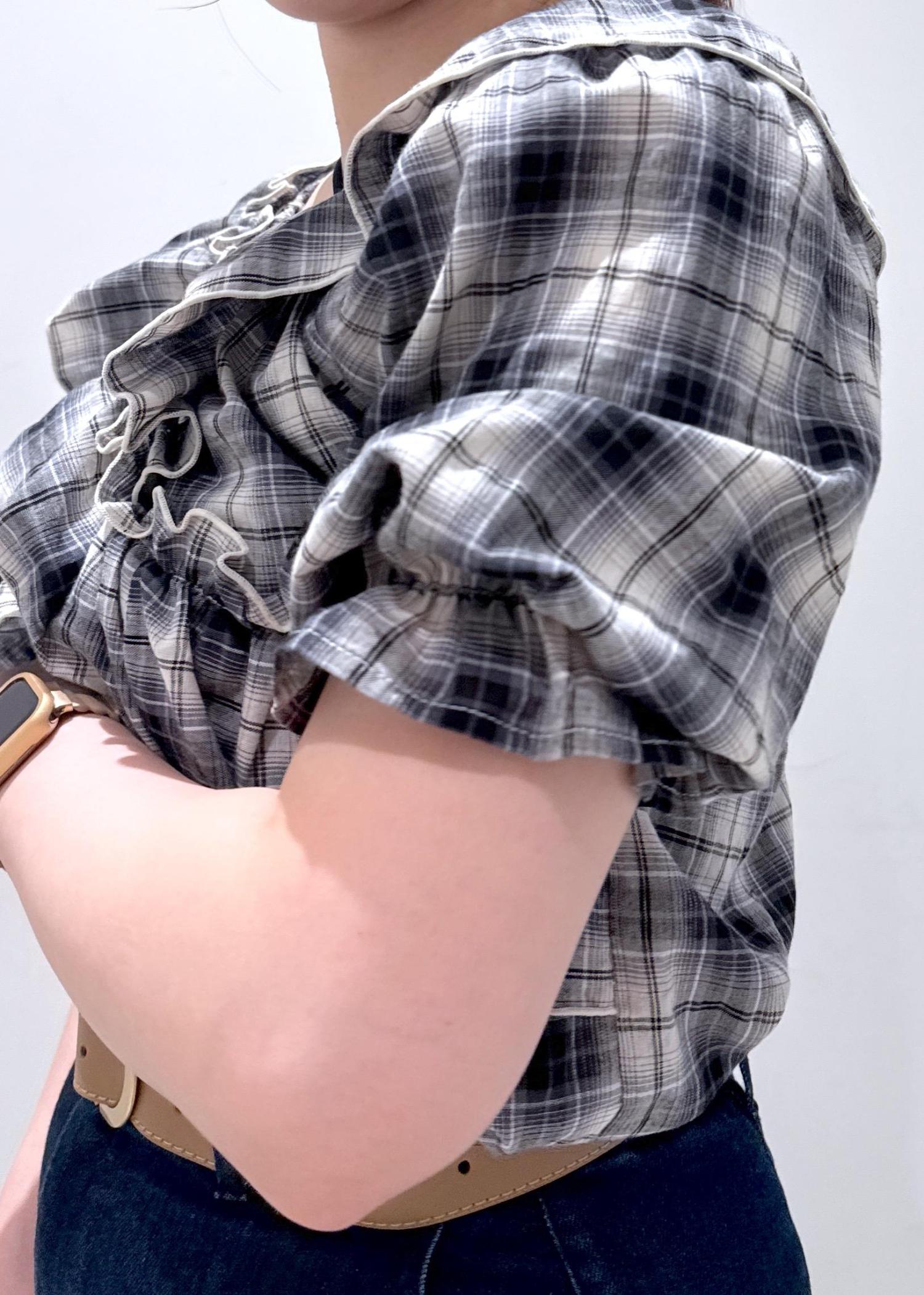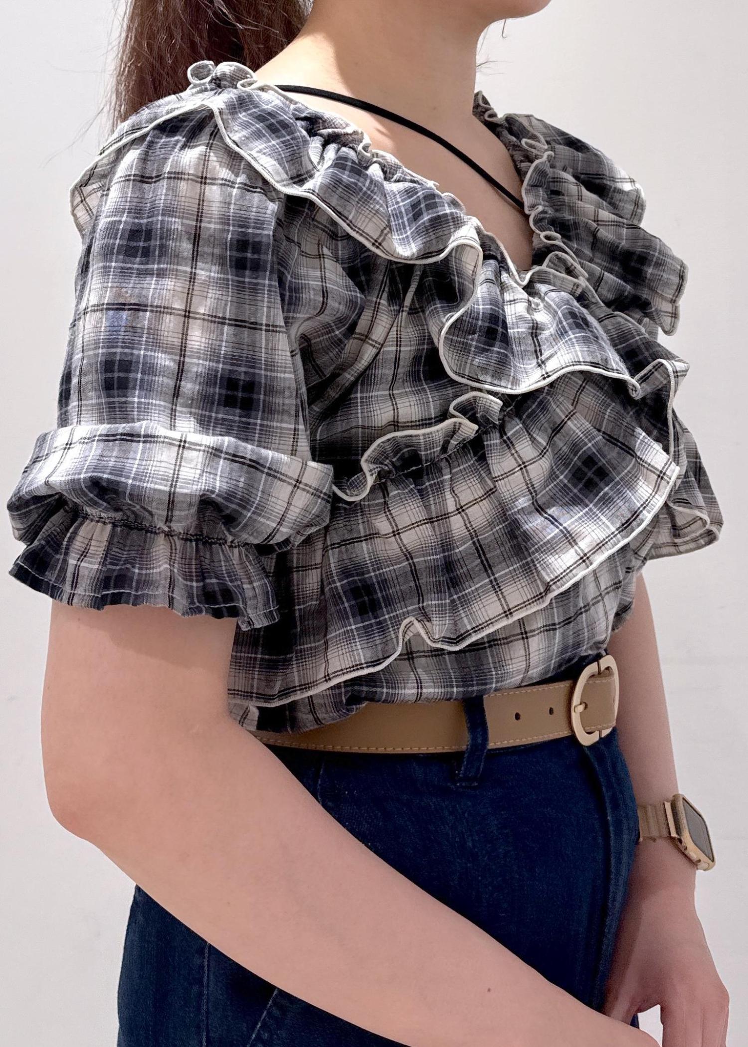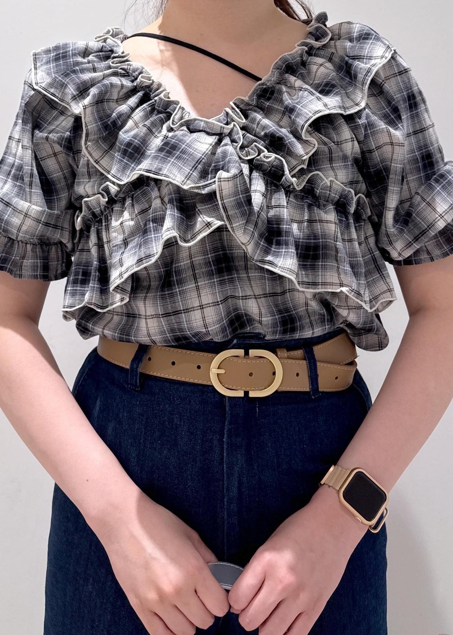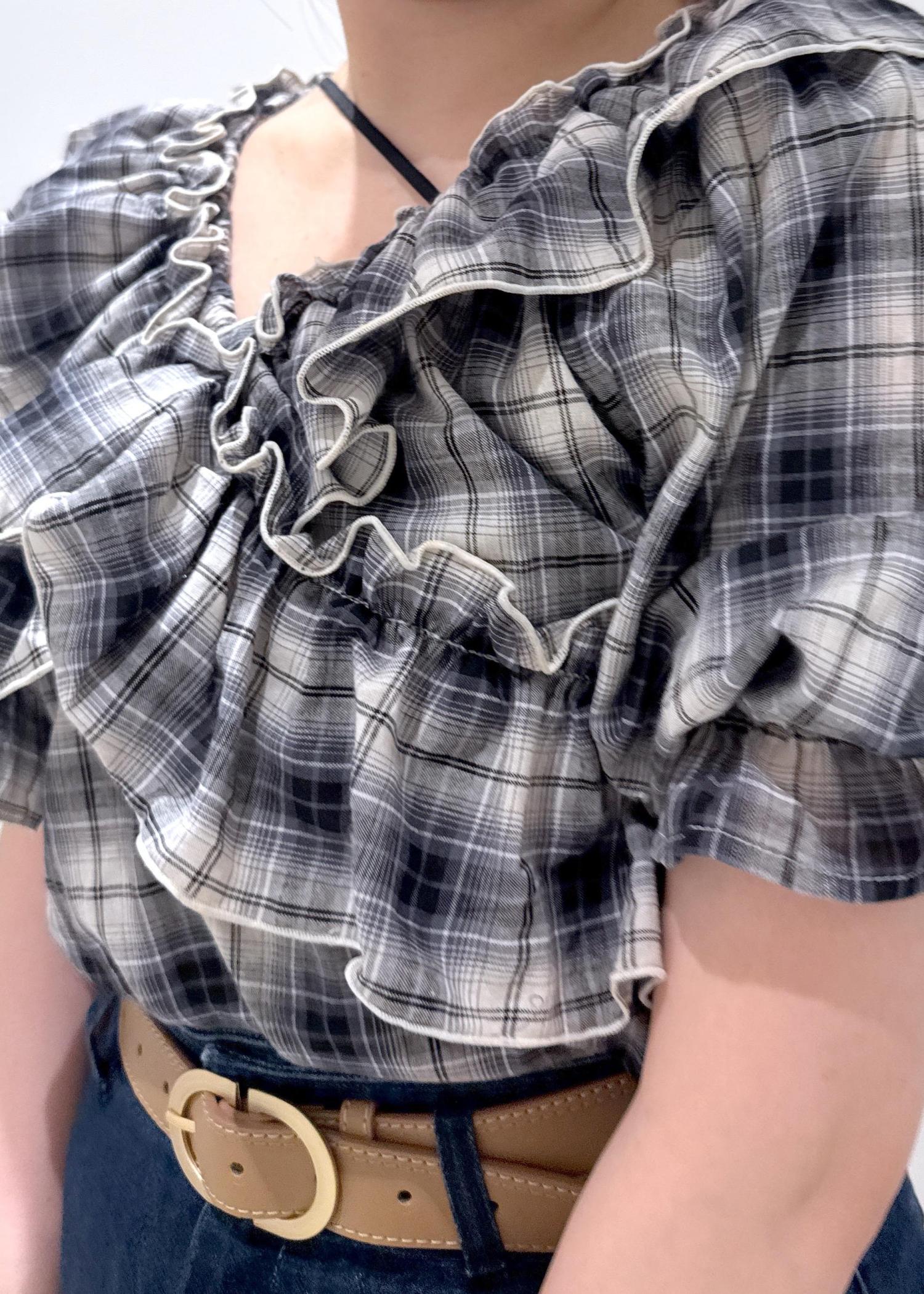 VIS【2WAY】フリルチェックオフショルブラウスブラック系 / F¥6,589レビュー2wayでも使えるチェックフリルブラウスで