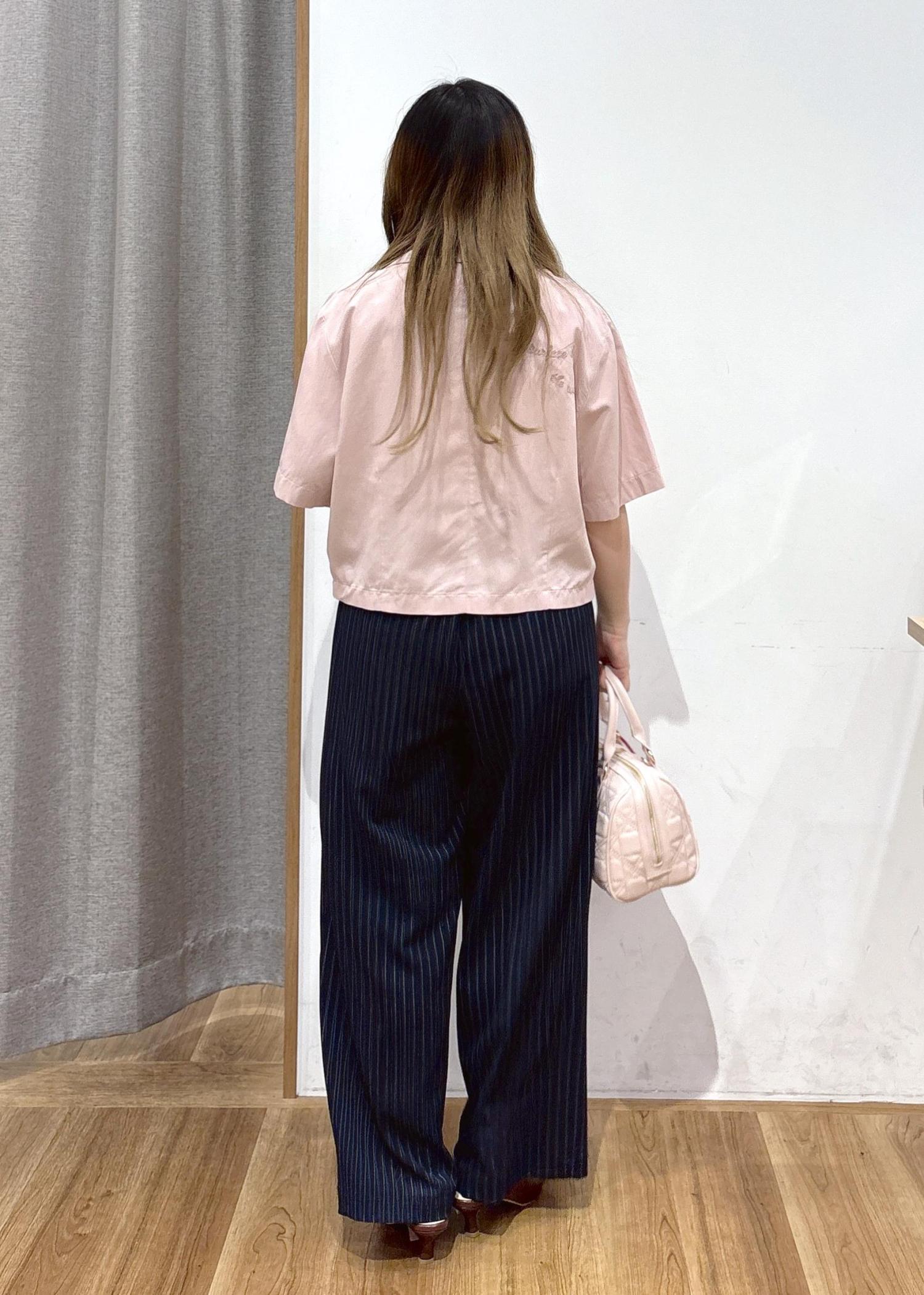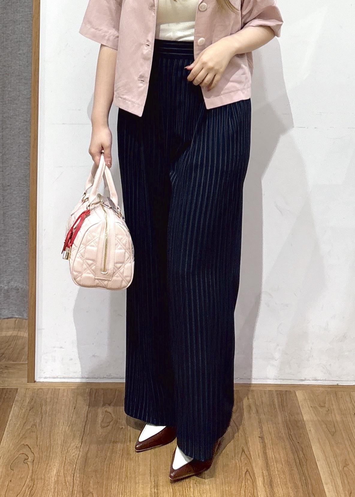 雰囲気を明るく上げてくれる夏らしいピンクシャツ×ストライプ柄のネイビーパンツで、甘すぎない大人の夏コーデを作ってみました!