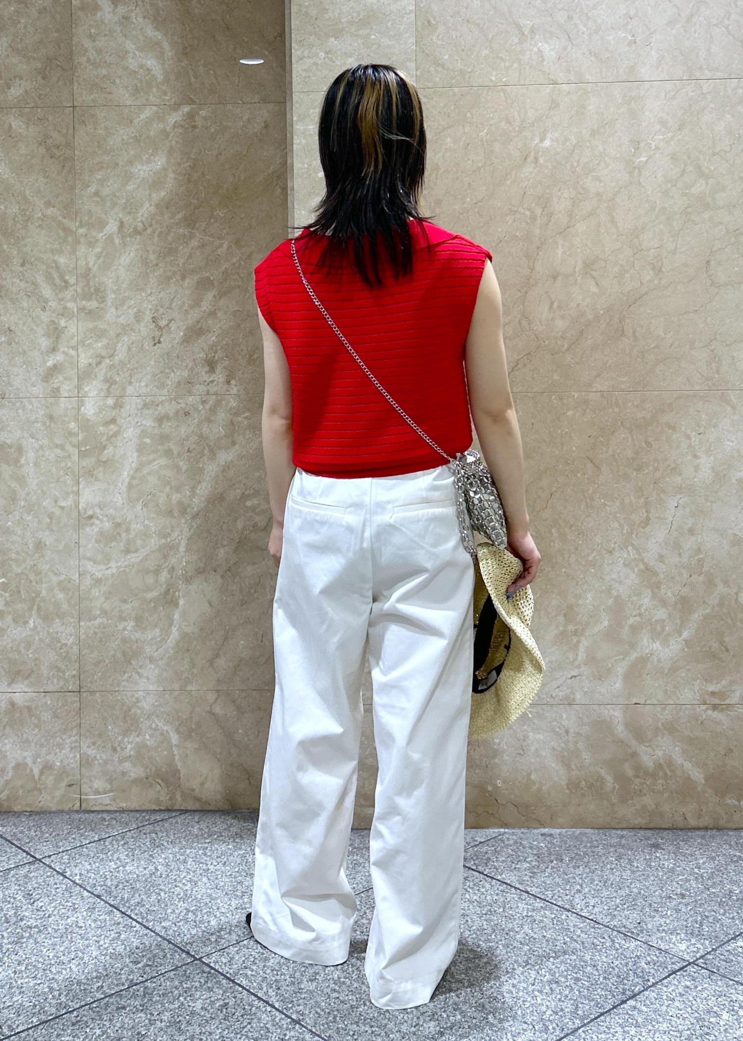 ウエストのボタンがベルトいらずで腰位置を高く見せてくれます◎