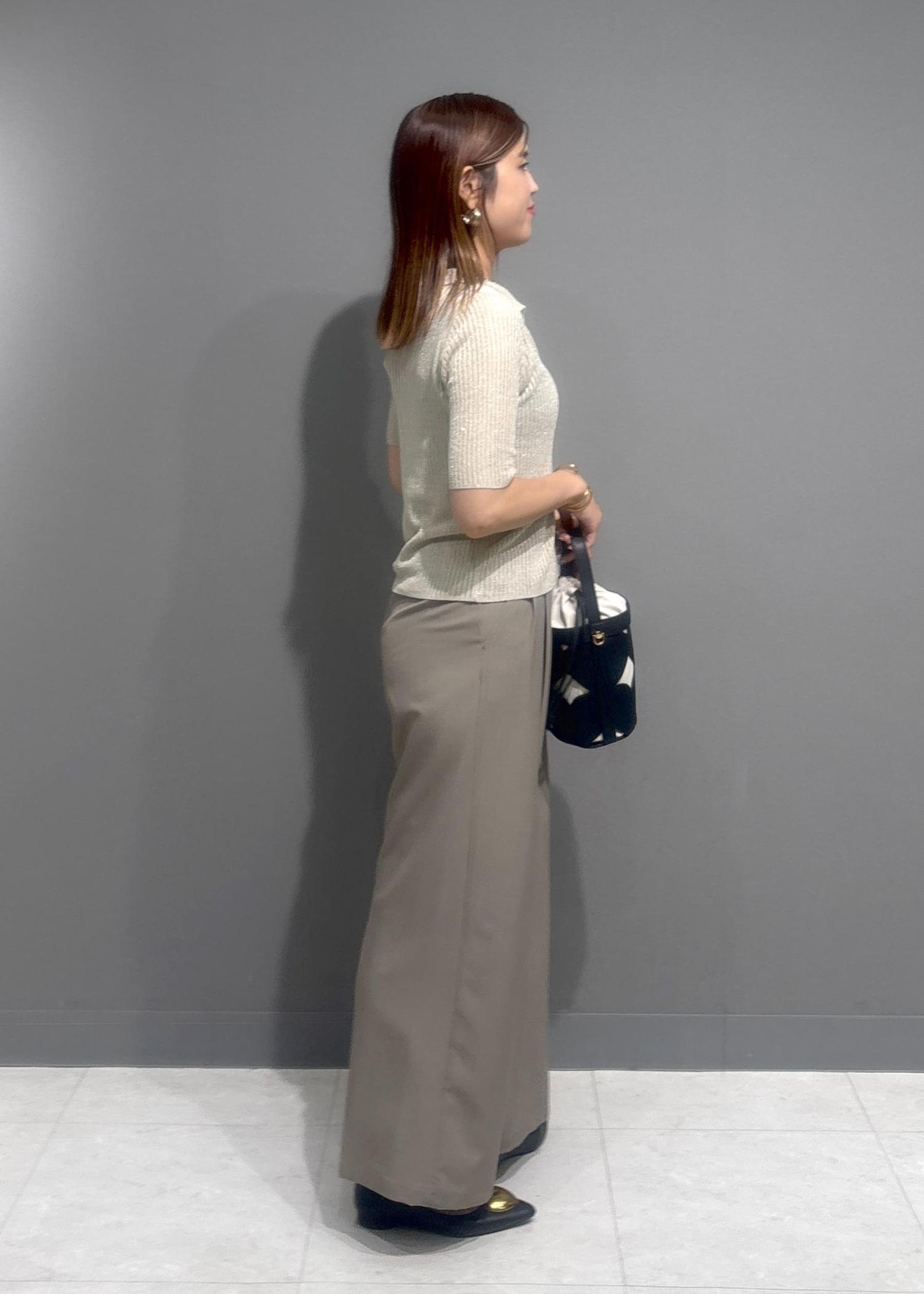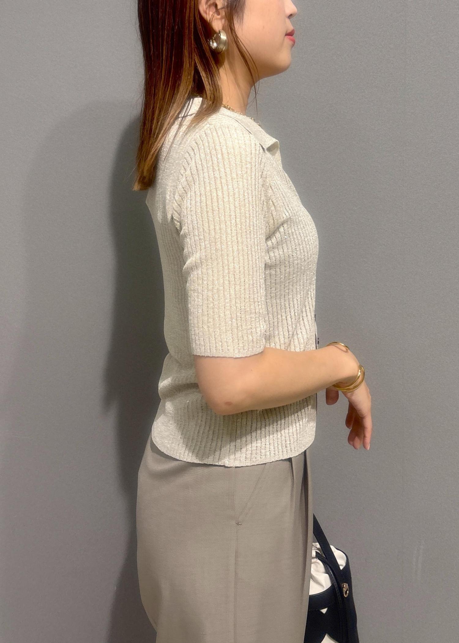 シンプルながらも、ラメ入りのカーディガンが華やかさをプラスしてくれます。