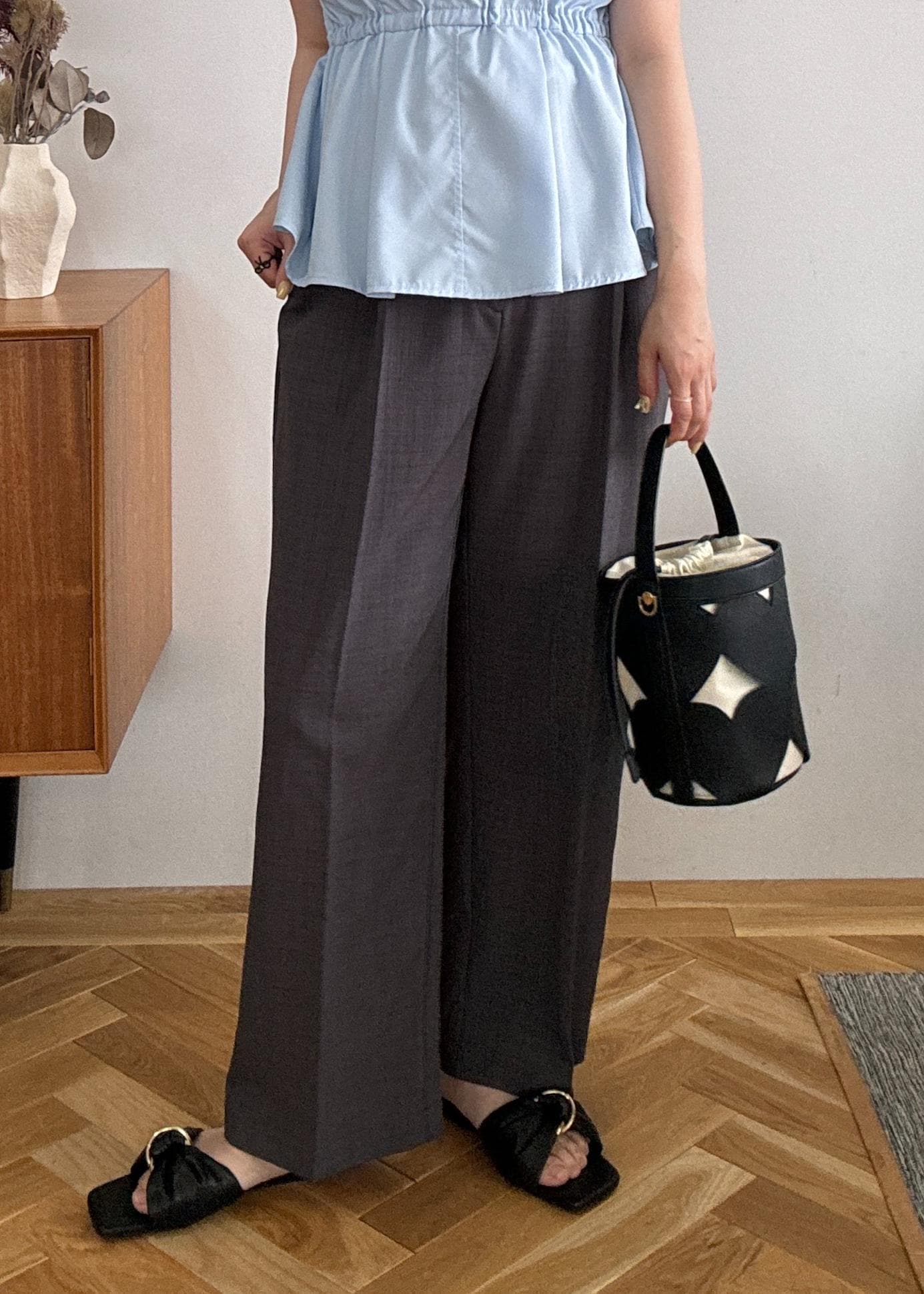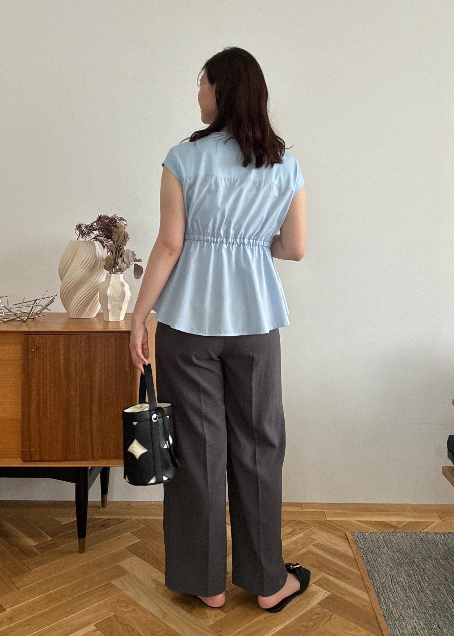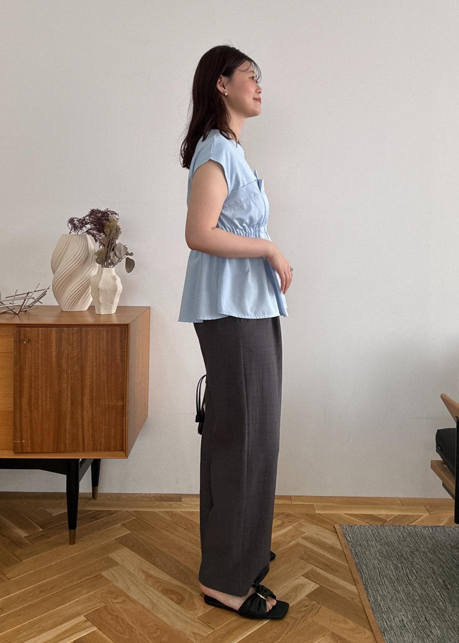 着映えするドッキングトップスは爽やかなブルーカラーに、パンツはチャコールのワイドパンツできれいめにこっくりとしたカラーを合わせて、大人な爽やかコーデにしてみました!