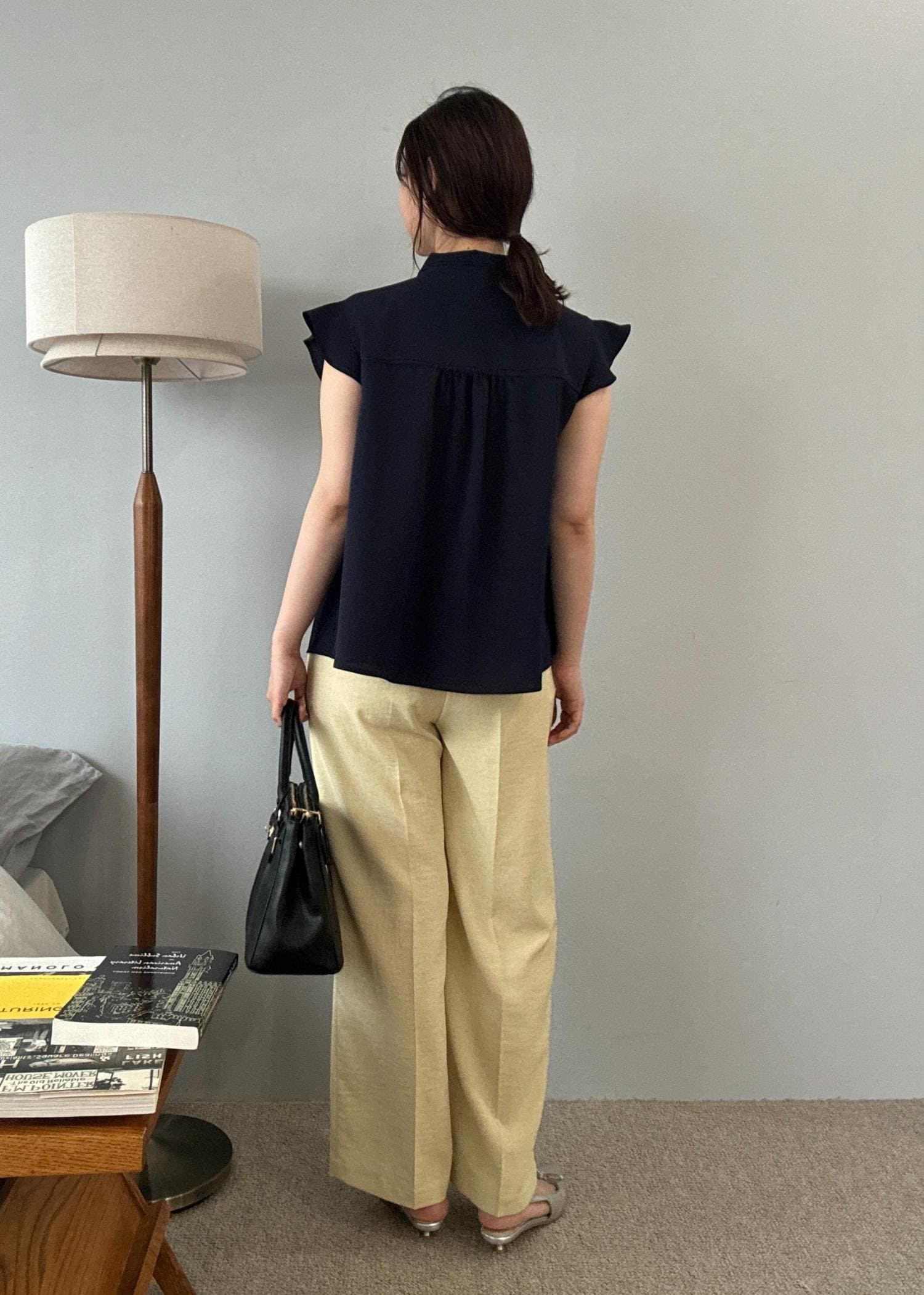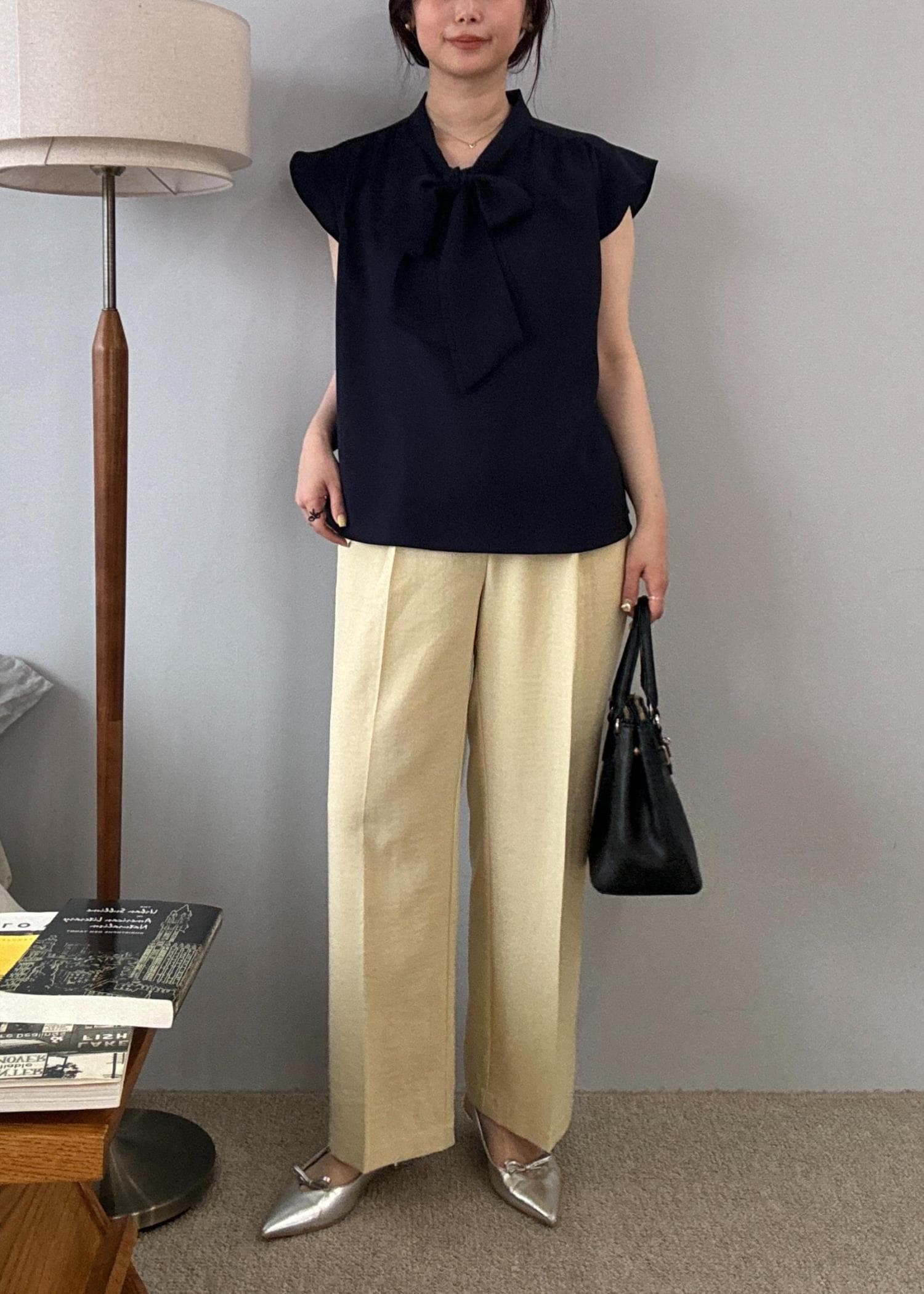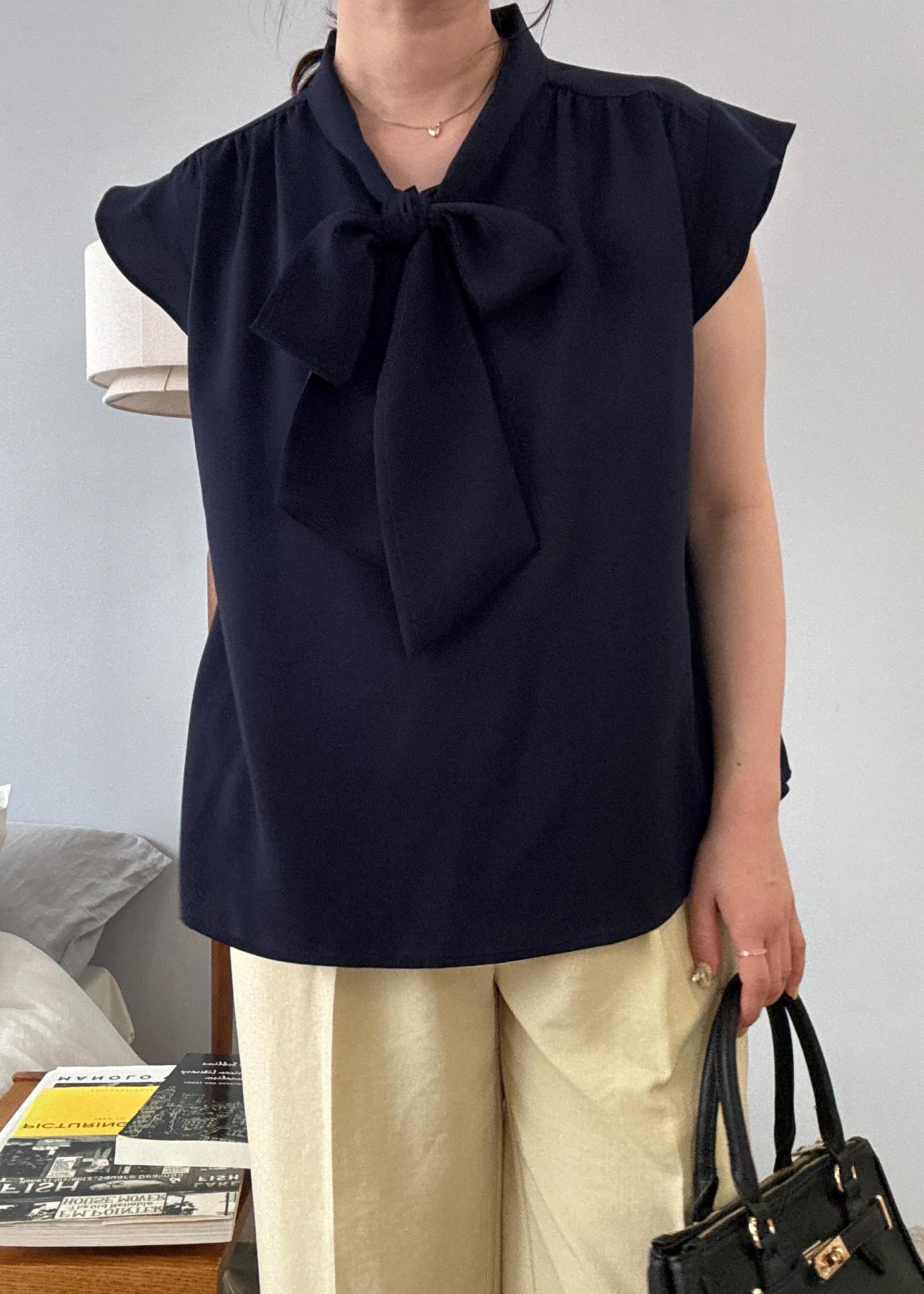 長さの調整が可能なリボンブラウスはネイビーで大人っぽく、機能性に優れたワイドパンツできれいめに快適なコーディネートで通勤時にもおすすめです!