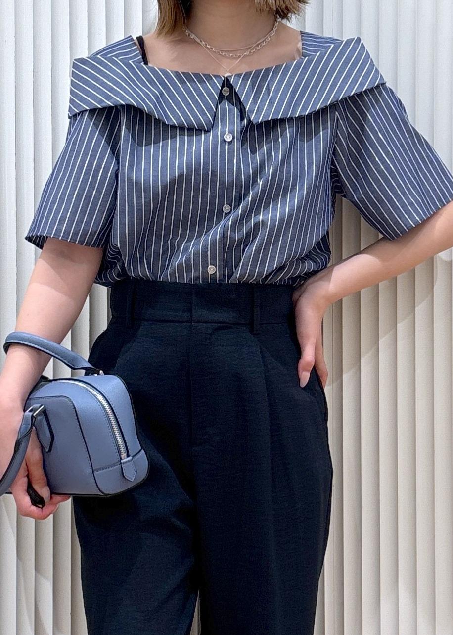 VIS【新色追加】【防シワ】ラメミックスオフショルダー風ストライプシャツブルー系 / F¥5,489レビューラメ感があって目を引くブラウスです!