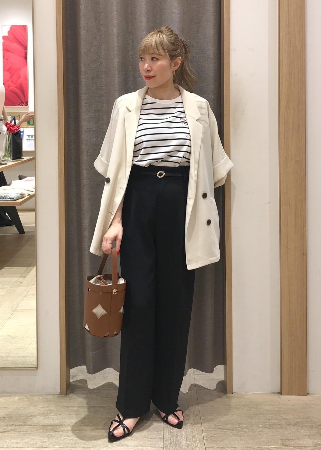 そこにアイボリーのダブルジャケットをさらっと羽織ることで、きちんと感と抜け感を両立させた大人のマリンスタイルに。