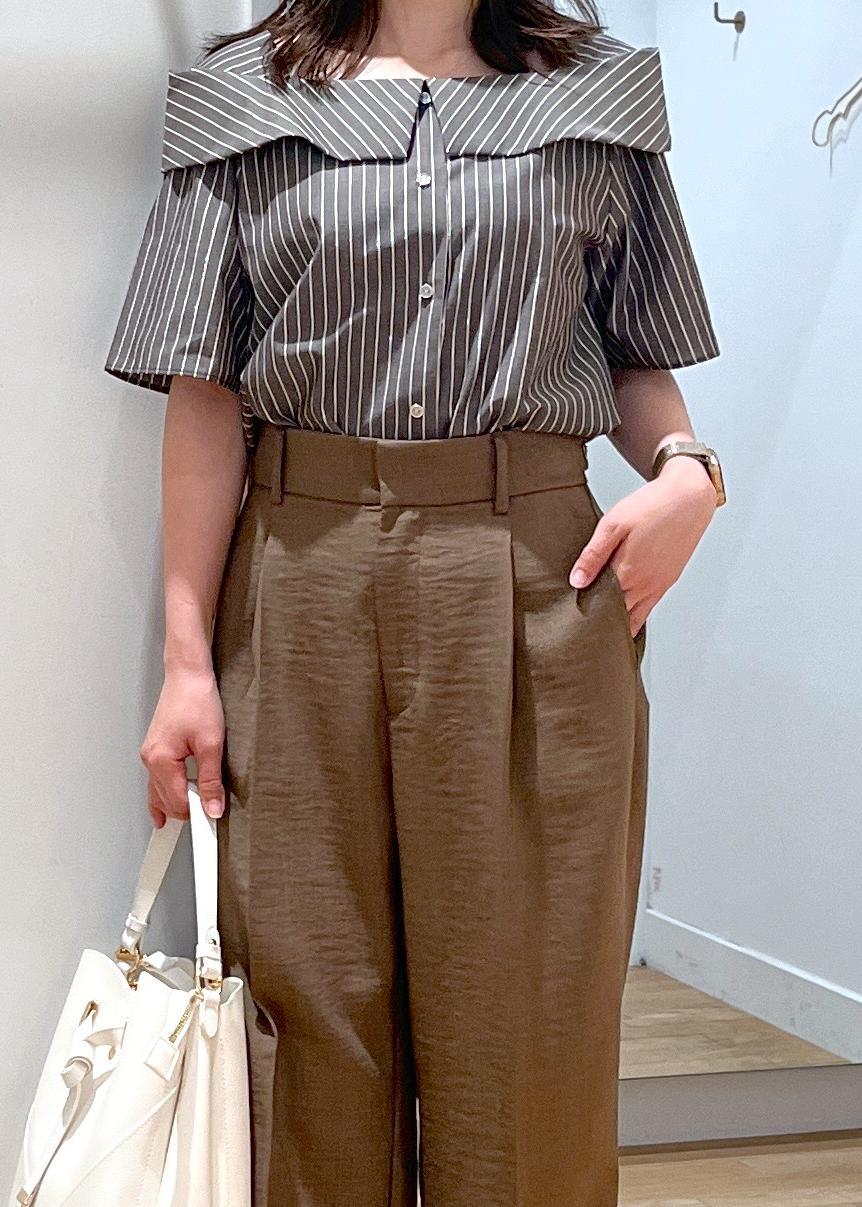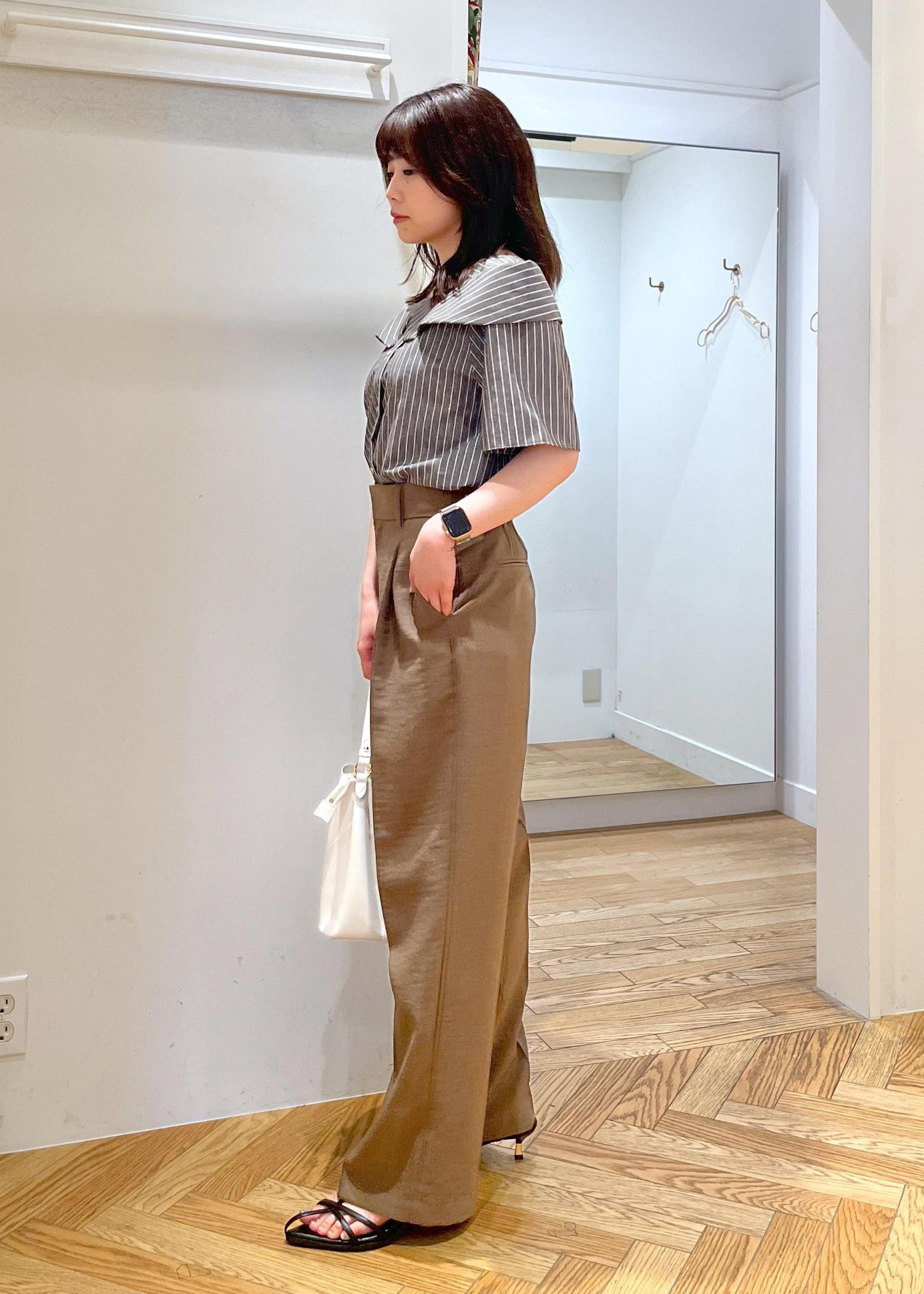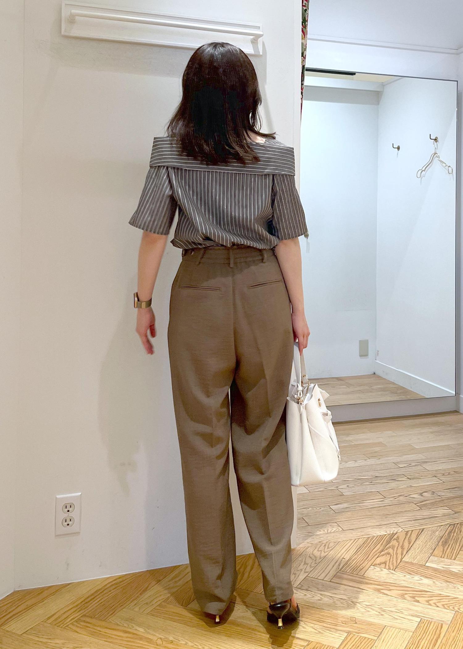 フェミニンなオフショル風ブラウスですが、コーディネートをブラウン系でまとめて大人っぽい雰囲気に。