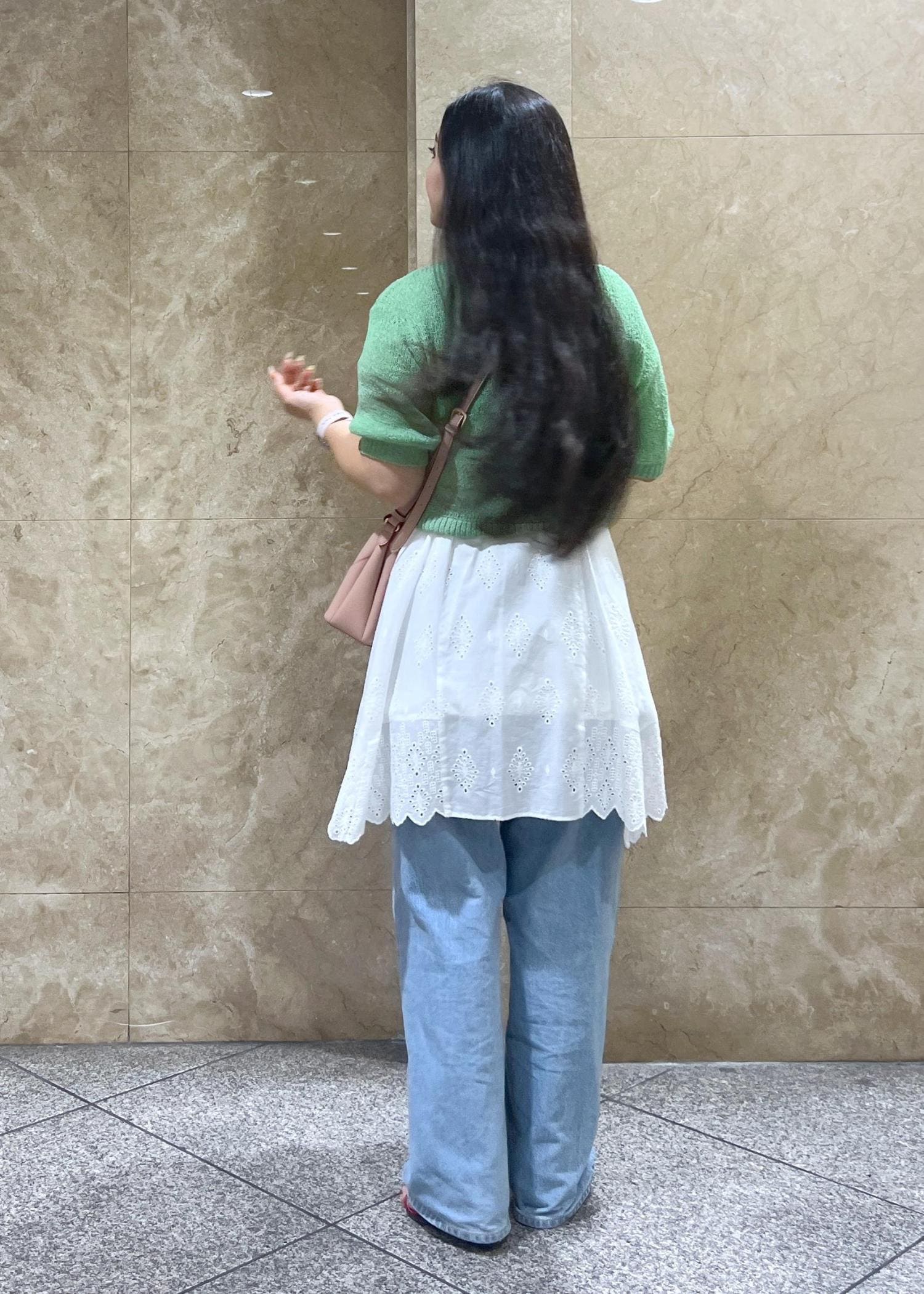 アウトレットVIS【洗える】アイレットブークレコンパクトニットライトグリーン / F¥2,633レビュー中のものが透け感が出るニットで、軽くて着やすいです!◎