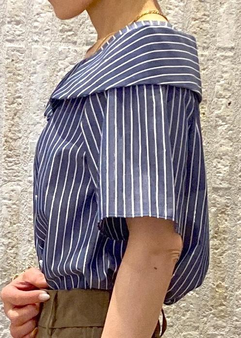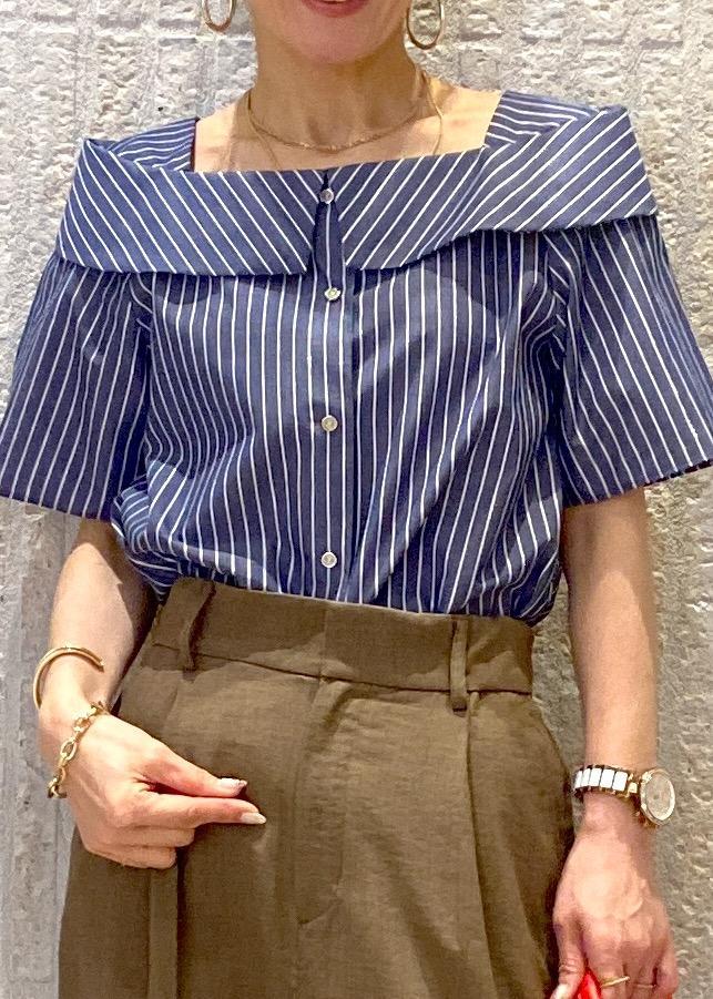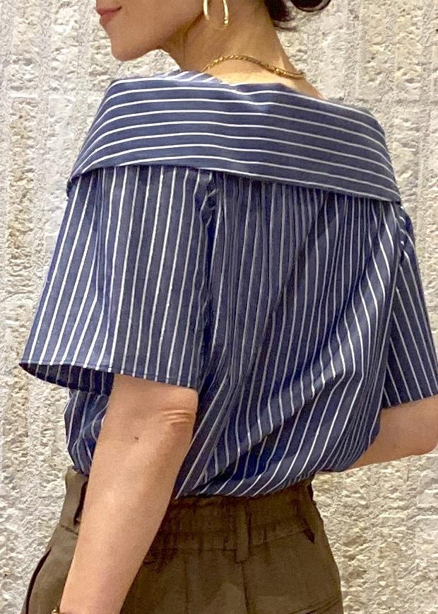 VIS【新色追加】【防シワ】ラメミックスオフショルダー風ストライプシャツブルー系 / F¥5,489レビューデザインがかわいいブラウスシャツ。スクエアネックがデコルテをキレイに見せてくれます☆