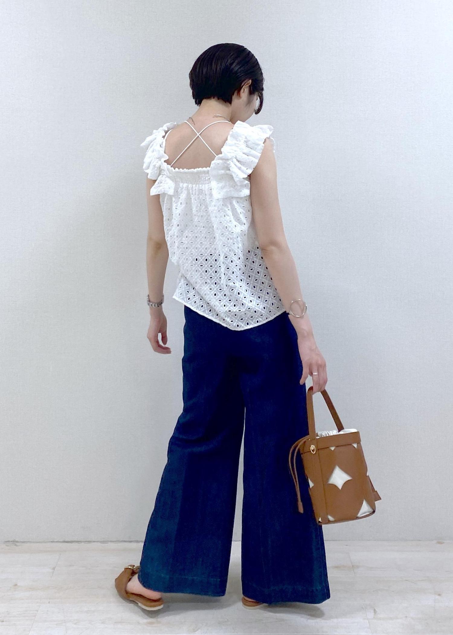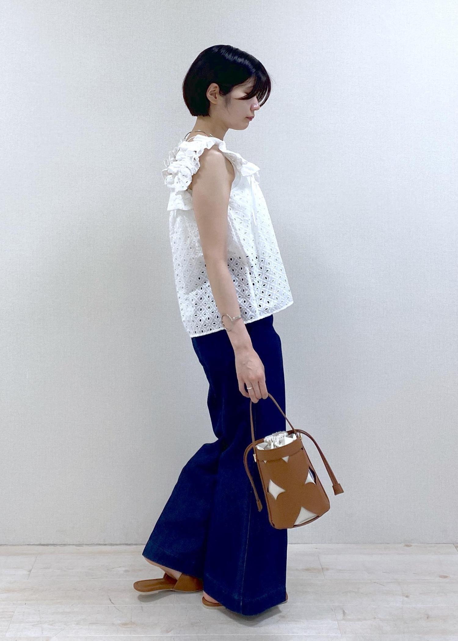 ブラウスは2wayでフリル部分を落としてオフショルとしても着られます。
