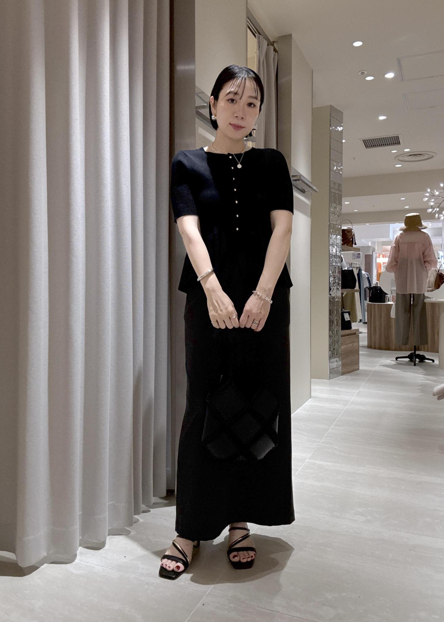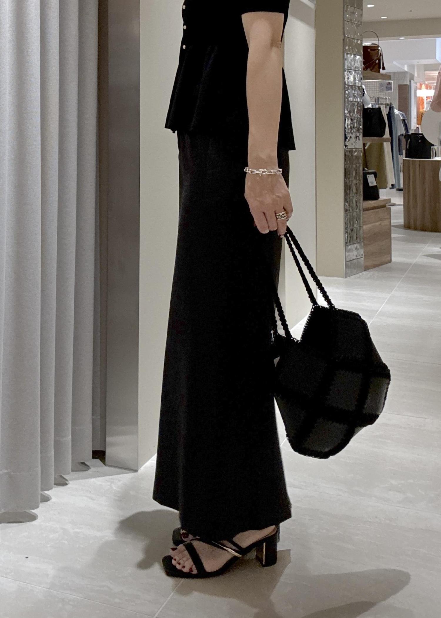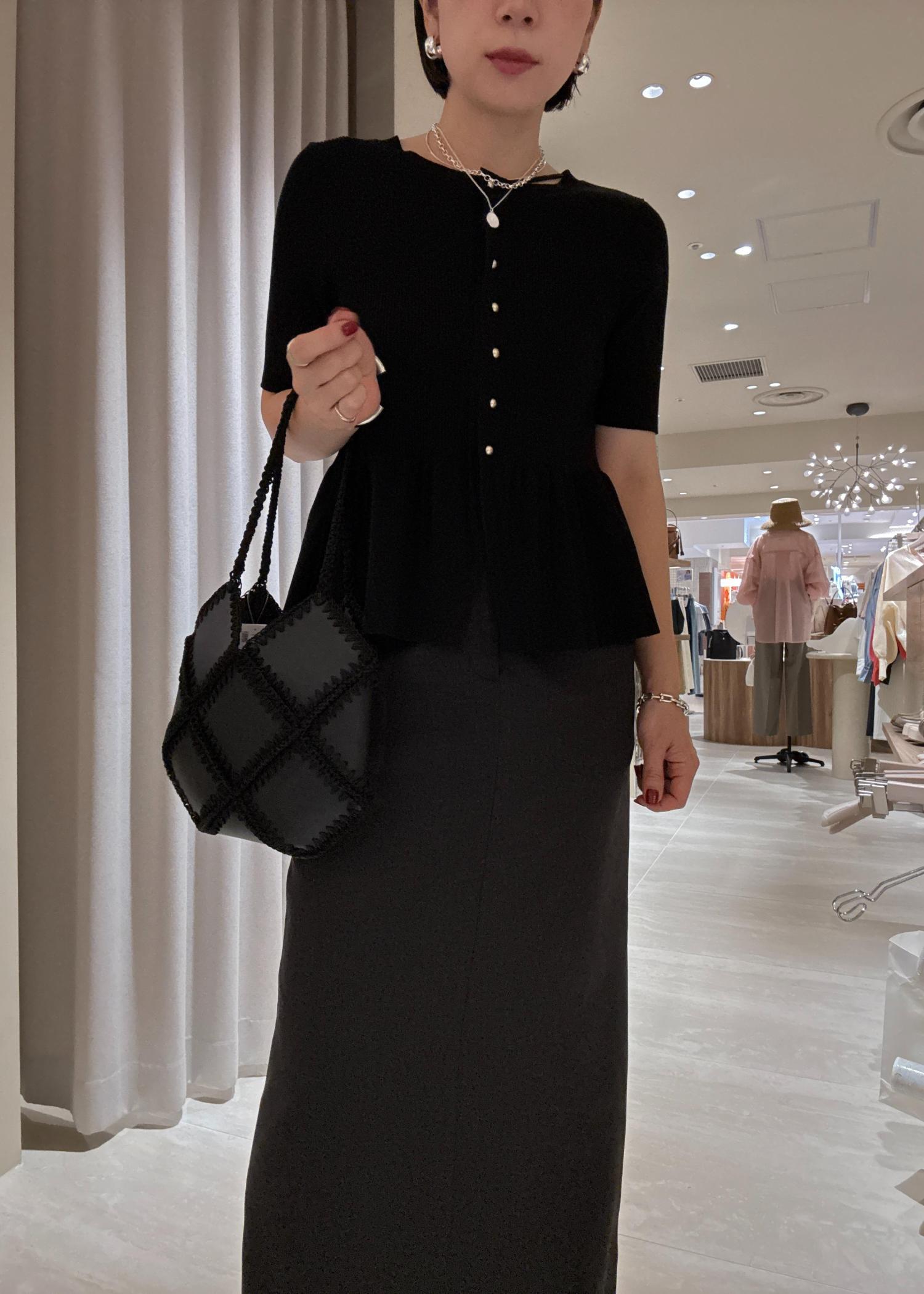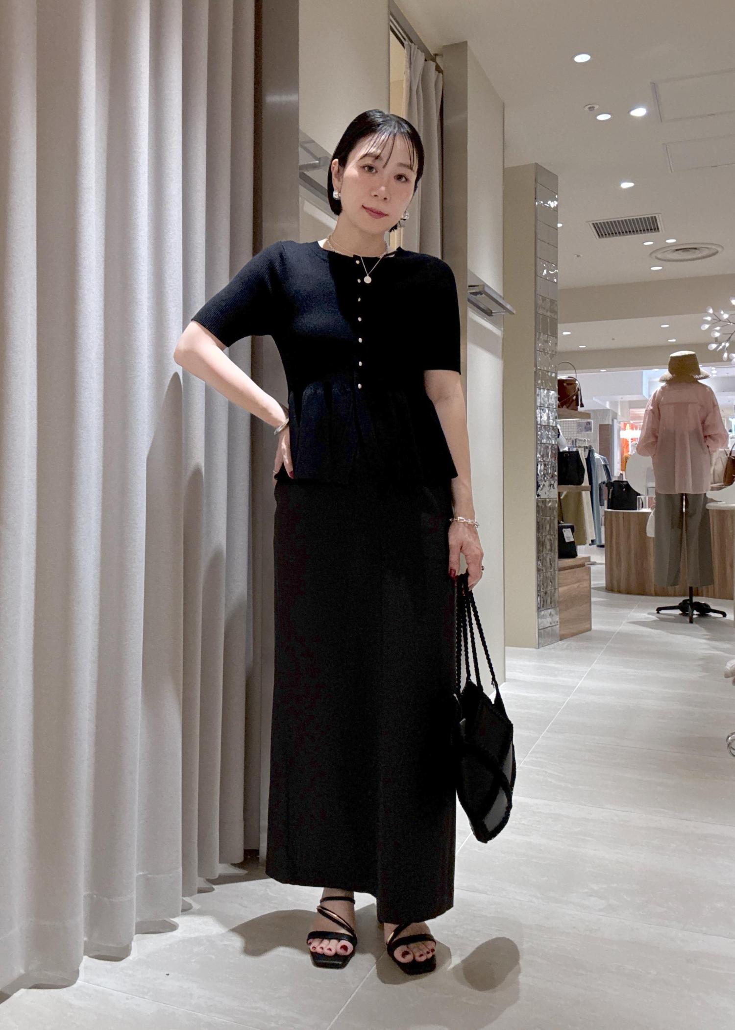 夏のブラックコーデですが、半袖ニットだったり足元のサンダルで抜け感あり重たくなりすぎないです♪
