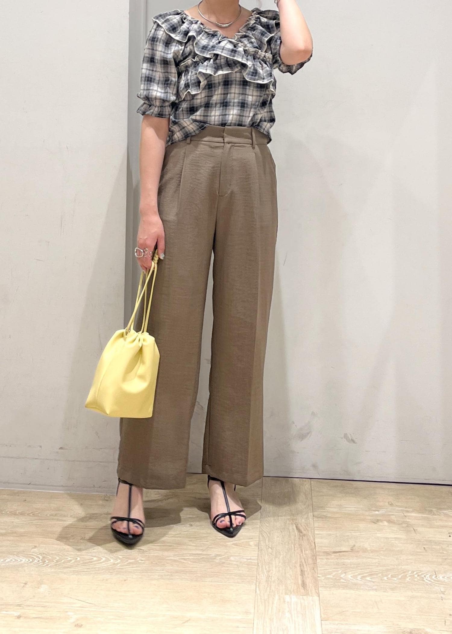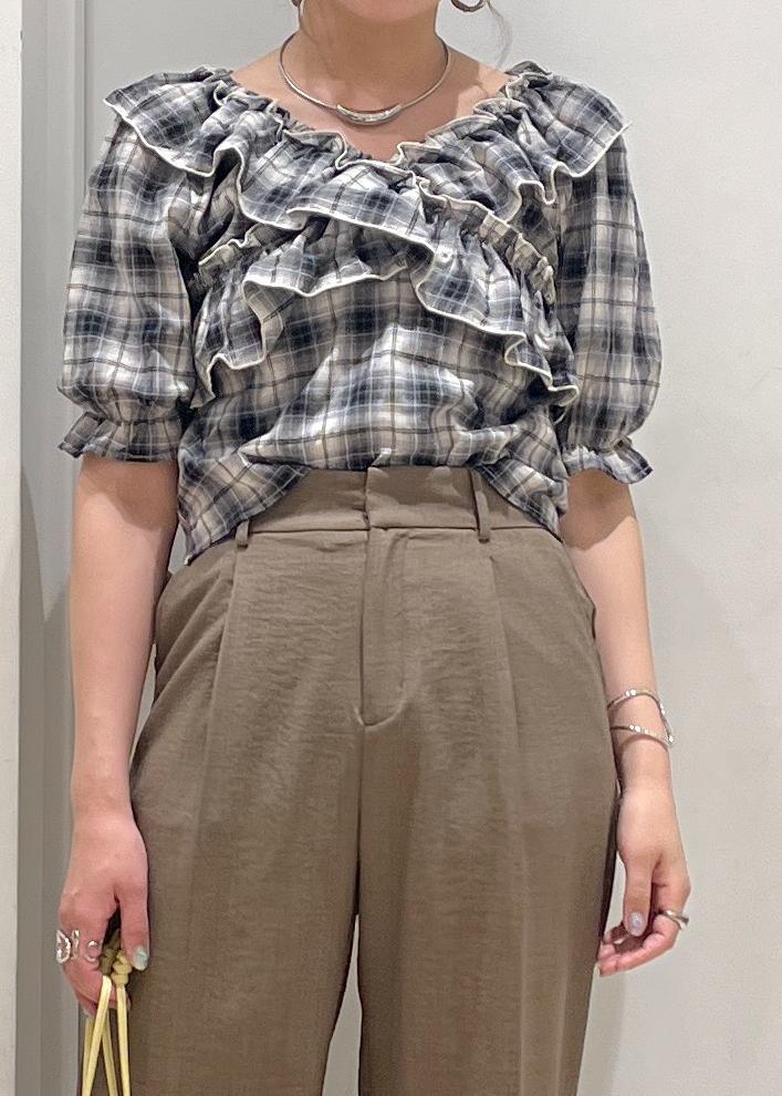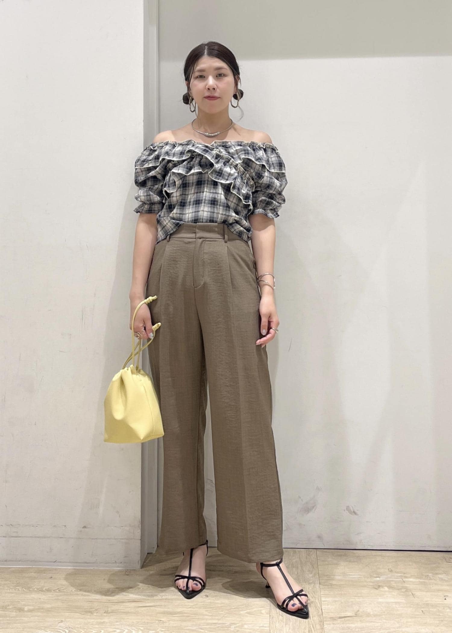 オフショルにもなるクロスデザインとフリル感が可愛いチェックブラウスに安定の美easyパンツ合わせがいい感じ☺︎