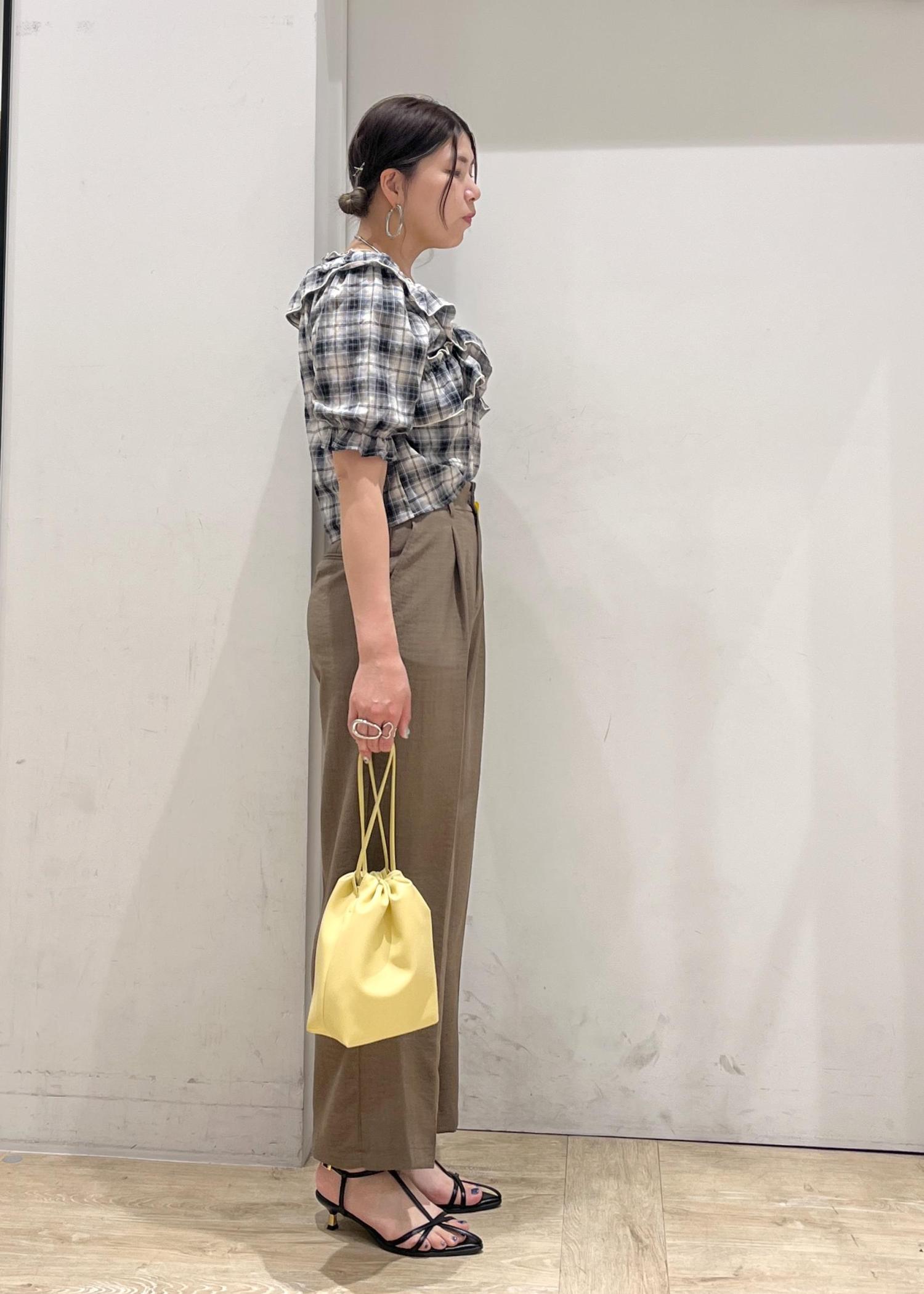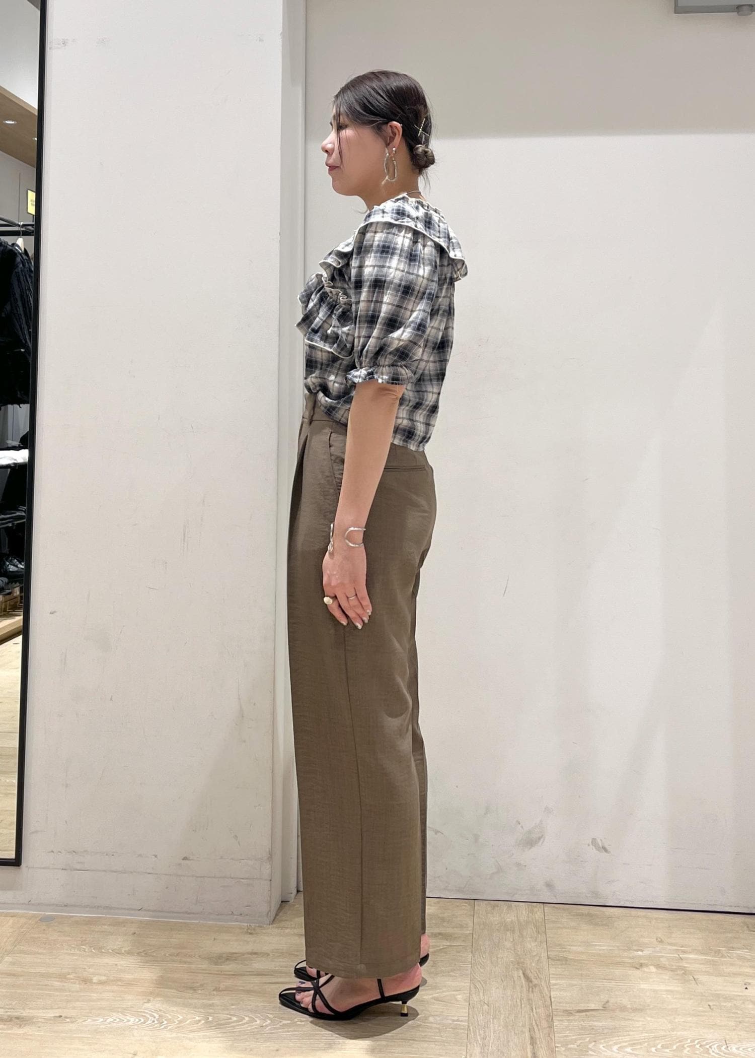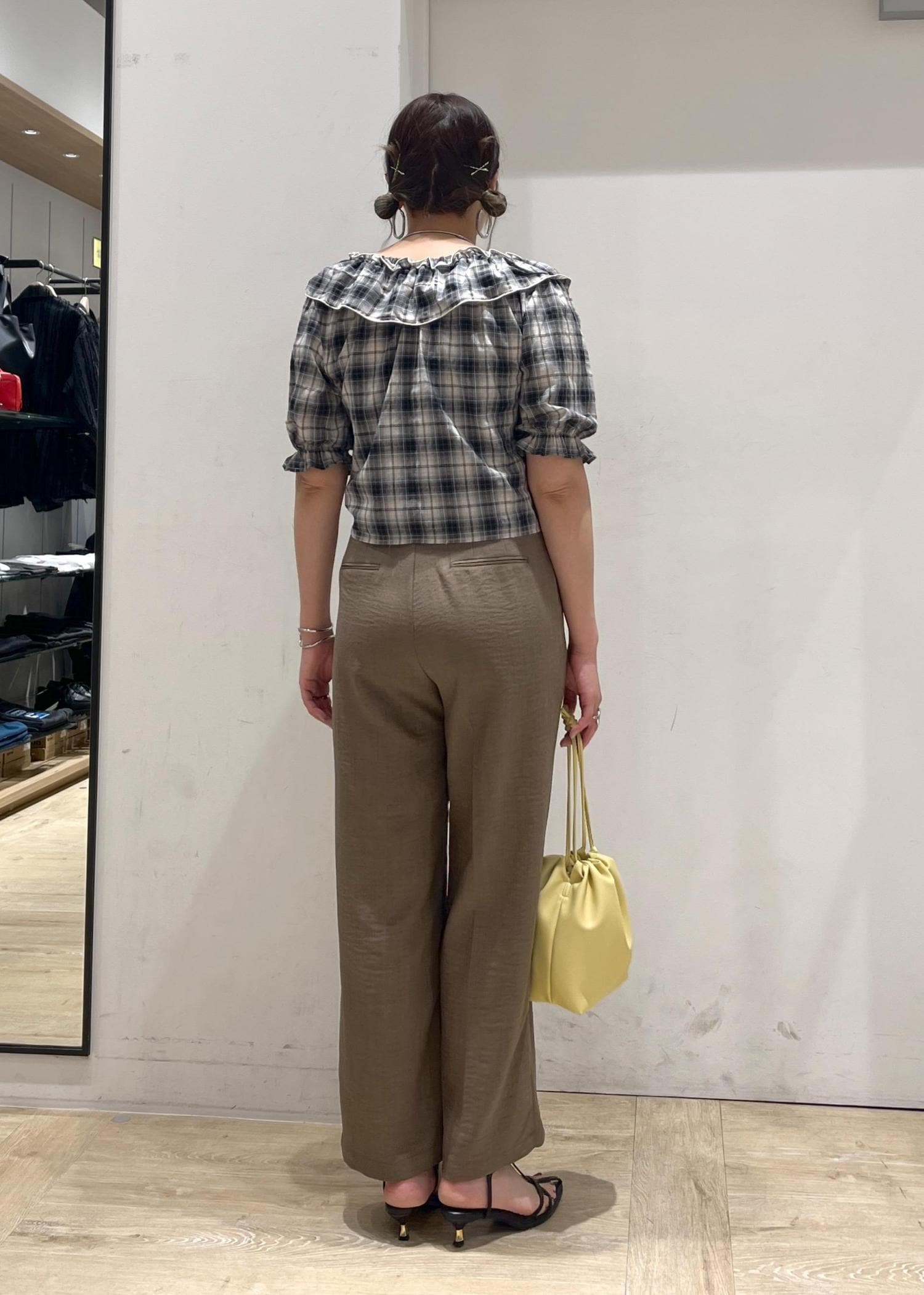 オフショルにもなるクロスデザインとフリル感が可愛いチェックブラウスに安定の美easyパンツ合わせがいい感じ☺︎