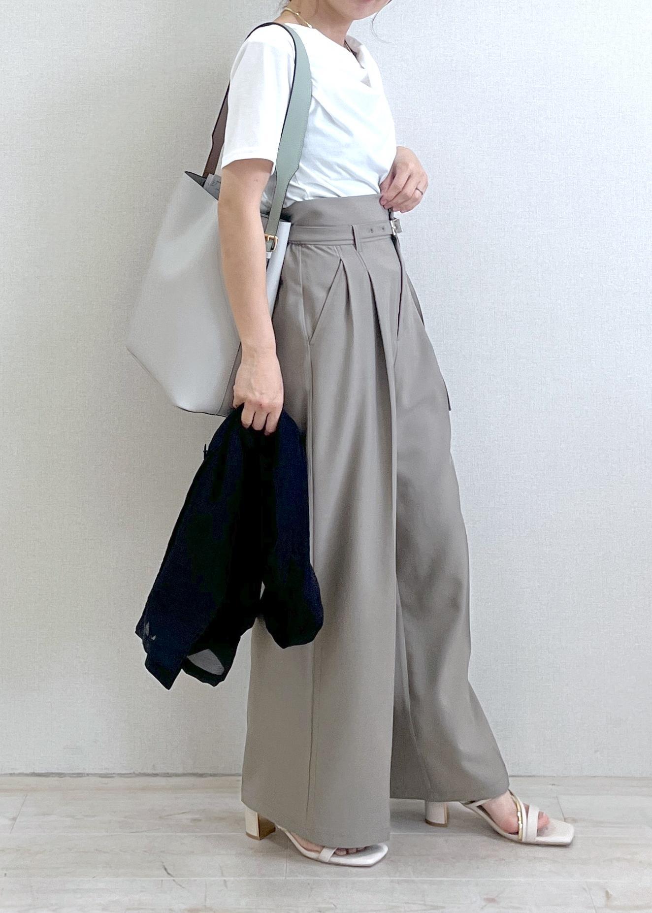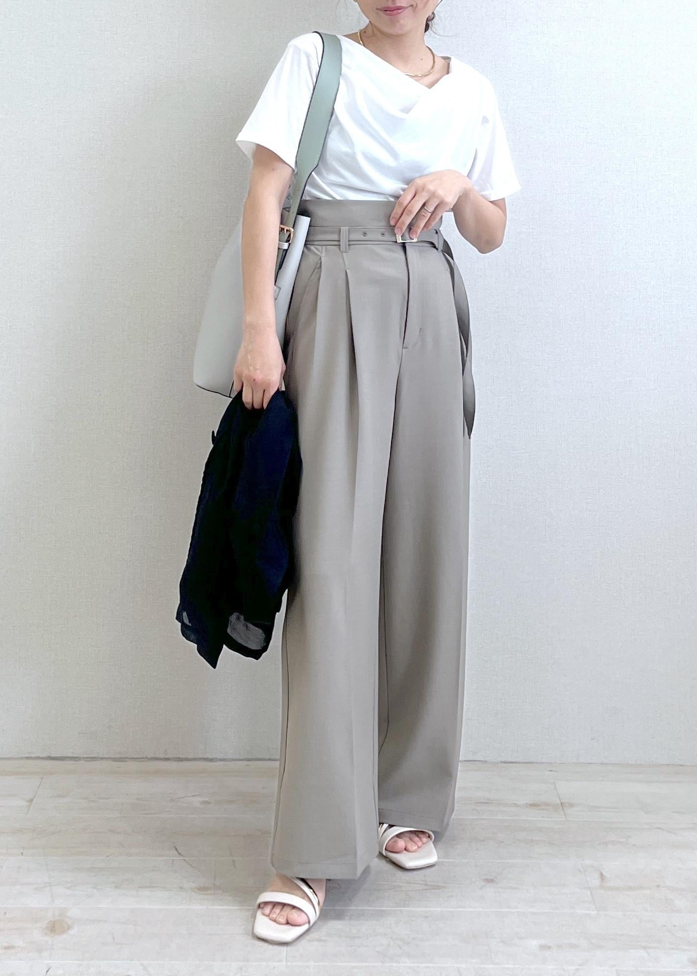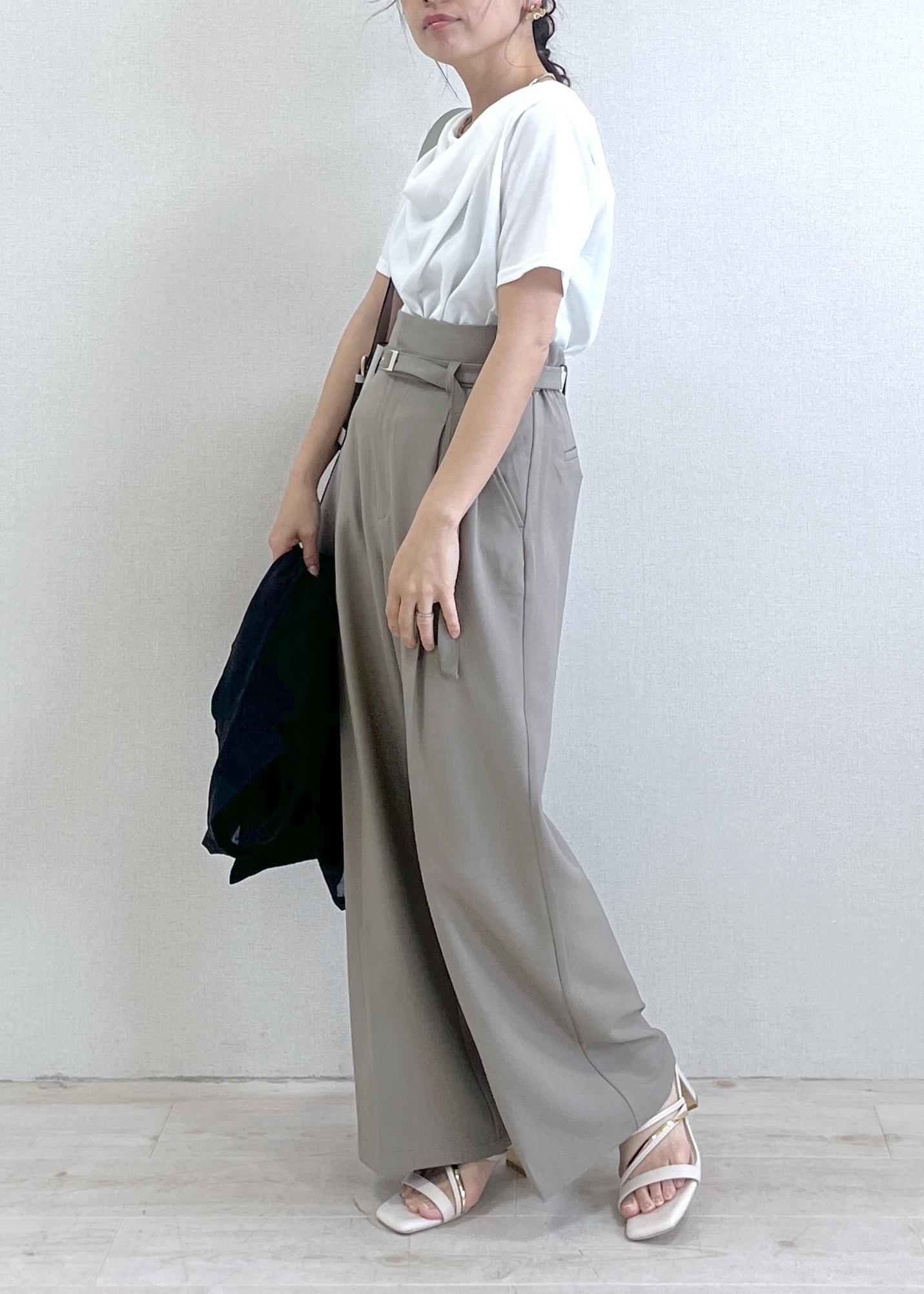 ニュアンスのあるドレープTに、ウエストマークが効いたタックパンツを合わせてクリーンな雰囲気に