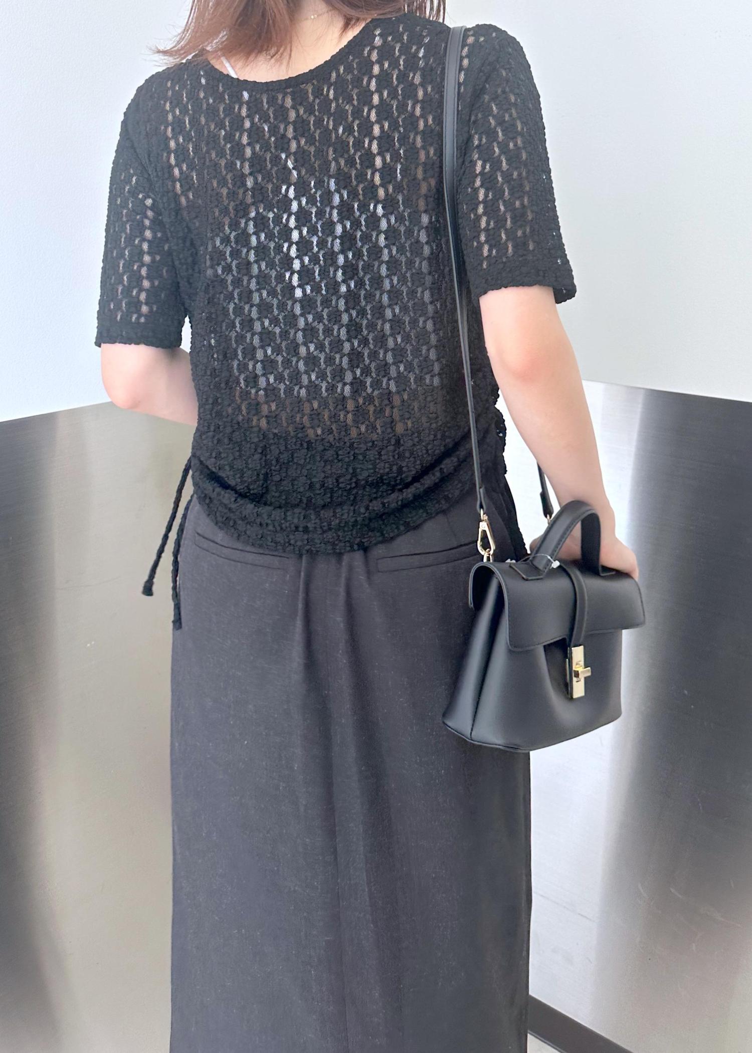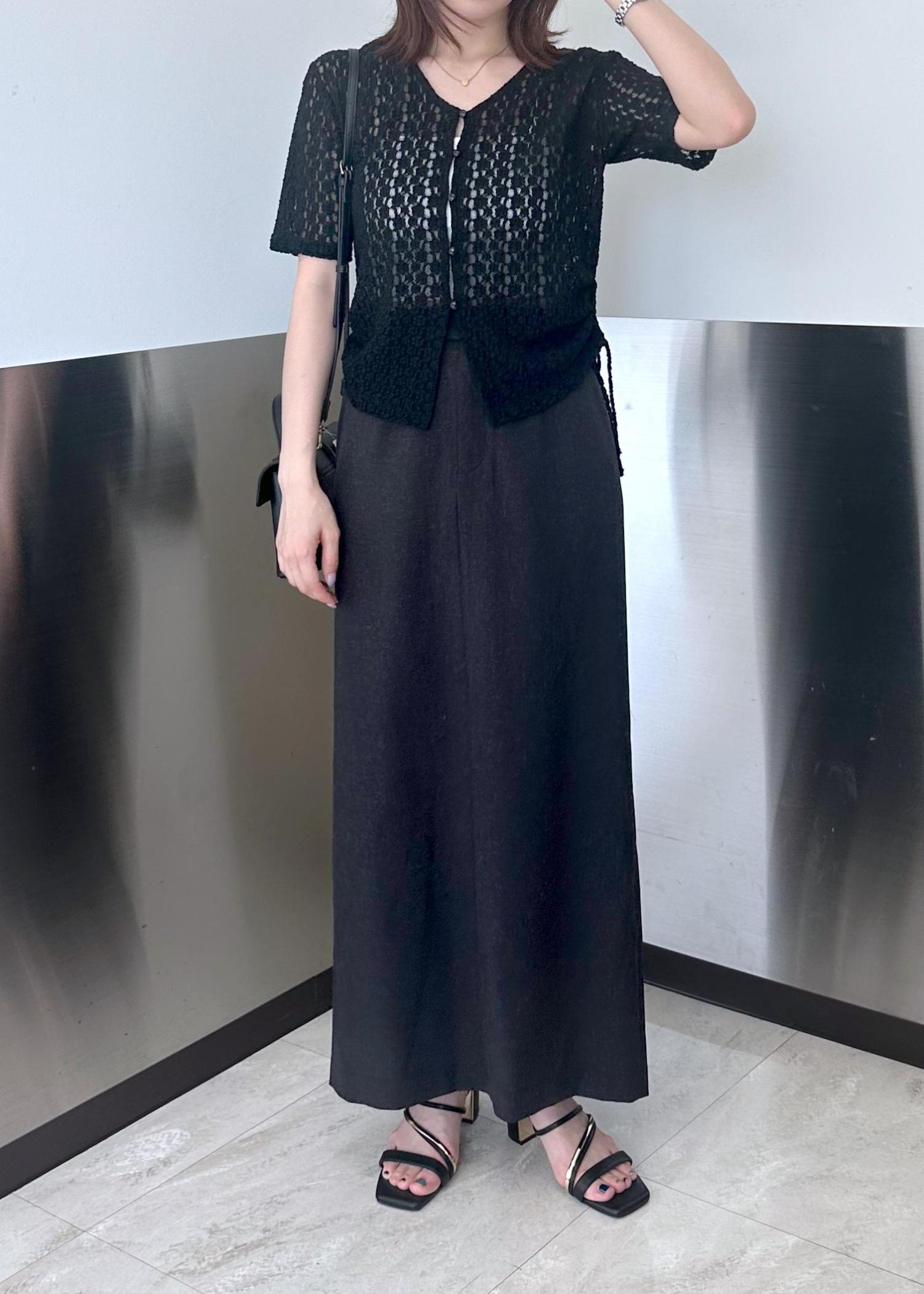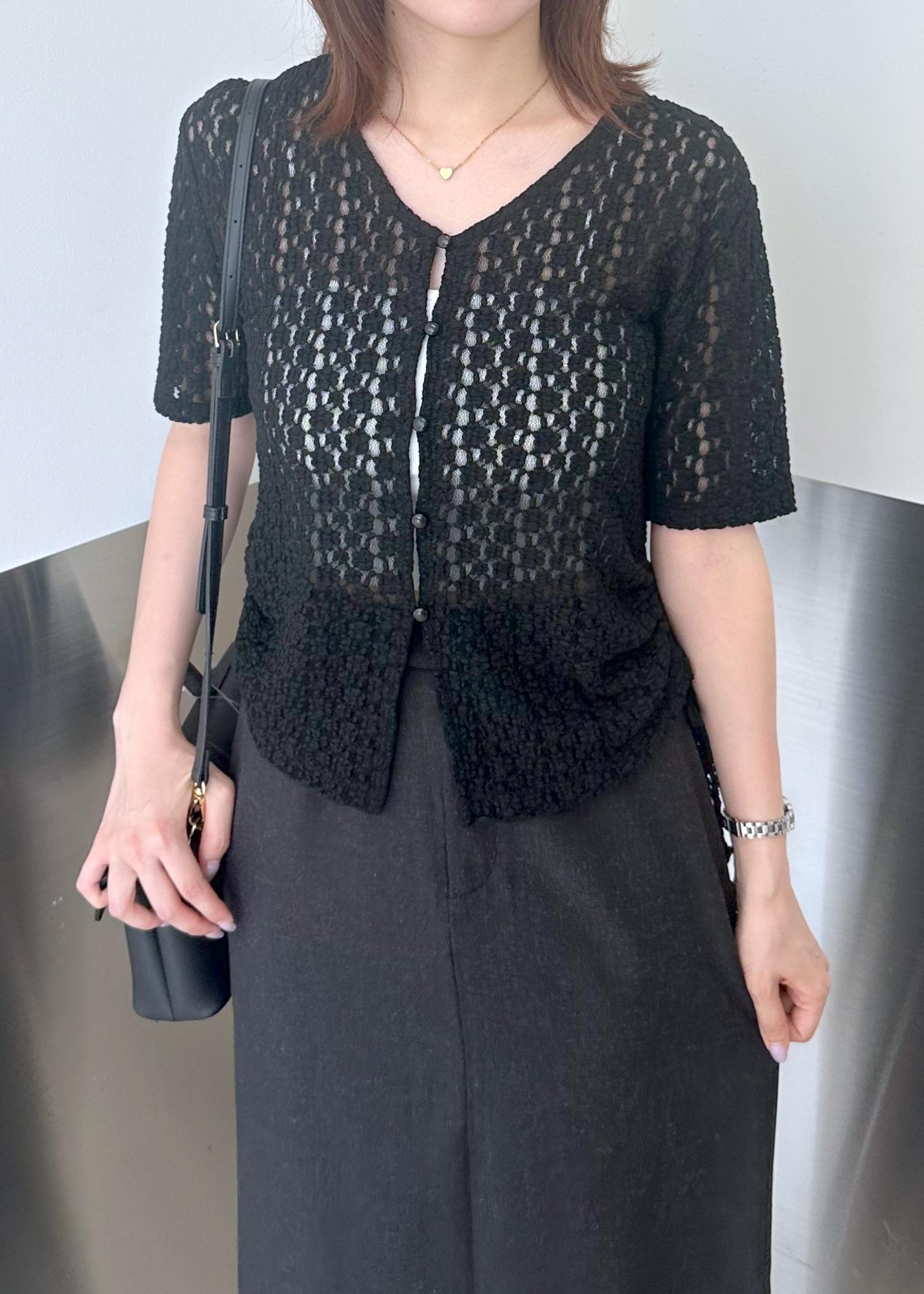 アウトレットVIS【WEB/一部店舗限定】裾サイドドロストレースカーディガンブラック / F¥4,391レビューサイドがドロストになっているので丈感も調節でき、ボトムを選ばず合わせやすいレースカーディガンです。