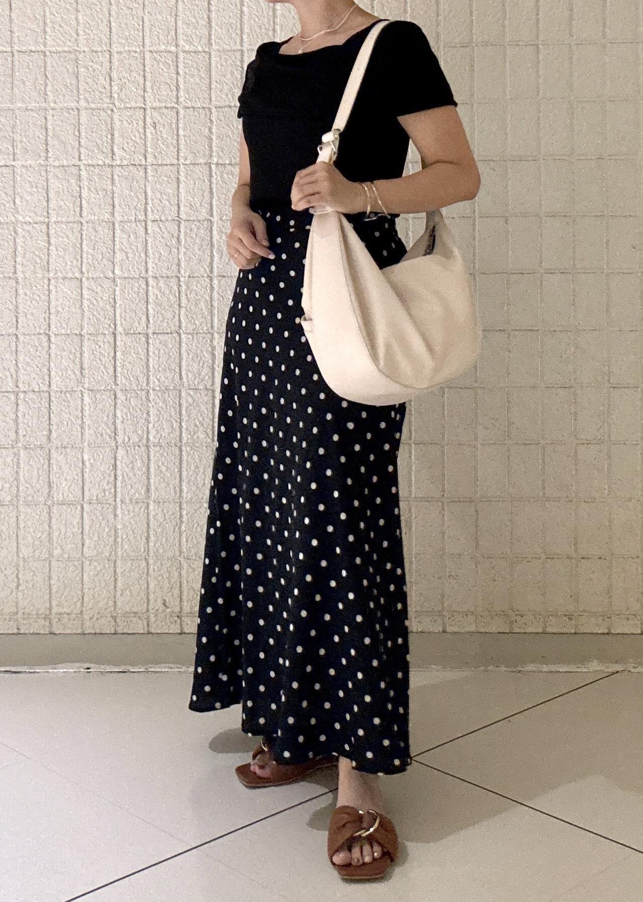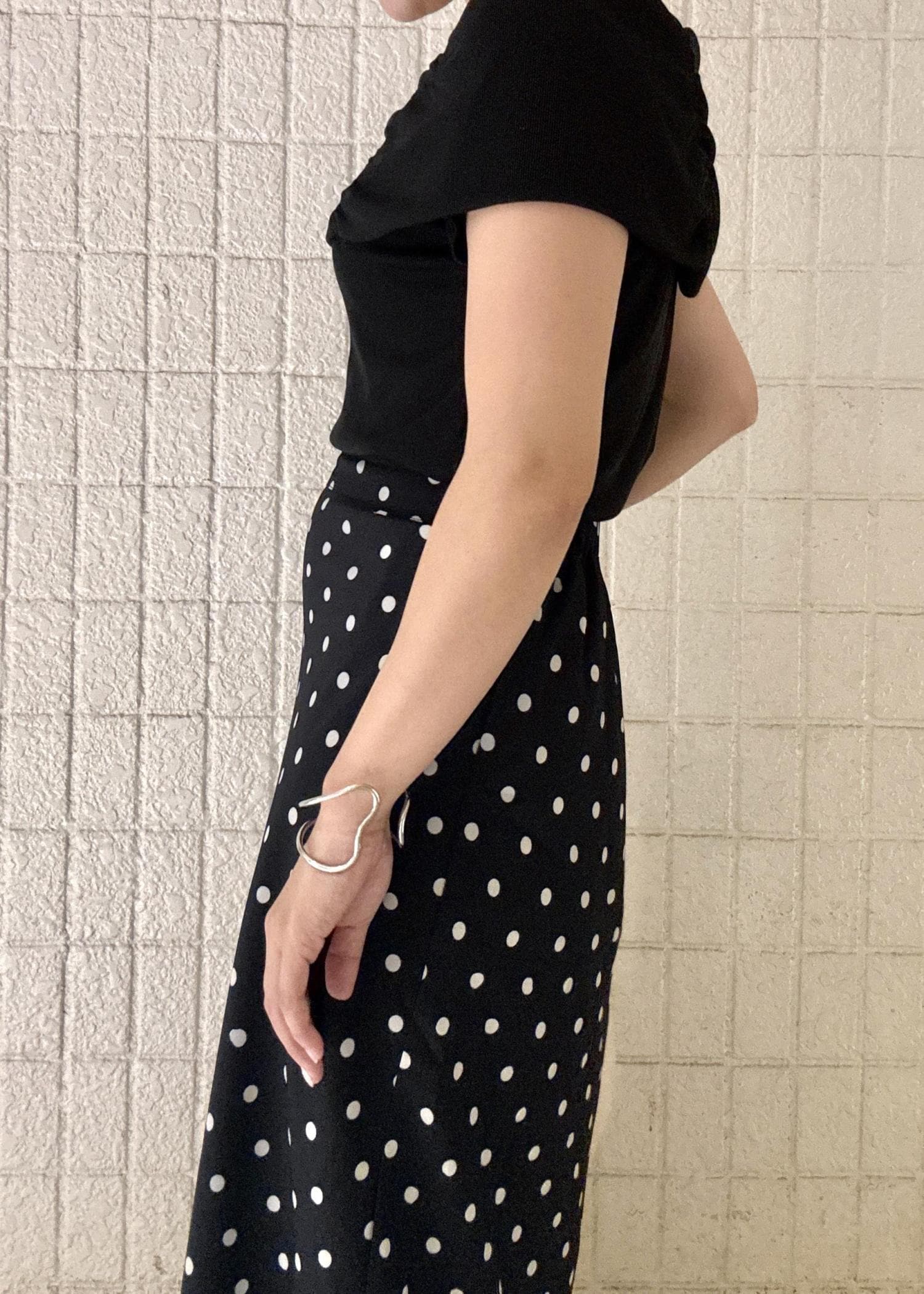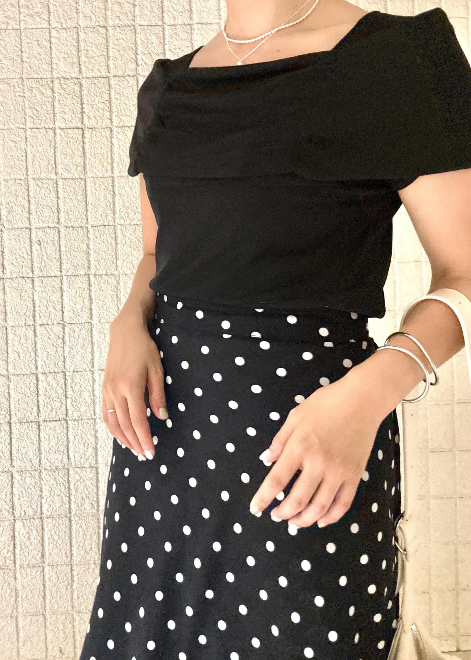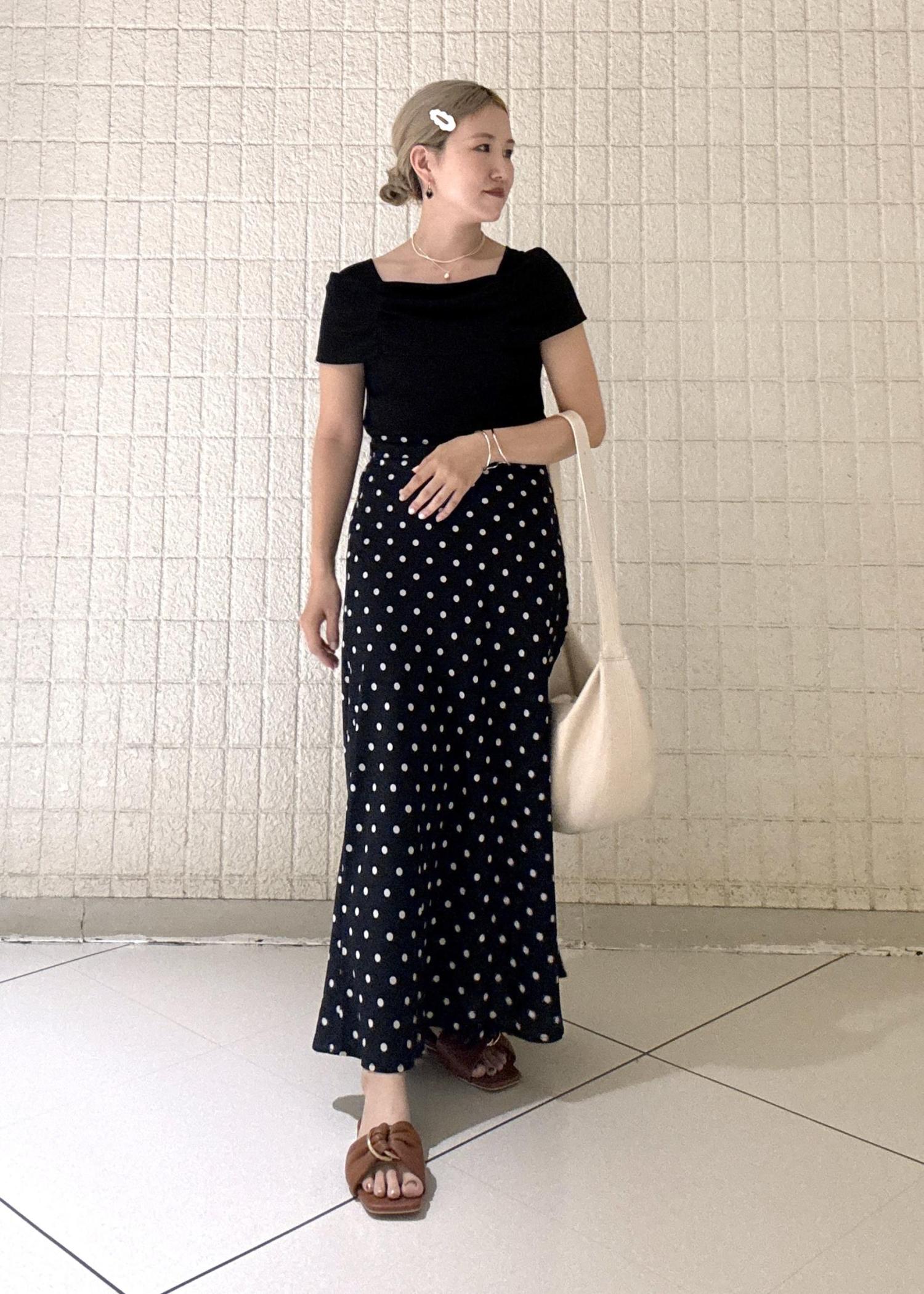 ドット柄のスカートも甘さがあるのでアクセサリーはシルバーで甘さを抑えました。