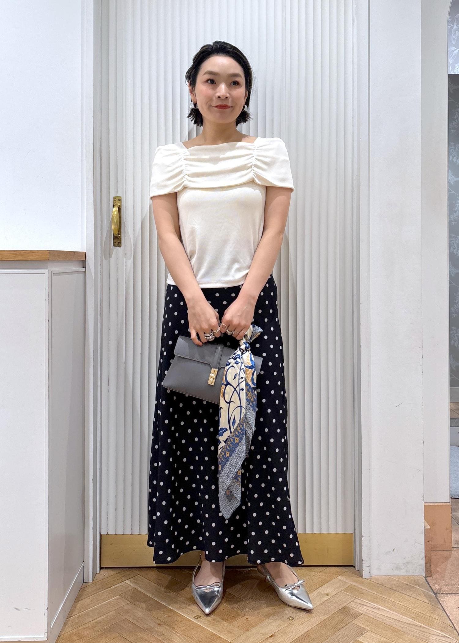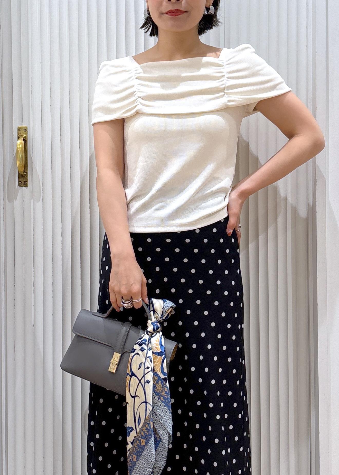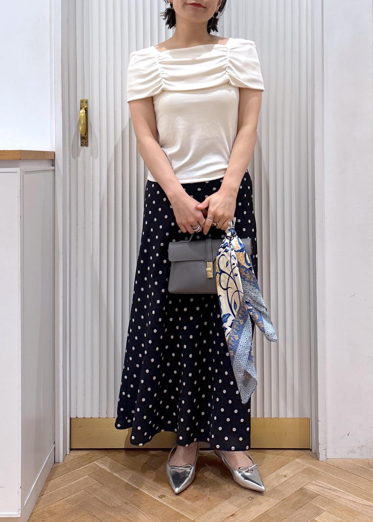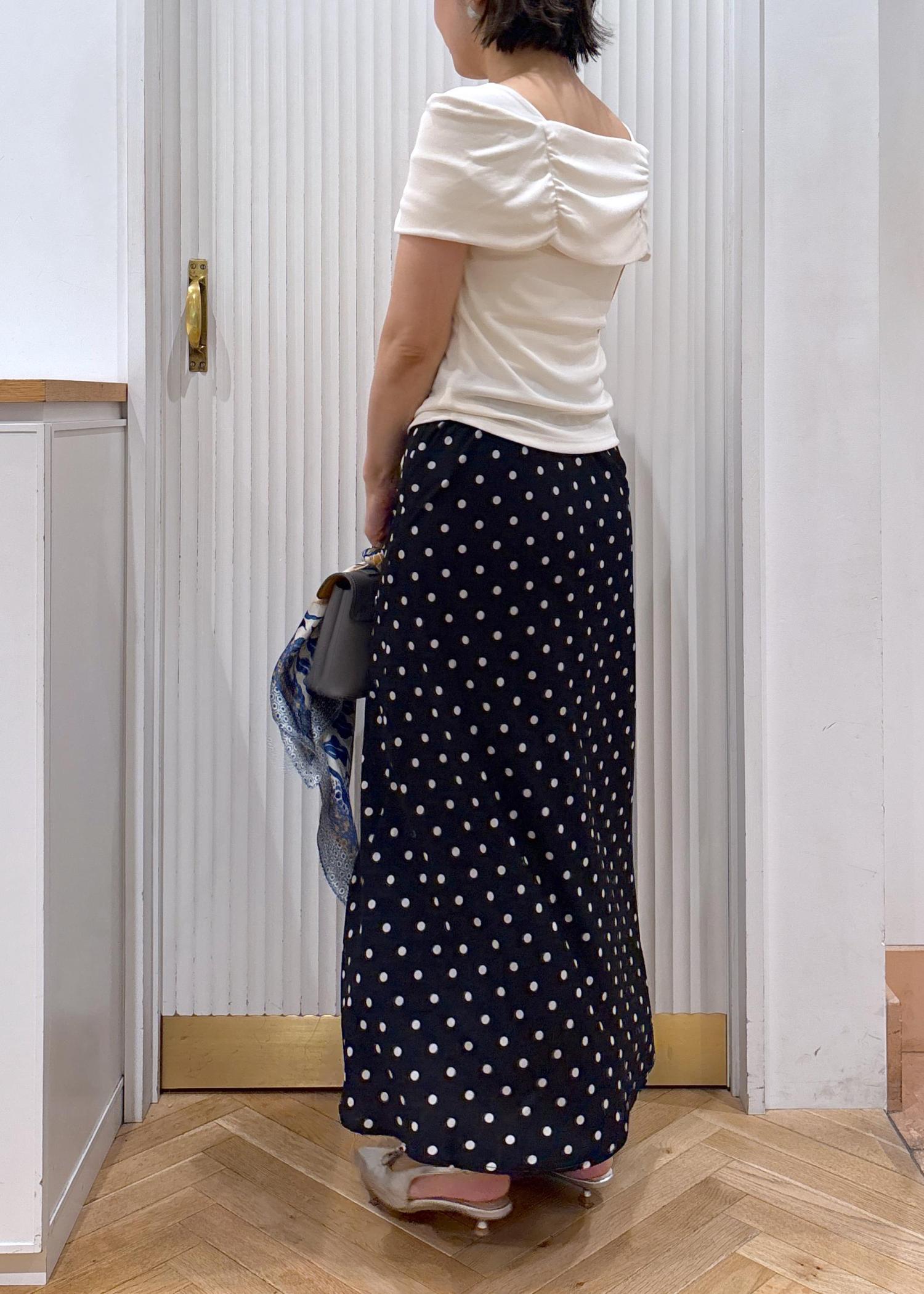 オフショルなのに肩がずり落ちない!洗えて、着映えて、しかもプチプラ♡ブラックもブラウンもめちゃくちゃ可愛いけど、まずはオフホワイトとドットのスカートで大人のモノトーンスタイリングです♫