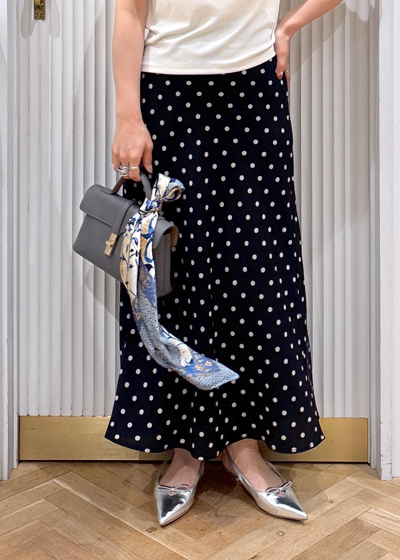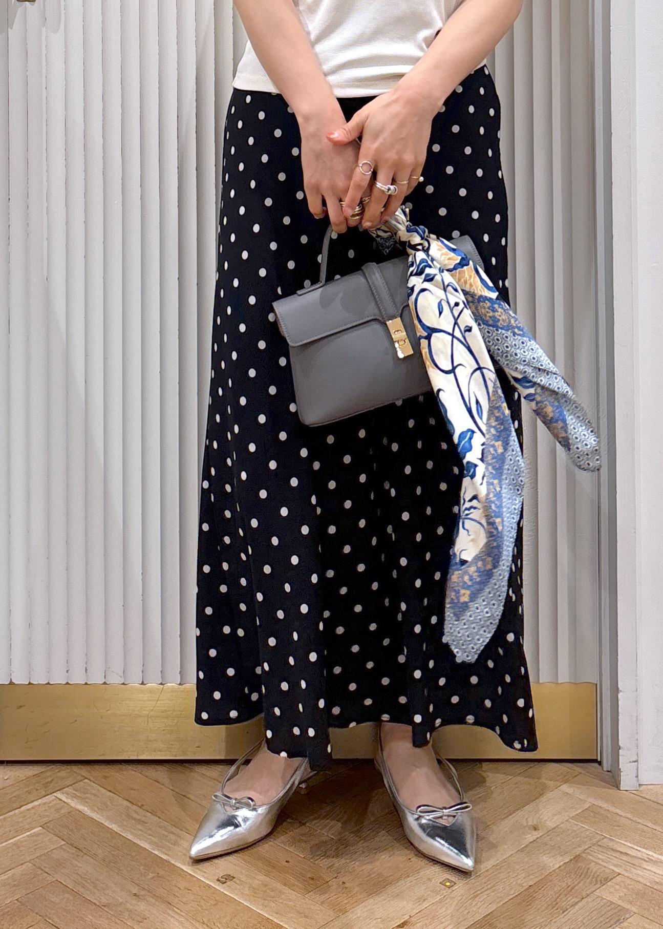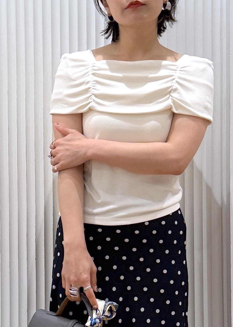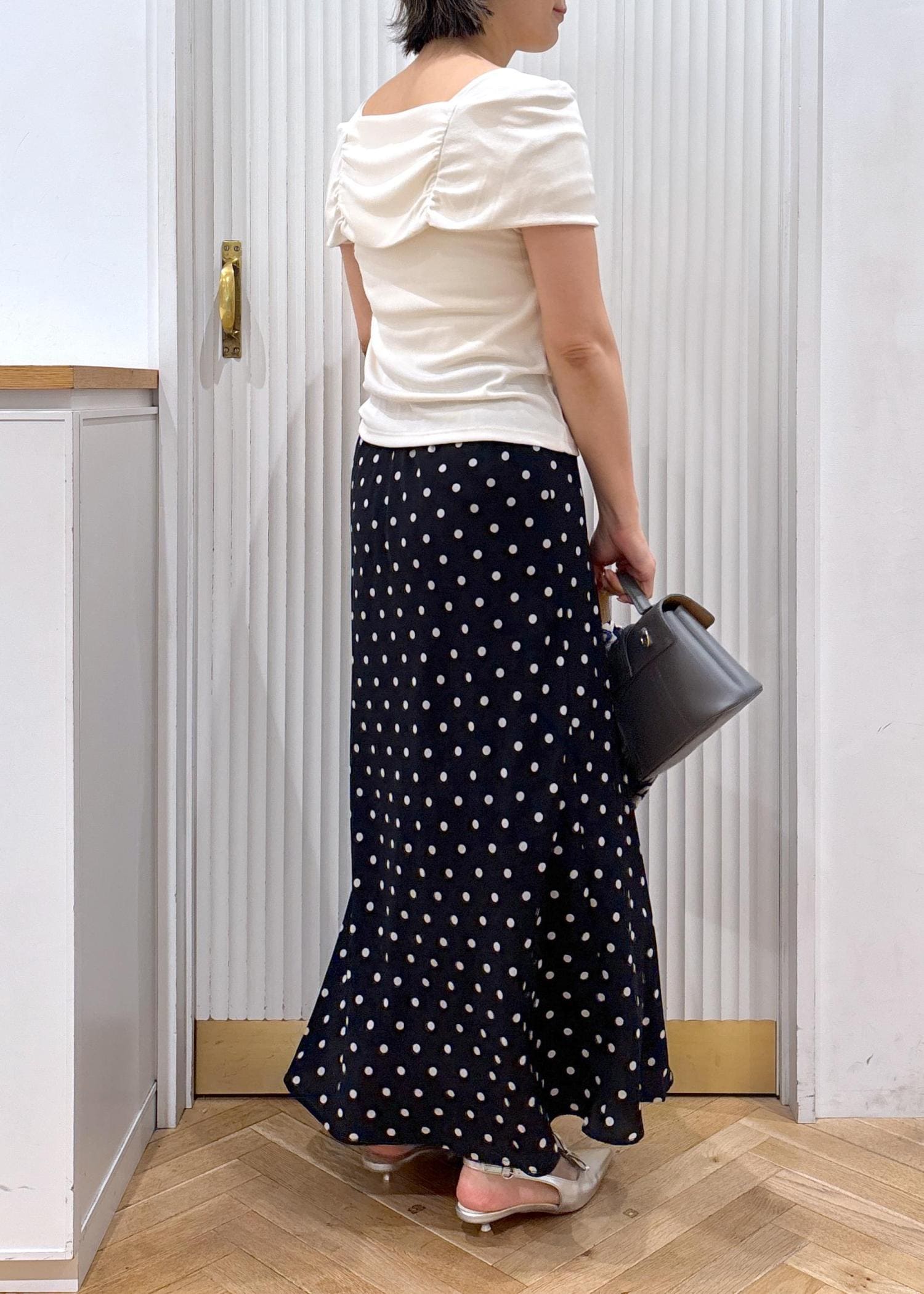 オフショルなのに肩がずり落ちない!洗えて、着映えて、しかもプチプラ♡ブラックもブラウンもめちゃくちゃ可愛いけど、まずはオフホワイトとドットのスカートで大人のモノトーンスタイリングです♫