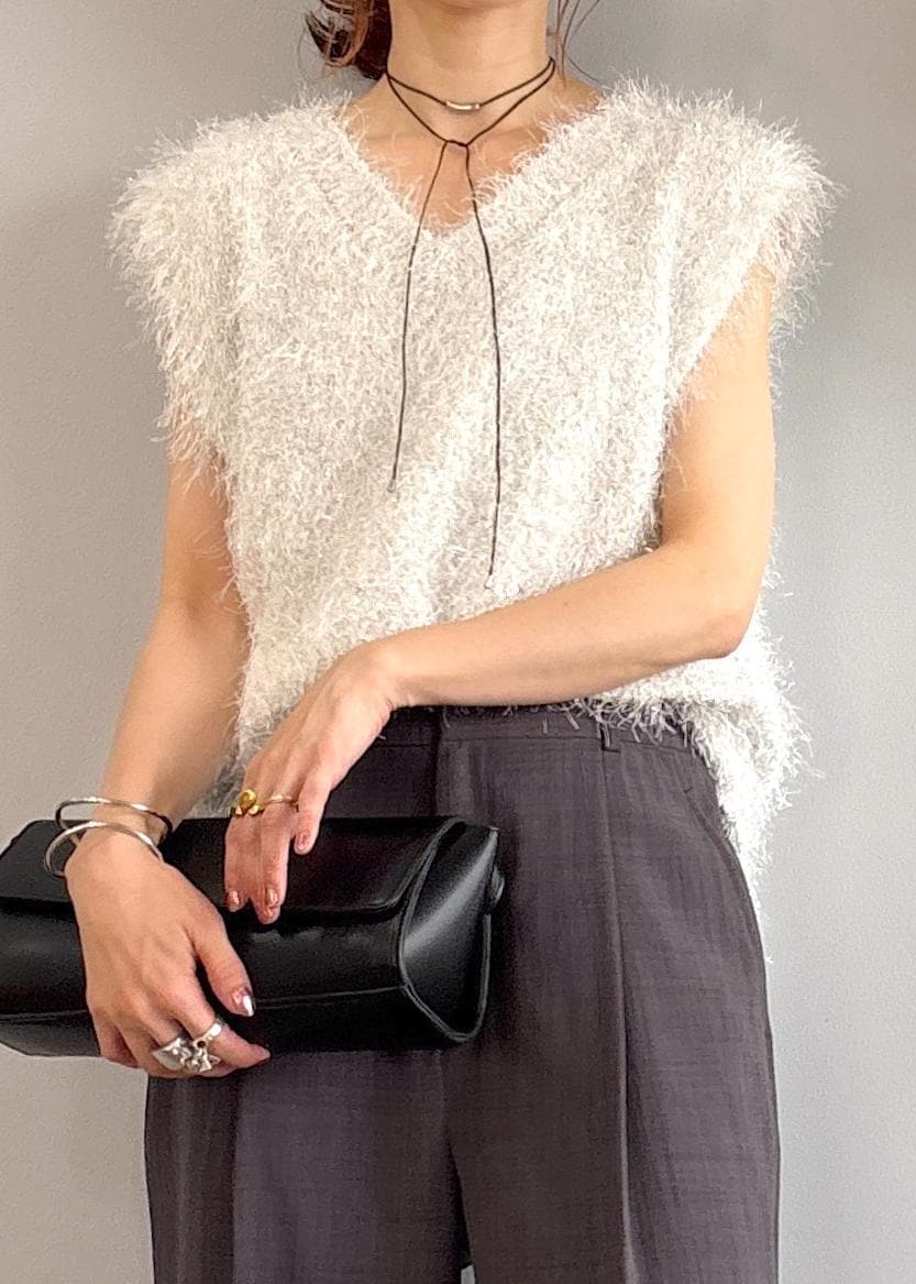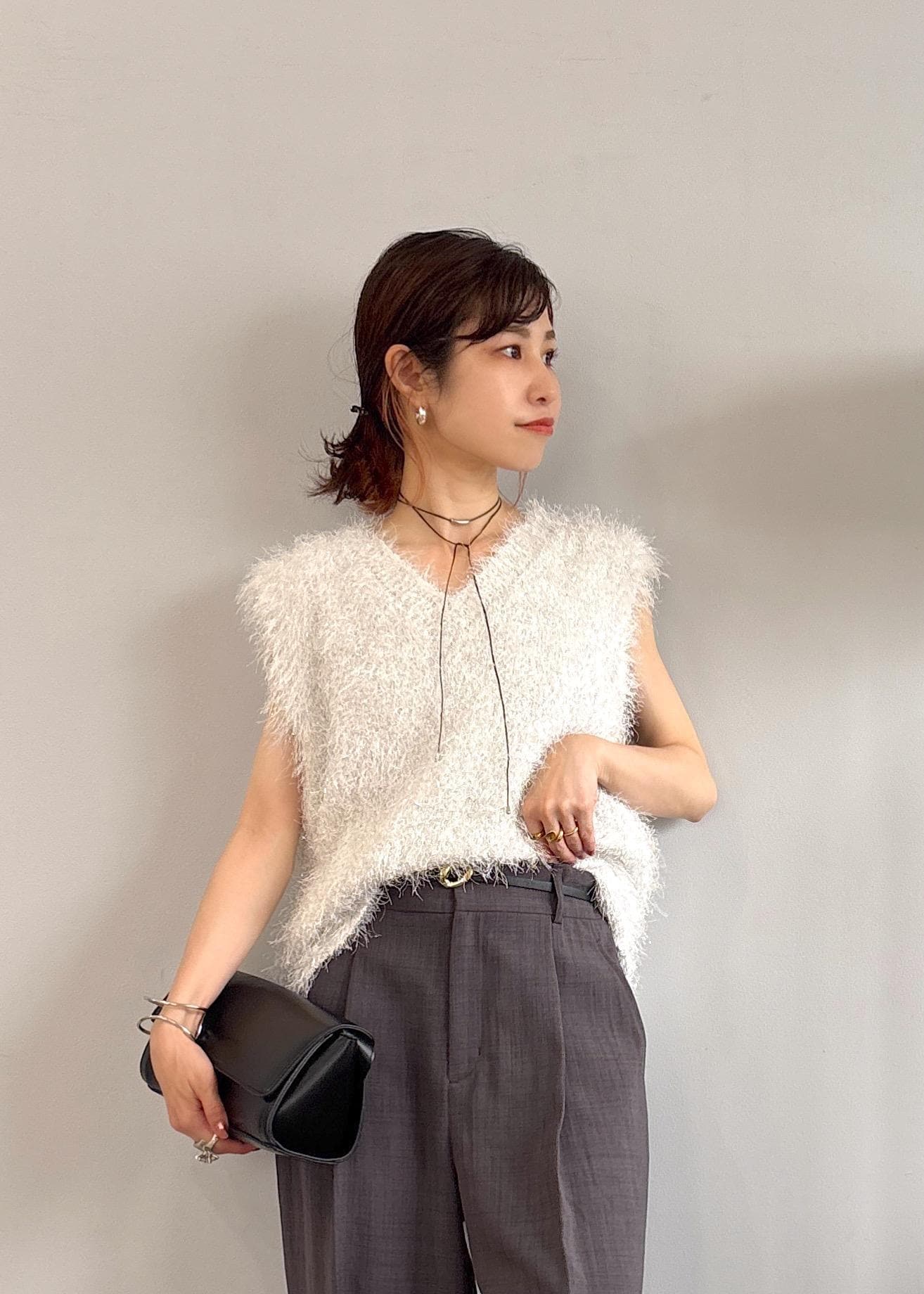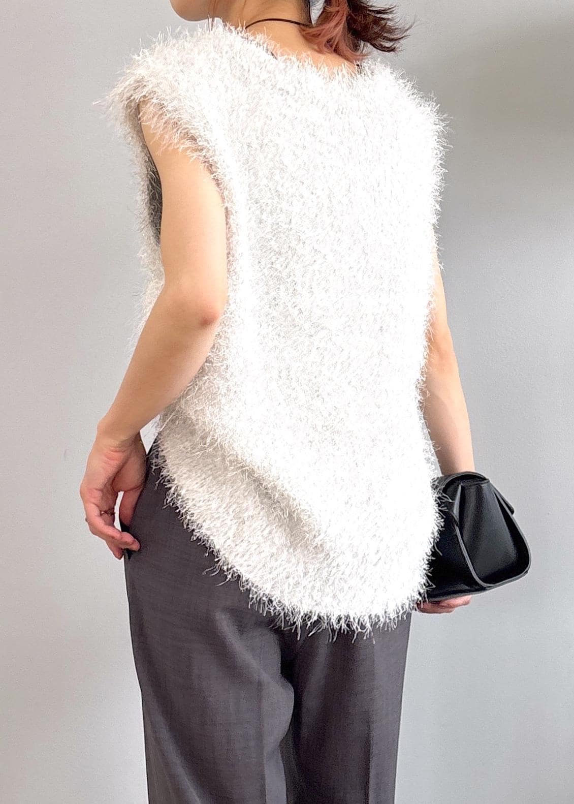 ふわふわ柔らかなファーベスト♪フェザーヤーンとラメ糸をミックスしているので、優しい印象で女性らしい一枚です。肌あたりは柔らかくチクチク感を感じにくかったです。程よいVネックが開きすぎず、スッキリ見えるのが嬉しい◎全体的にゆったりめ、着丈はお尻が隠れるくらいの長さでした。
