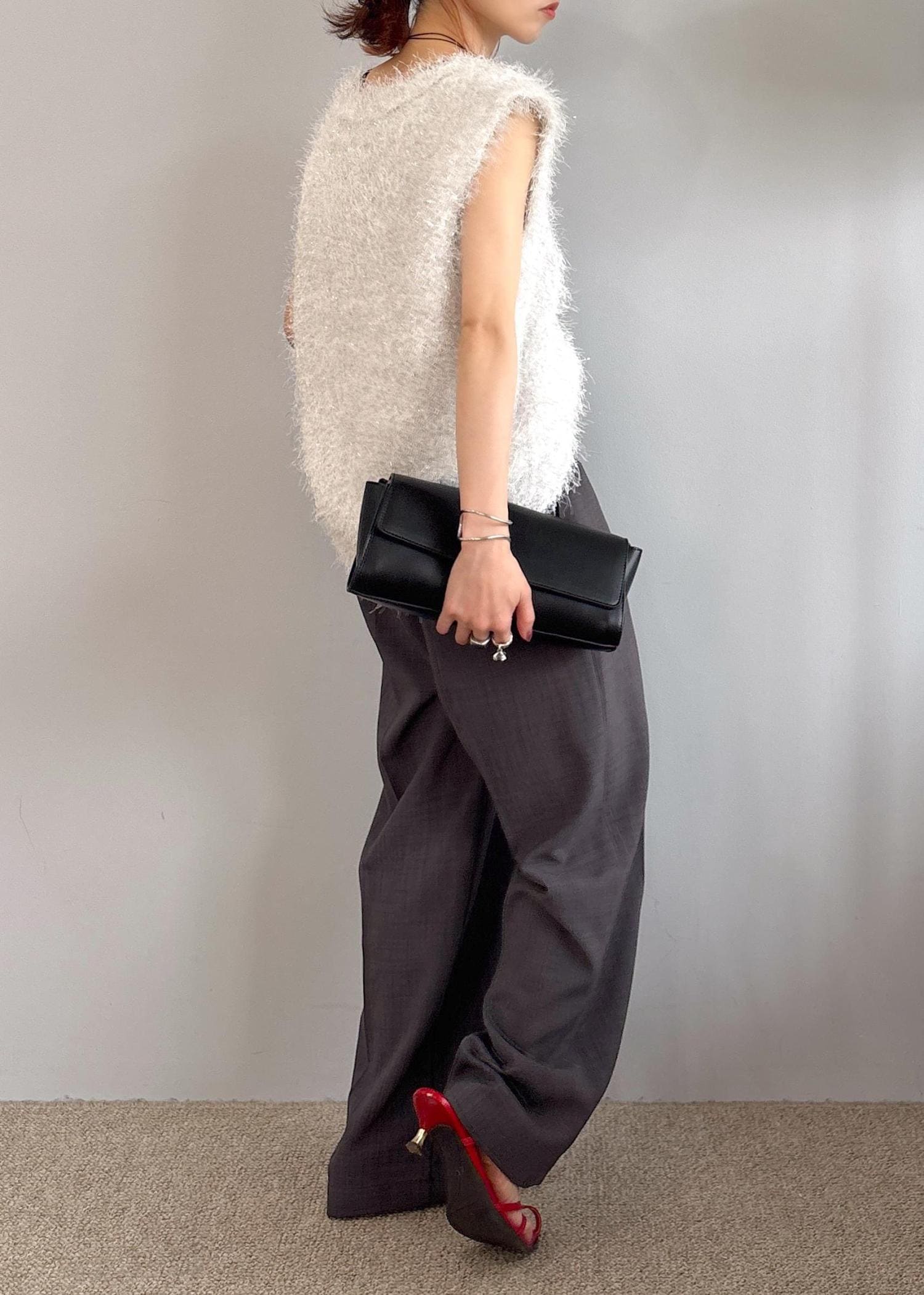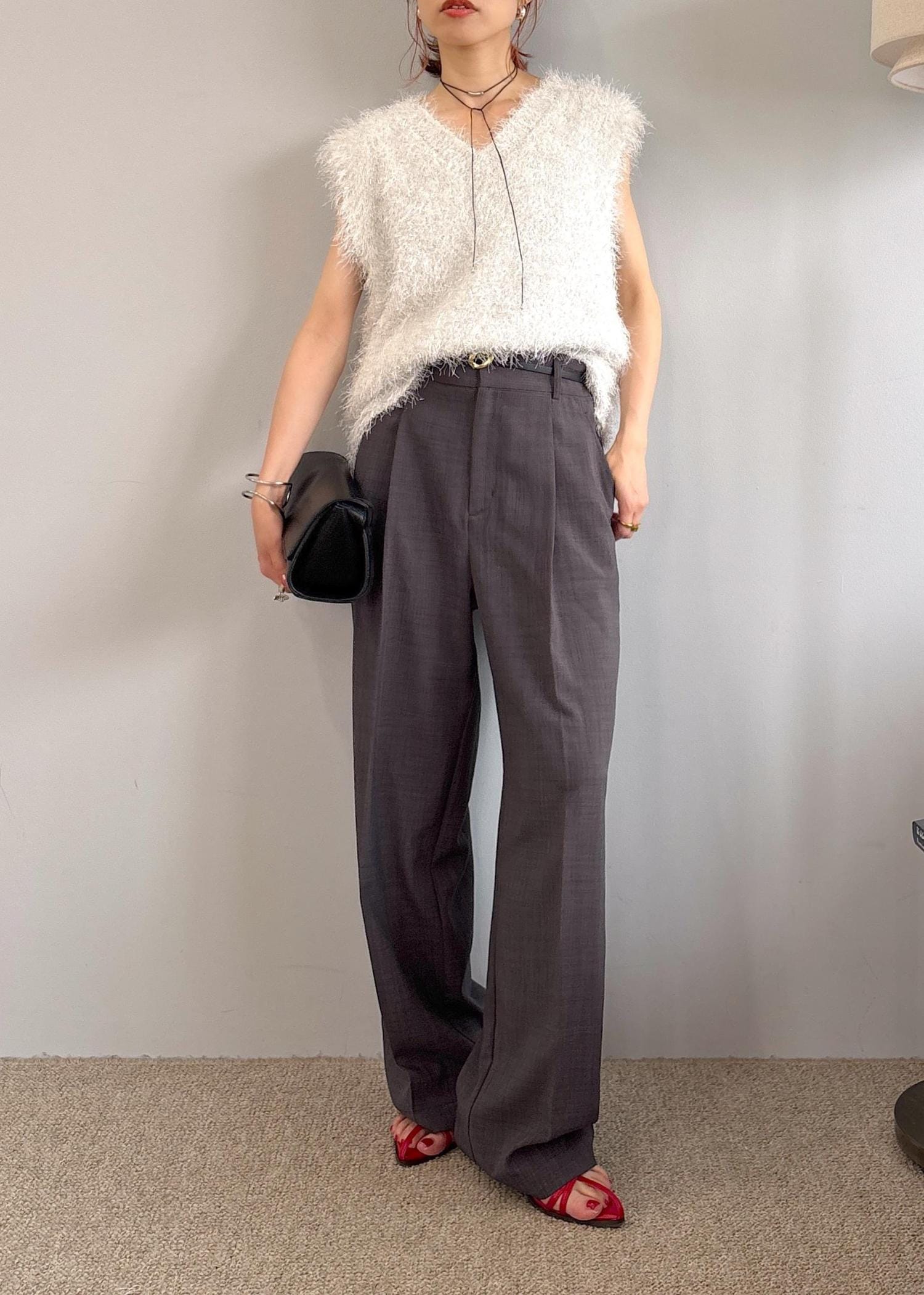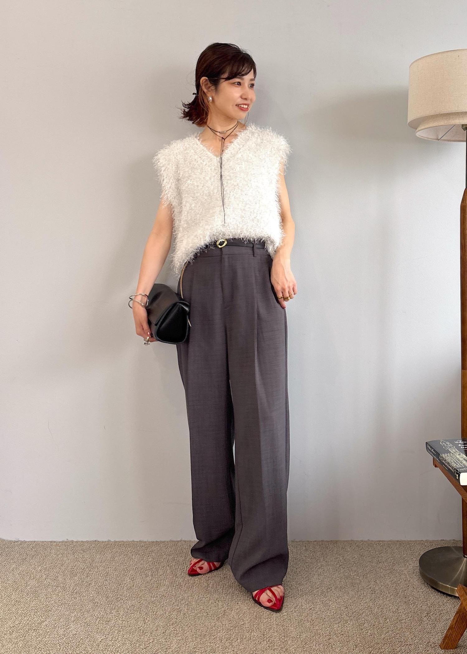 ふわふわのファーが柔らかな印象見えするトップスと落ち着いたグレーのパンツで合わせたシンプルスタイル♪ファートップスはラメ糸をミックスしているので、一枚で女性らしい印象に◎緩やかなWEB限定サイズは少し長めなので前をインしてバランス良く見えるように着ました。秋口はロンTなどのレイヤードで楽しんでも◎夏から秋まで着回せる大人カジュアルコーデ。