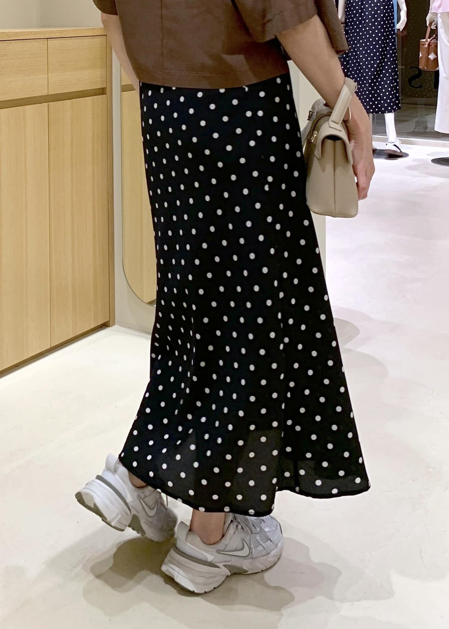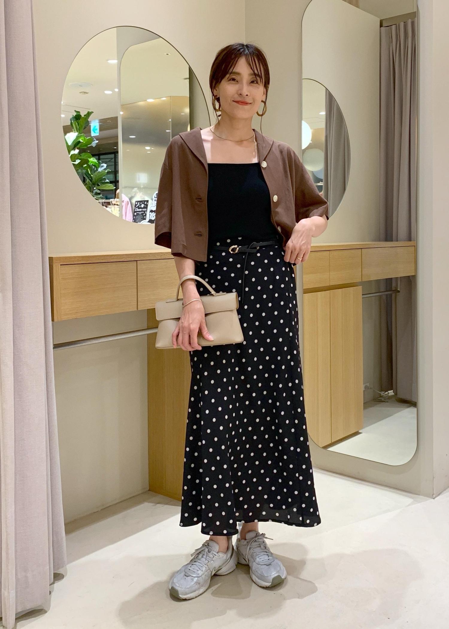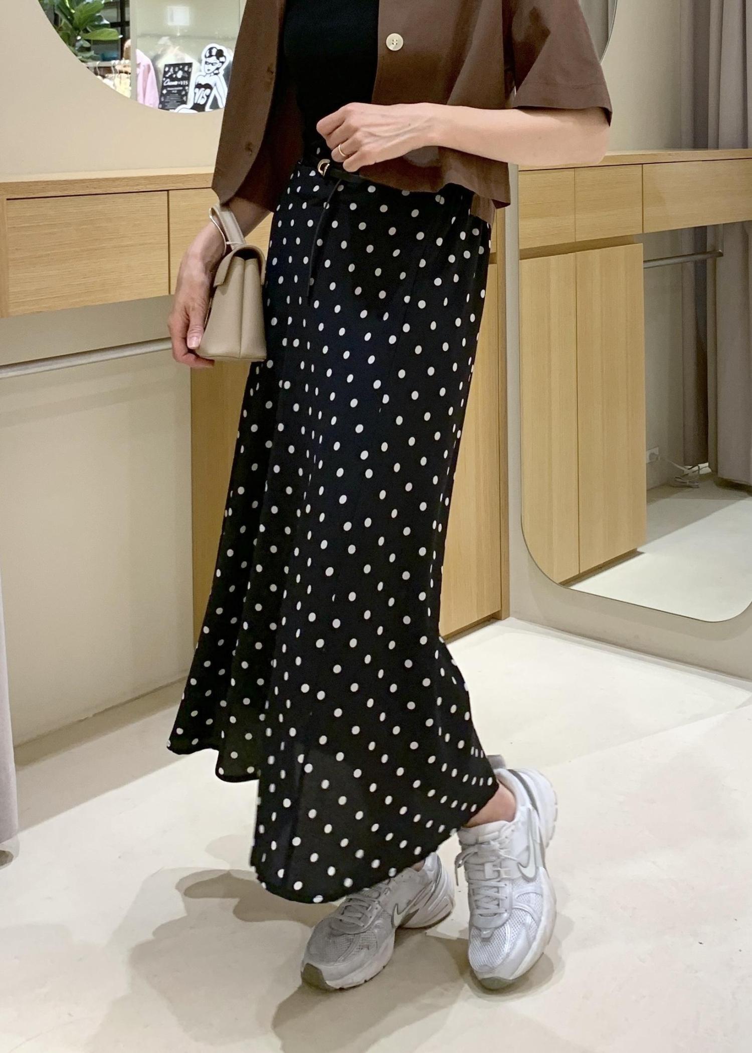 ドットのスカートは子供っぽくならないよう、インナーはブラックで大人っぽく、トップスも首元の抜け感を出しました。