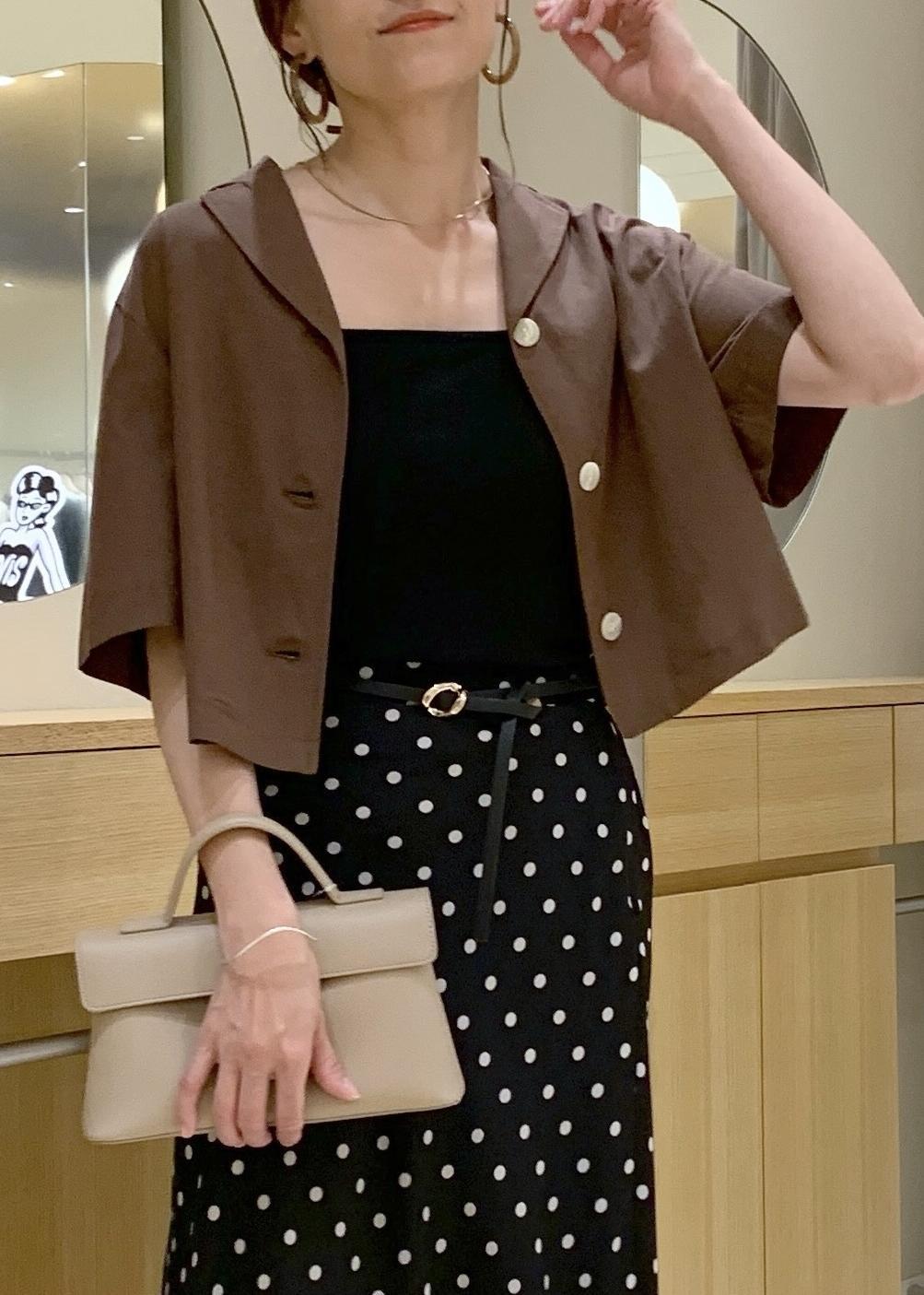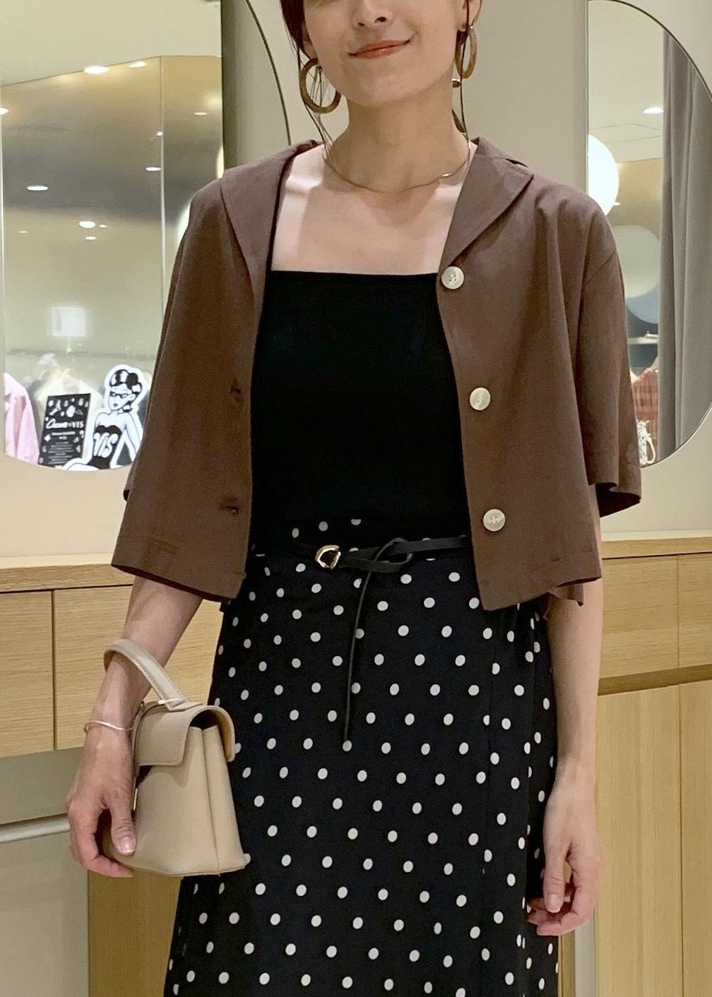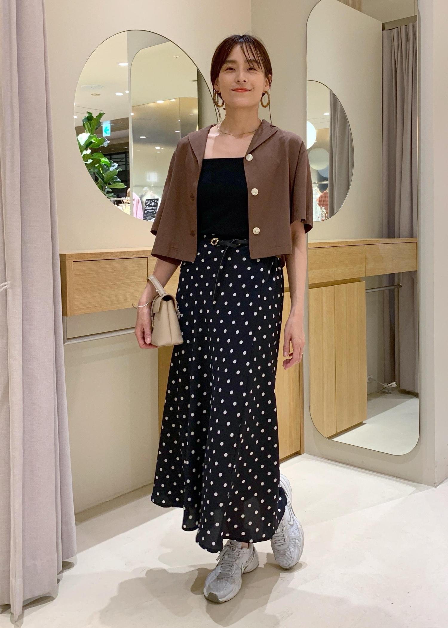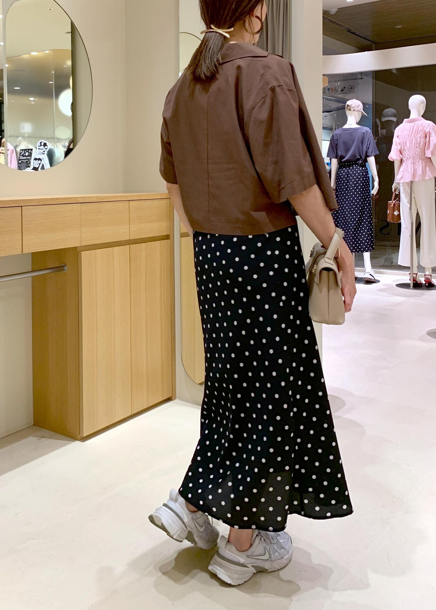 ドットのスカートは子供っぽくならないよう、インナーはブラックで大人っぽく、トップスも首元の抜け感を出しました。