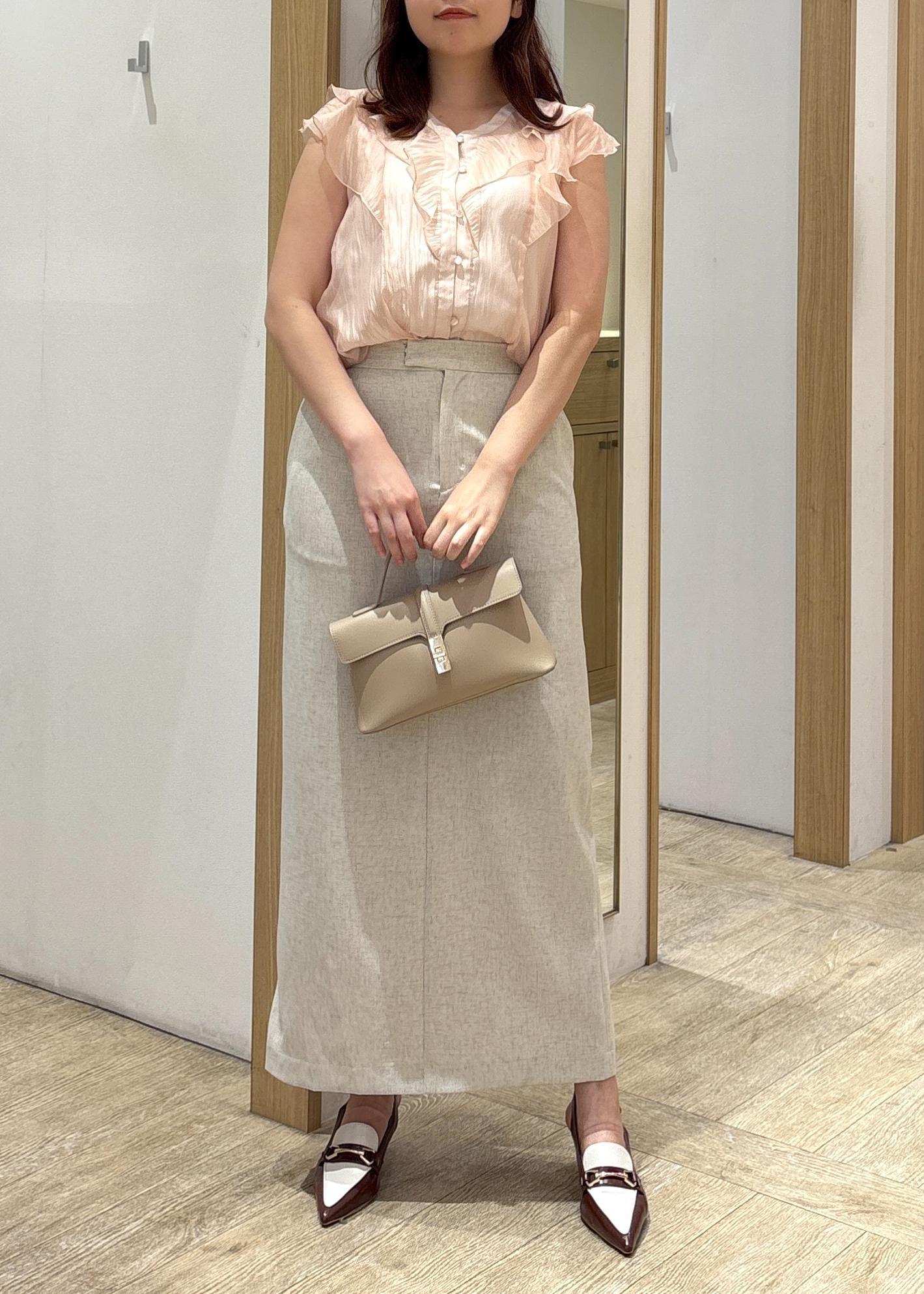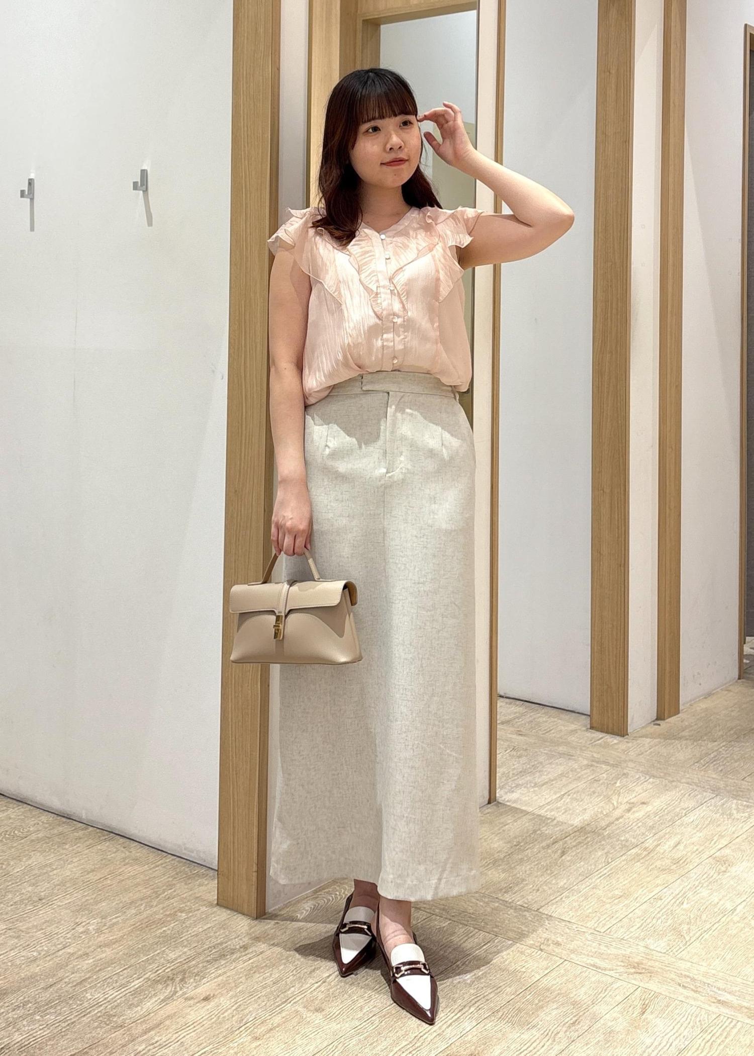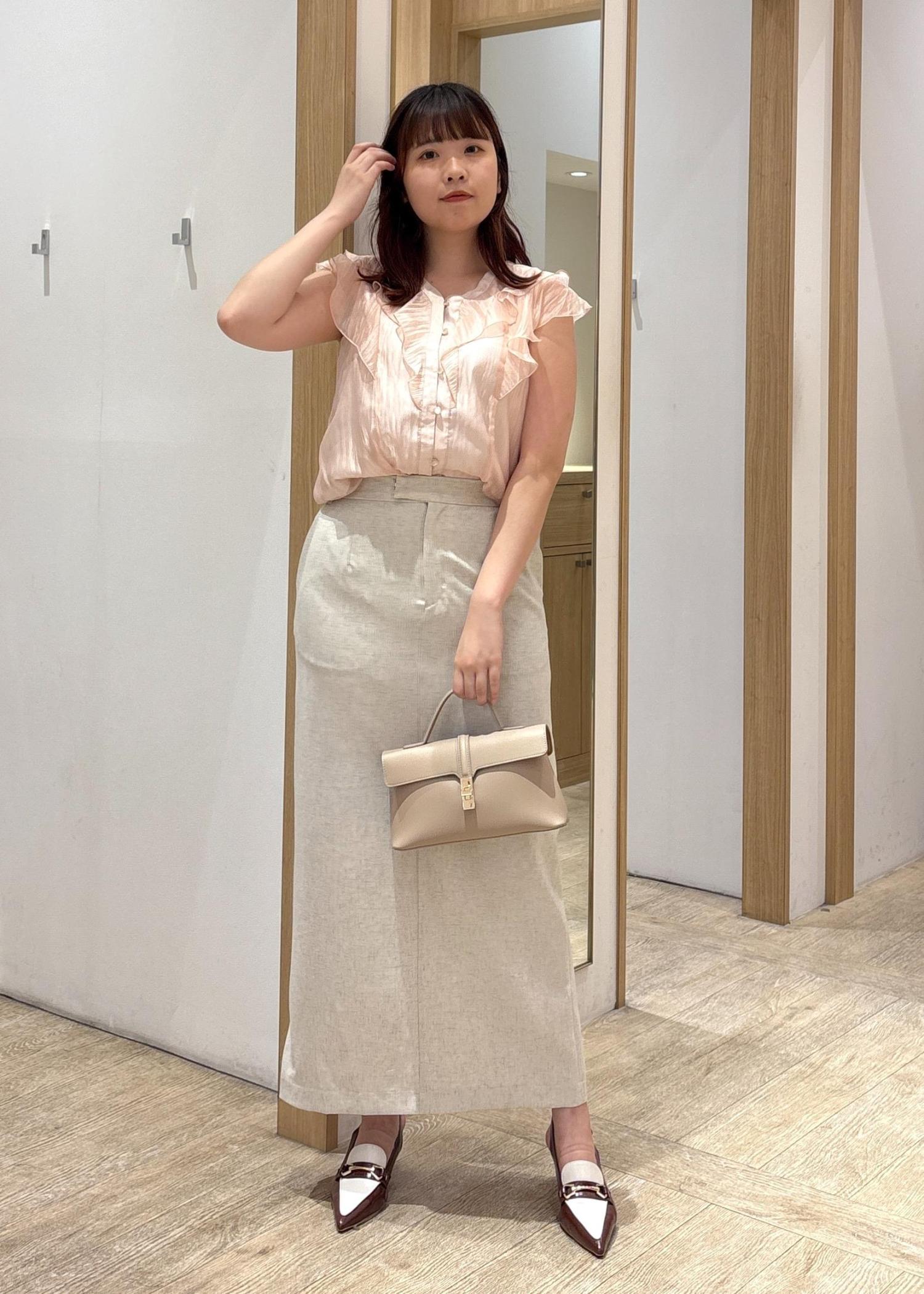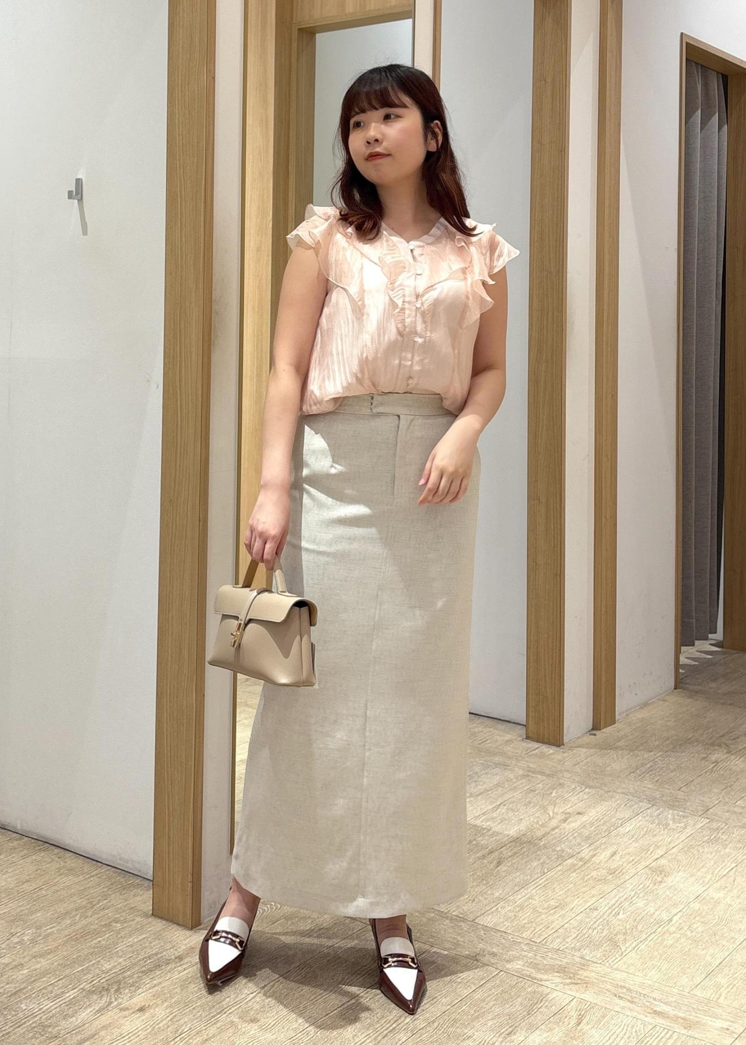 淡いピンクのフリルブラウスに、ライトグレーのロングスカートを合わせたフェミニンで上品なコーディネート。