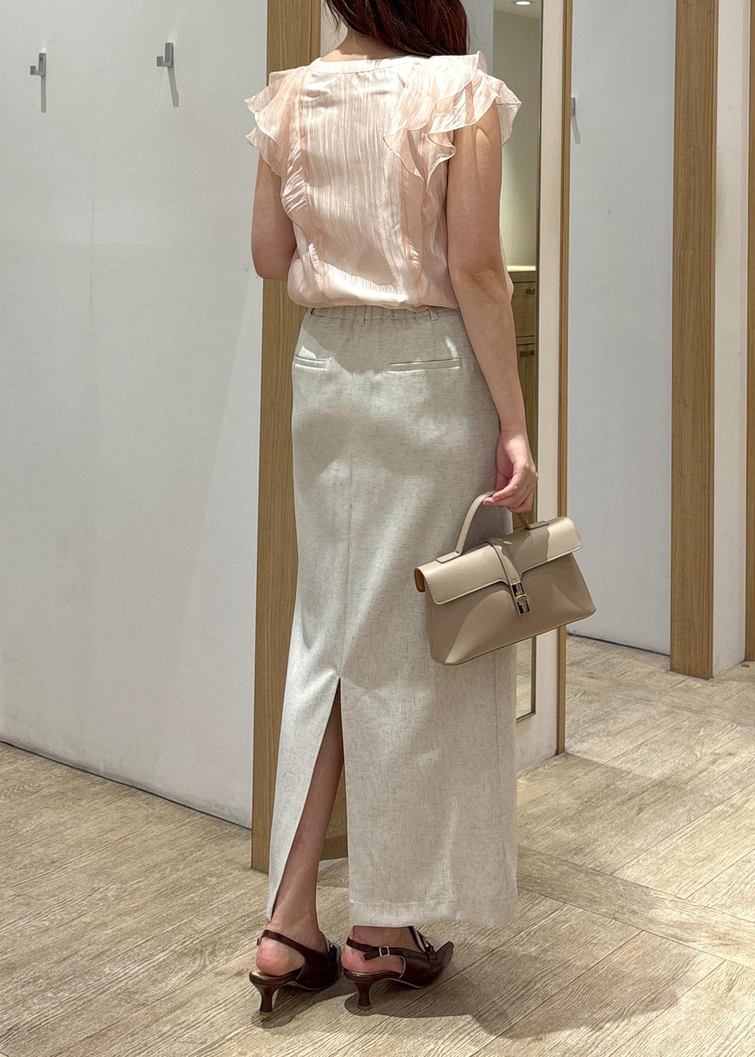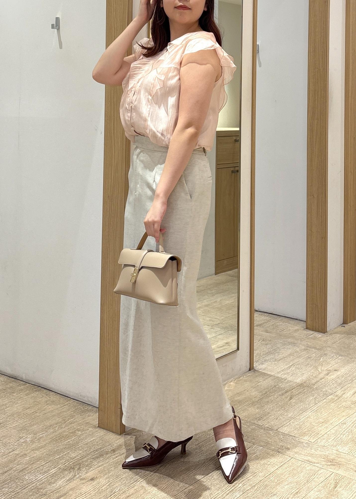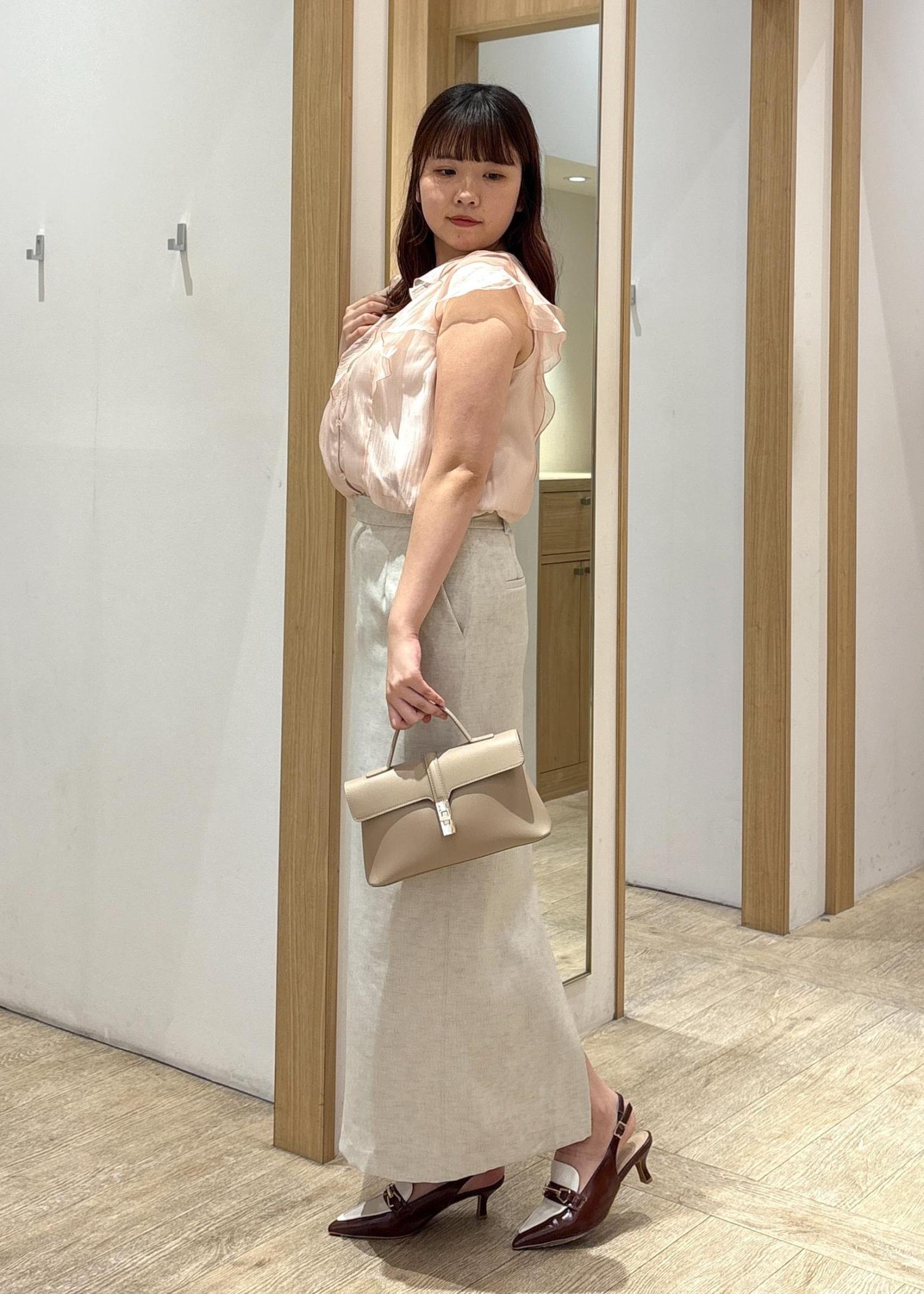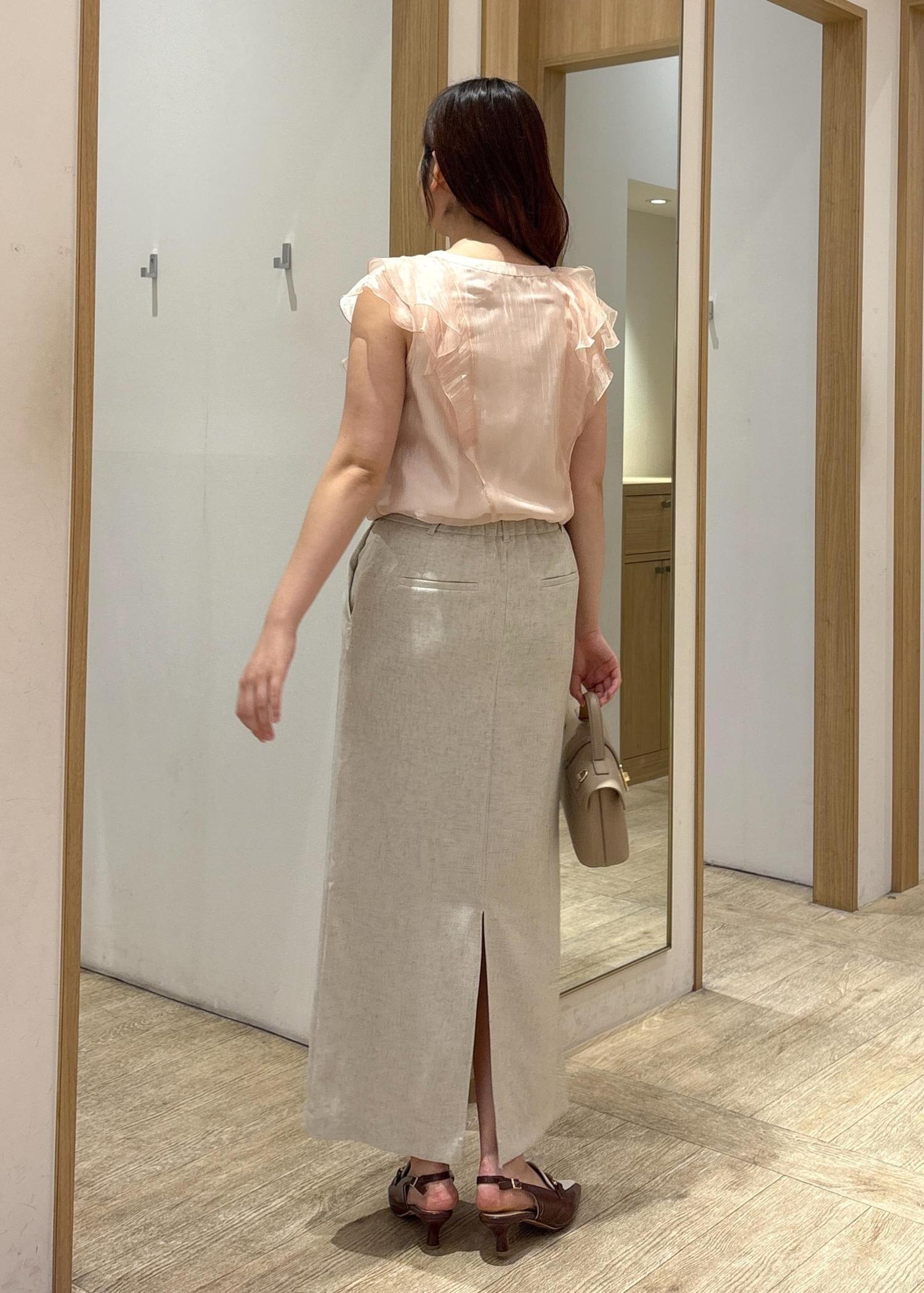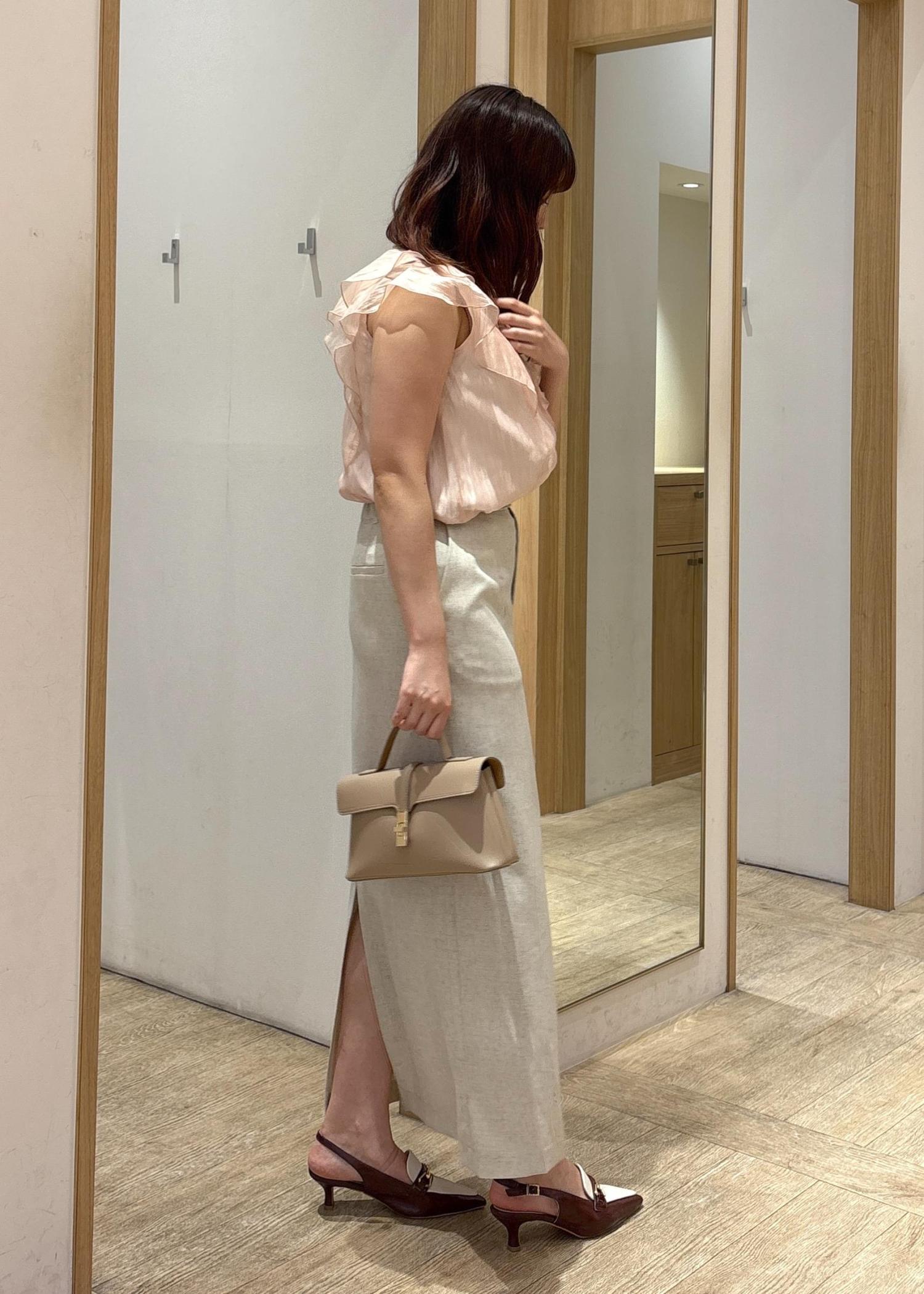 透け感のあるブラウスが軽やかさを演出し、落ち着いた色味のスカートで大人っぽく仕上げています。